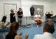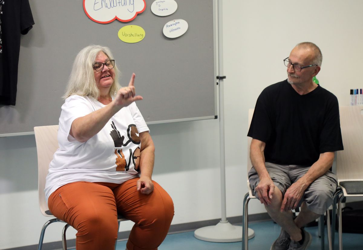 Während Walter gebärdet, ist ihr Gesicht ständig in Bewegung. „Körpersprache und Mimik sind die halbe Miete“, sagt sie. Gefühle wie Freude, Erstaunen oder Abneigung würden vor allem auch über das Gesicht ausgedrückt. Walter fordert dazu auf, aus sich herauszugehen: „Ohne Mimik sind wir für Gehörlose als Gesprächspartner langweilig. Versucht, Eure Gefühle auch mit dem Gesicht auszudrücken.“ Von der Theorie in die Praxis geht es mit Margit und Oswald Friedrich. Margit Friedrich war insgesamt 21 Jahre Vorsitzende des Gehörlosenvereins Schweinfurt und ist ehrenamtliche Hospizbegleiterin. Ihr Mann Oswald gibt Kurse in Deutscher Gebärdensprache (DGS) in Schweinfurt, Hammelburg und Bad Kissingen. Ich kann noch keine Gebärdensprache? Für die beiden kein Problem. Wie könnte man zum Beispiel sagen, dass man fährt? Sofort werden imaginäre Lenkräder gedreht, mit den Händen Fahrräder imitiert.