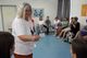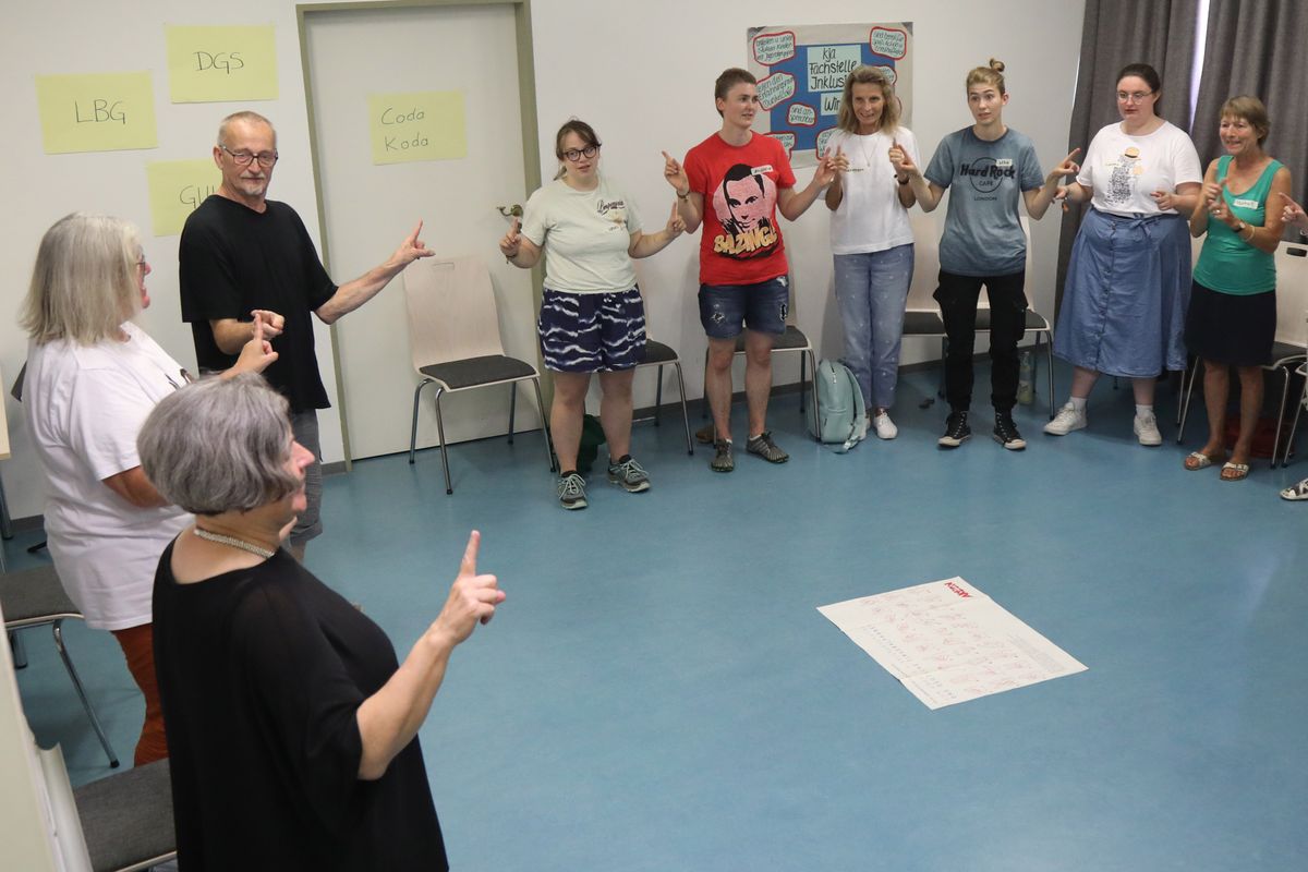 Die erste Erfahrung: Wenn Walter gebärdet, sieht es schwebend leicht aus. Wenn man zum ersten Mal selbst gebärdet, ist es schmerzhafte Fingerakrobatik. Für das „K“ etwa werden kleiner und Ringfinger gebeugt, Mittel- und Zeigefinger wie ein V nach oben gestreckt und der Daumen an den Mittelfinger gelegt. Alles gleichzeitig. Für das „R“ legt Robert den Daumen über den Ringfinger und schiebt den Zeige- unter den Mittelfinger. „Es lohnt sich, das Fingeralphabet zu lernen“, ermutigt Walter. Es sei international einheitlich und man könne damit beispielsweise Namen und Orte buchstabieren. Die Gruppe ist bunt gemischt: Die Frauen und Männer kommen aus der Jugendarbeit oder vom Roten Kreuz, arbeiten in Seniorenheimen oder Behinderteneinrichtungen. Eine Hörgeräteakustikerin ist auch darunter. „Die Sprache fasziniert mich schon lange“, sagt eine junge Frau. Einige haben sich schon mit dem Fingeralphabet befasst. „Ich fand die Erfahrung cool und nützlich für mich“, sagt jemand.