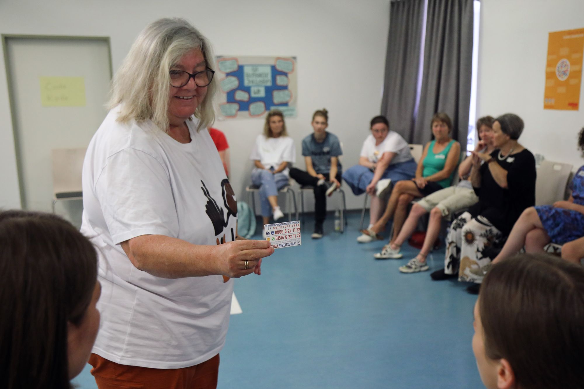 In der Fragerunde erzählen Margit und Oswald Friedrich bereitwillig aus ihrem Alltag. Sie nutzen zum Beispiel Lichtklingeln und Lichtwecker, für Notfälle gebe es spezielle Apps, und für die Kommunikation mit Hörenden böten verschiedene Dienste Simultandolmetschen an. Und sie geben Tipps für die Begegnung mit Gehörlosen. Man sollte zum Beispiel einen halben Meter Abstand halten, damit das Gegenüber Mimik und Gestik gut sehen kann. Das Thema des Gesprächs klar benennen. Möglichst keinen Dialekt sprechen. Zum Abschluss singen alle gemeinsam: „Meine Hoffnung, meine Freude, meine Stärke, mein Licht…“ Bei „Licht“ heben alle die geschlossene rechte Hand neben dem Kopf in die Höhe und öffnen dann die Finger – es sieht aus wie Sonnenstrahlen. Margit und Oswald Friedrich heben die Hände und drehen sie schnell vor und zurück. In Gebärdensprache heißt das: Applaus.