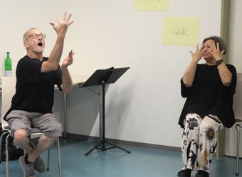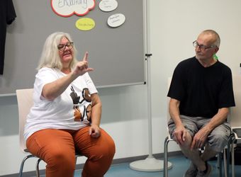 Was die Gruppe noch lernt: Deutsche Gebärdensprache ist erst seit 2002 offiziell als eigene Sprache anerkannt. Es gibt weltweit mehr als 200 Sprachen und auch Dialekte. Die Satzstellung weicht vom Deutschen ab: Subjekt – Objekt – Verb. DGS ist dreidimensional – um Begriffe wie „gestern“ oder „morgen“ zu gebärden, verwendet man eine imaginäre Zeitschiene rechts vom Körper. Man kann nur rund 30 Prozent eines Gesprächs vom Mund absehen – „Mutter“ und „Butter“ etwa sehen genau gleich aus. Es braucht enorme Konzentration, um Handbewegungen und Gesicht gleichzeitig im Auge zu behalten, vor allem, wenn alle gleichzeitig gebärden. „Der Alltag ist sehr anstrengend“, sagt Walter. Oswald Friedrich zeigt, wie man den Redefluss stoppen kann: Er legt beide Zeigefinger waagrecht aneinander und lässt den rechten abrupt herunterfallen. „Das bedeutet: Ich habe den Faden verloren.“