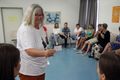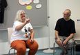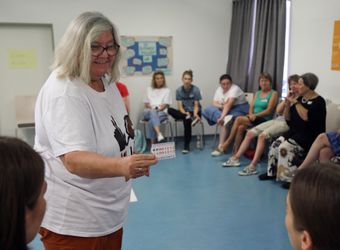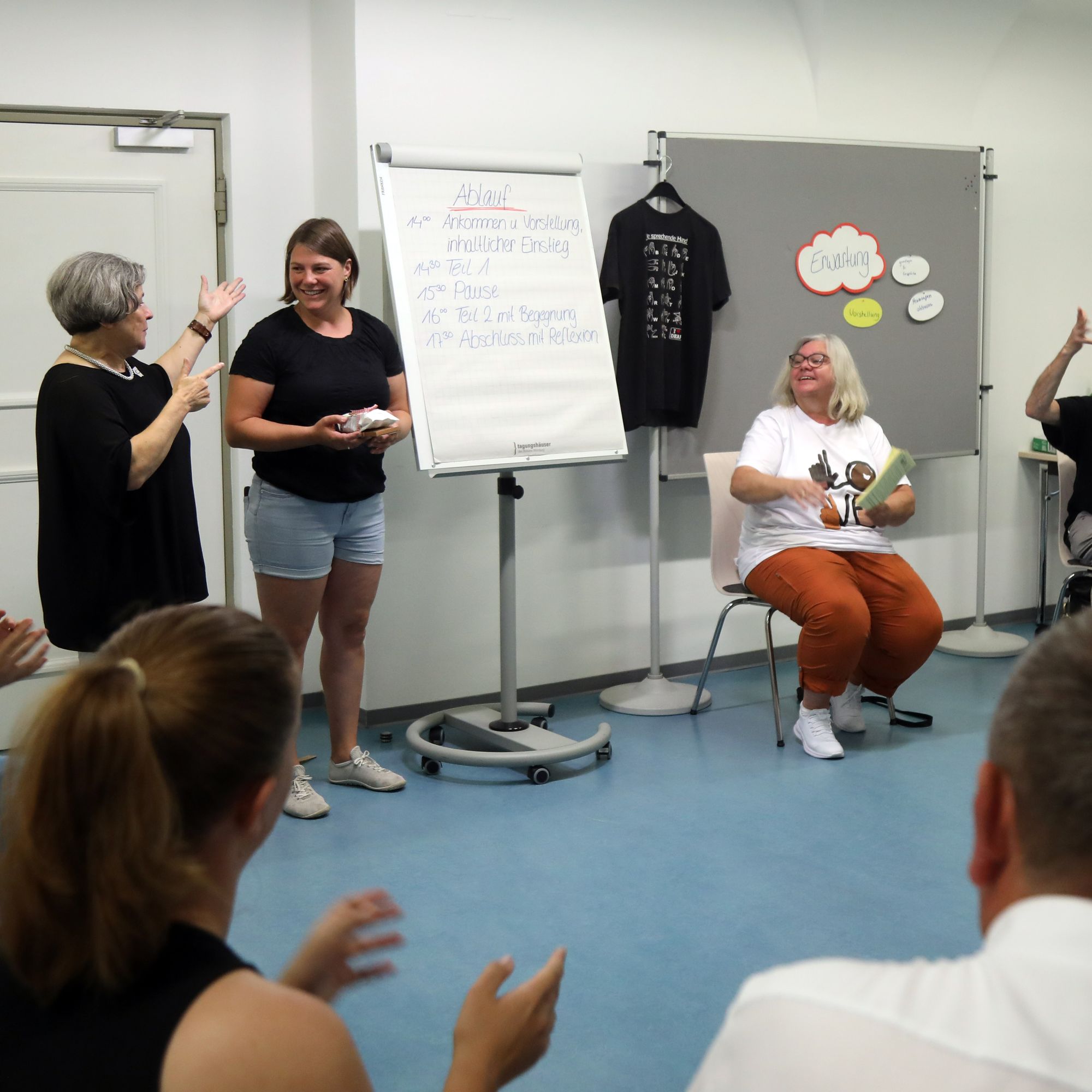 Während Walter gebärdet, ist ihr Gesicht ständig in Bewegung. „Körpersprache und Mimik sind die halbe Miete“, sagt sie. Gefühle wie Freude, Erstaunen oder Abneigung würden vor allem auch über das Gesicht ausgedrückt. Walter fordert dazu auf, aus sich herauszugehen: „Ohne Mimik sind wir für Gehörlose als Gesprächspartner langweilig. Versucht, Eure Gefühle auch mit dem Gesicht auszudrücken.“ Von der Theorie in die Praxis geht es mit Margit und Oswald Friedrich. Margit Friedrich war insgesamt 21 Jahre Vorsitzende des Gehörlosenvereins Schweinfurt und ist ehrenamtliche Hospizbegleiterin. Ihr Mann Oswald gibt Kurse in Deutscher Gebärdensprache (DGS) in Schweinfurt, Hammelburg und Bad Kissingen. Ich kann noch keine Gebärdensprache? Für die beiden kein Problem. Wie könnte man zum Beispiel sagen, dass man fährt? Sofort werden imaginäre Lenkräder gedreht, mit den Händen Fahrräder imitiert.
