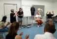 In der Fragerunde erzählen Margit und Oswald Friedrich bereitwillig aus ihrem Alltag. Sie nutzen zum Beispiel Lichtklingeln und Lichtwecker, für Notfälle gebe es spezielle Apps, und für die Kommunikation mit Hörenden böten verschiedene Dienste Simultandolmetschen an. Und sie geben Tipps für die Begegnung mit Gehörlosen. Man sollte zum Beispiel einen halben Meter Abstand halten, damit das Gegenüber Mimik und Gestik gut sehen kann. Das Thema des Gesprächs klar benennen. Möglichst keinen Dialekt sprechen. Zum Abschluss singen alle gemeinsam: „Meine Hoffnung, meine Freude, meine Stärke, mein Licht…“ Bei „Licht“ heben alle die geschlossene rechte Hand neben dem Kopf in die Höhe und öffnen dann die Finger – es sieht aus wie Sonnenstrahlen. Margit und Oswald Friedrich heben die Hände und drehen sie schnell vor und zurück. In Gebärdensprache heißt das: Applaus.