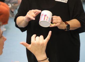 Dann zeigen sie die Gebärdennamen verschiedener Politiker und lassen die Gruppe raten, wer gemeint ist. Die Hand wie eine Tolle vor der Stirn, mürrischer Ausdruck, verkniffene Augen? „Trump!“, kommt es sofort. Ex-Bundeskanzlerin Angela Merkel hat gleich mehrere Namen: eine waagrecht am Kinn liegende Hand für die anfangs noch kinnlange Frisur, die Merkel-Raute sowie traurig herabgezogene Mundwinkel. „Es muss zur Person passen“, sagt Margit Friedrich. Im Alltag würden oft die Gebärdennamen verwendet. Um zu verstehen, wer mit „Doris mit den Lachgrübchen“ gemeint sei, müsse man aber viel über die jeweilige Person wissen, sagt Walter.