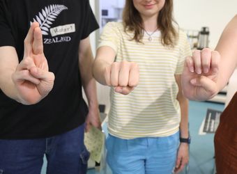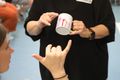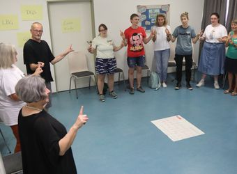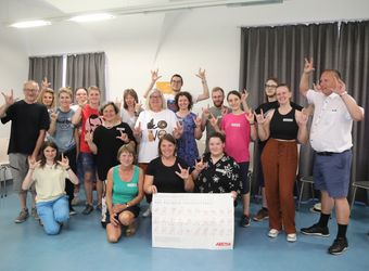 Die erste Erfahrung: Wenn Walter gebärdet, sieht es schwebend leicht aus. Wenn man zum ersten Mal selbst gebärdet, ist es schmerzhafte Fingerakrobatik. Für das „K“ etwa werden kleiner und Ringfinger gebeugt, Mittel- und Zeigefinger wie ein V nach oben gestreckt und der Daumen an den Mittelfinger gelegt. Alles gleichzeitig. Für das „R“ legt Robert den Daumen über den Ringfinger und schiebt den Zeige- unter den Mittelfinger. „Es lohnt sich, das Fingeralphabet zu lernen“, ermutigt Walter. Es sei international einheitlich und man könne damit beispielsweise Namen und Orte buchstabieren. Die Gruppe ist bunt gemischt: Die Frauen und Männer kommen aus der Jugendarbeit oder vom Roten Kreuz, arbeiten in Seniorenheimen oder Behinderteneinrichtungen. Eine Hörgeräteakustikerin ist auch darunter. „Die Sprache fasziniert mich schon lange“, sagt eine junge Frau. Einige haben sich schon mit dem Fingeralphabet befasst. „Ich fand die Erfahrung cool und nützlich für mich“, sagt jemand.