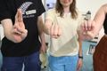 Würzburg (POW) „Mein“ – rechte Hand aufs Herz. „Name ist“ – zweimal mit der rechten Hand auf den linken Handrücken klopfen. „Und jetzt gebärdet Ihr den Anfangsbuchstaben Eures Namens.“ 17 Köpfe beugen sich über das große Plakat mit dem Fingeralphabet, das vor ihnen auf dem Boden liegt. „Erst einmal kräftig die Hände ausschütteln“, empfiehlt Claudia Walter, Hörgeschädigtenseelsorgerin der Diözese Würzburg. Mit Jasmin Endres, Referentin in der Diözesanen Fachstelle Inklusion der Kirchlichen Jugendarbeit (kja), sowie dem gehörlosen Ehepaar Margit und Oswald Friedrich aus Wasserlosen (Landkreis Schweinfurt) leitet sie den „Schnuppertag für Gebärdensprache“. Einen Nachmittag lang gibt es Einblicke in die Gebärdensprache sowie in die Kultur gehörloser Menschen. Die Idee sei aufgrund des Interesses der Katholischen jungen Gemeinde (KjG) und der Katholischen Landjugendbewegung (KLJB) entstanden und von der Fachstelle Inklusion umgesetzt worden, erklärt Endres. „Es ist ein Riesenfeld, und wir werden ein paar Mosaiksteinchen an Erfahrungen und Wissen sammeln“, sagt Walter. Sie habe vor 13 Jahren die Seelsorge für Gehörlose übernommen und damals auch die Gebärdensprache gelernt. „Die Gehörlosenkultur ist eine eigene Kultur. Die Begegnung mit gehörlosen Menschen bereichert mich und macht mich glücklich.“