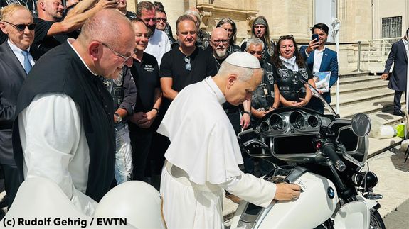 Auf dem Petersplatz glänzt die Maschine in der Sonne, als Papst Leo zunächst auf ihr unterschreibt und sich unter dem Jubel der „Jesus-Biker“ sogar kurz daraufsetzt. „Super, der Papst hat mir die Hand geschüttelt, er hat unser Motorrad unterzeichnet, er hat sich sogar draufgesetzt. Also richtig gelungen das Ganze“, freut sich Claus Dempewolf nach der Audienz.