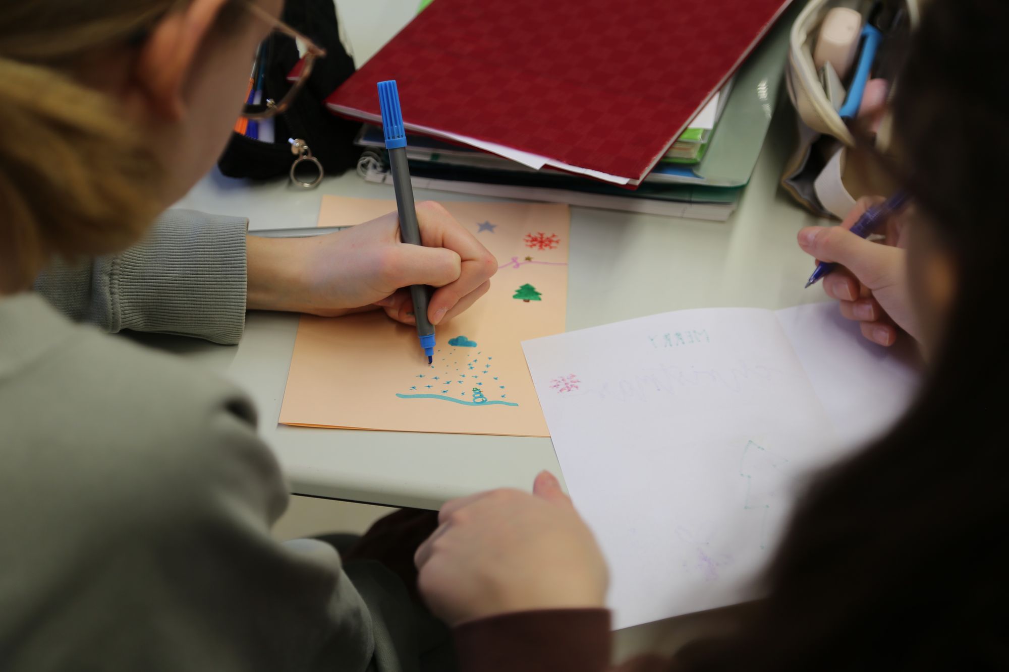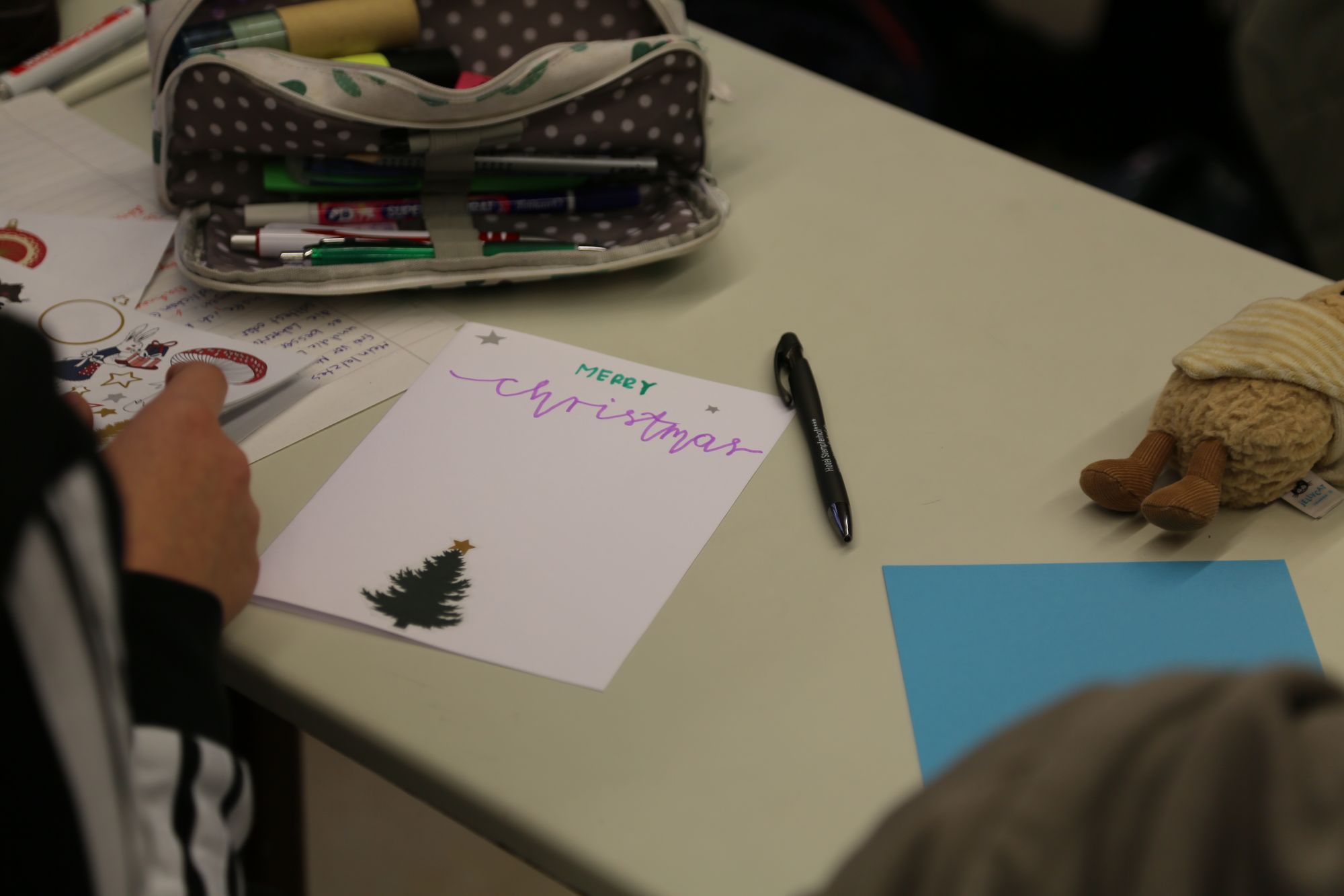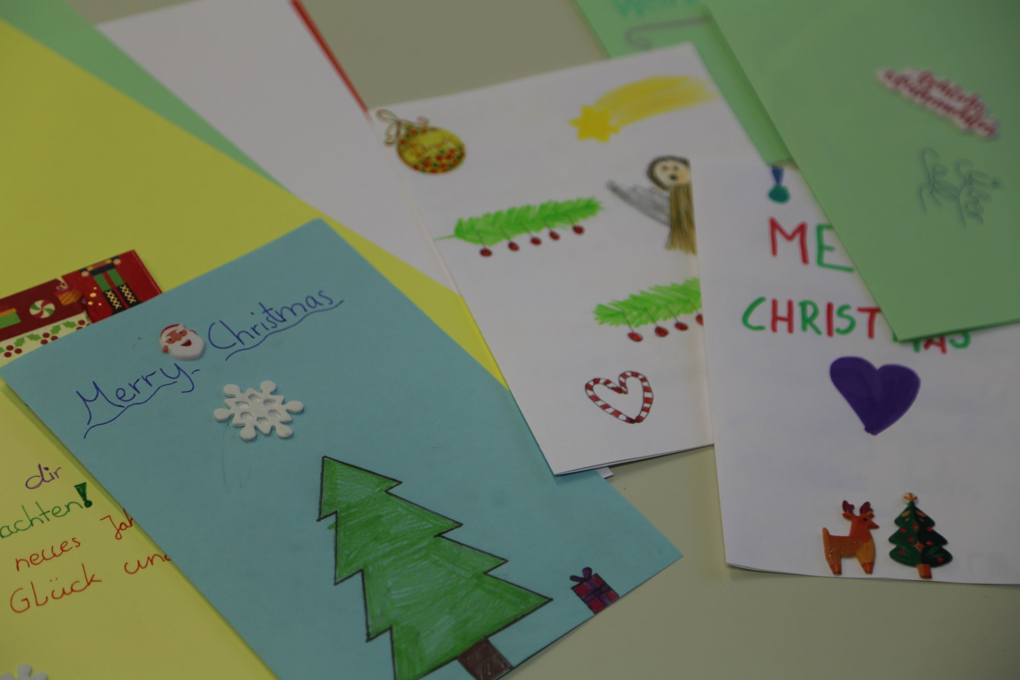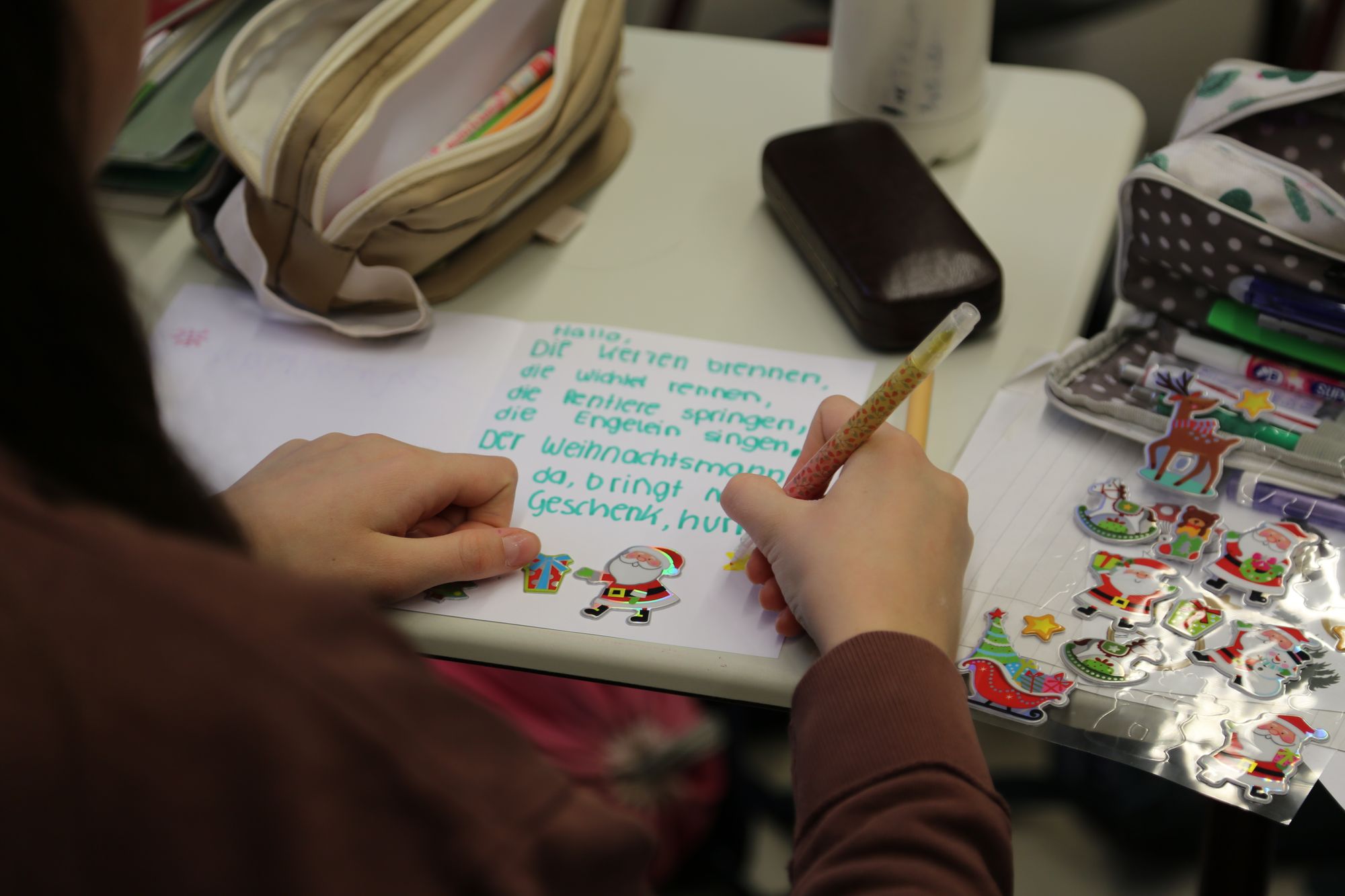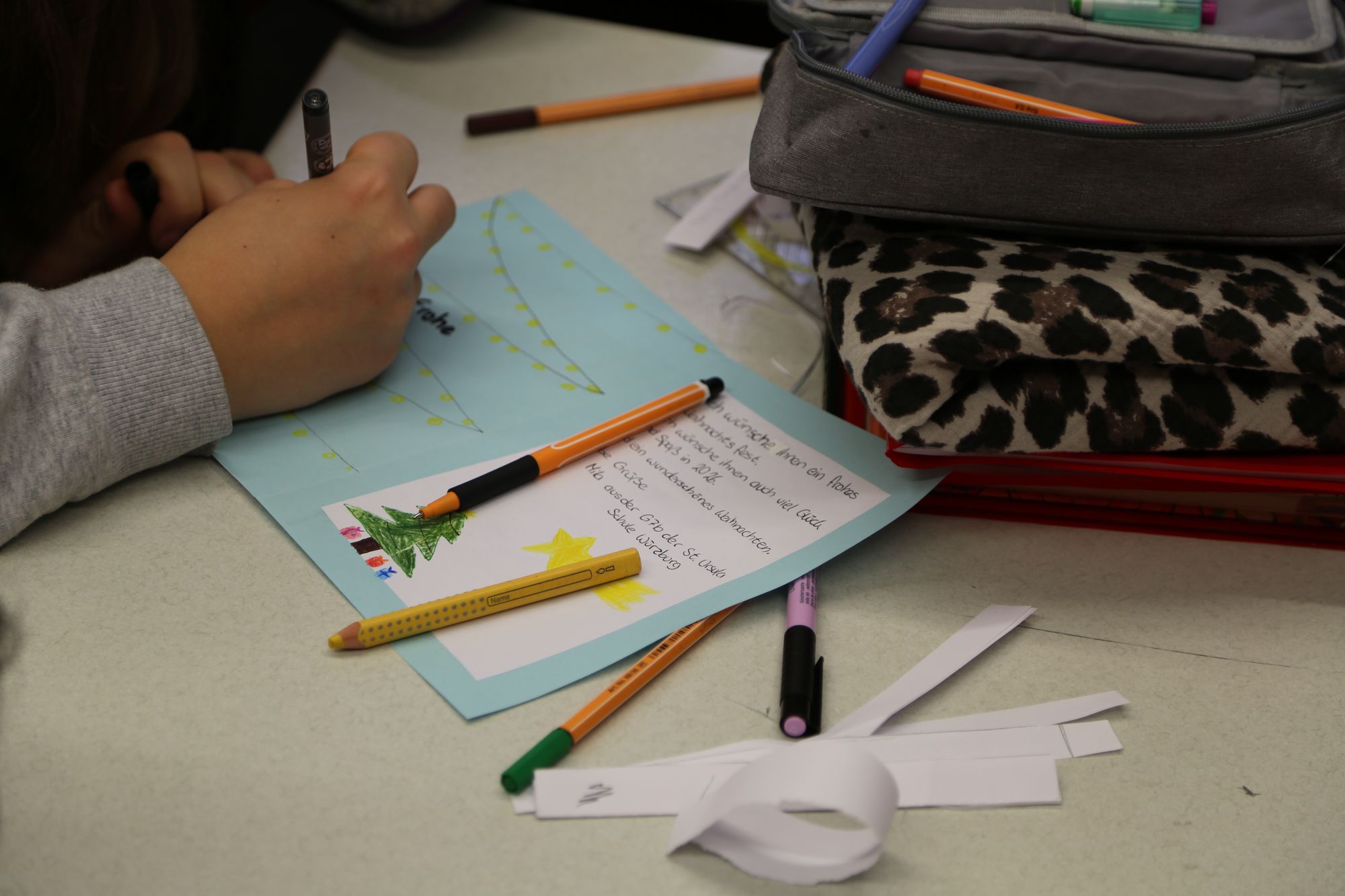 Nach anfänglichem Überlegen sind alle Schülerinnen in die Bearbeitung der Karten vertieft. An den Tischen werden Christbäume ausgeschnitten, Tannenzweige gemalt oder Gedichte geschrieben. Dabei ertönt Weihnachtsmusik aus einem Handy. Hier und da singt oder summt jemand mit. Jana hat einen Schneemann auf ihre Karte gemalt. Über dem lächelnden Schneemann schreibt sie ihre Weihnachtsgrüße auf die Karte. Sie finde es schön, bei der Aktion mitzumachen. „Es ist eine kleine Geste, mit der man relativ viel bewirken kann. Es dauert nicht lange, so eine Karte zu machen, und am Ende freut sich jemand darüber“, sagt sie. Ein paar Reihen weiter sitzt Frieda. Sie denke jetzt an Weihnachten schon mehr über Einsamkeit nach. Wenn sie selbst einsam wäre, „würde ich vielleicht eher eine E-Mail bekommen wollen, aber es macht auch Spaß, die Karten zu machen“. Luise ist fast mit ihrer Karte fertig. Sie findet es toll, dass jemand, der alleine ist, trotzdem Post bekommt, obwohl sie die Person gar nicht kennt. Sie sagt: „Es ist einfach eine schöne Geste, Menschen, die einsam sind, zu sagen: Hey, du bist nicht alleine!“