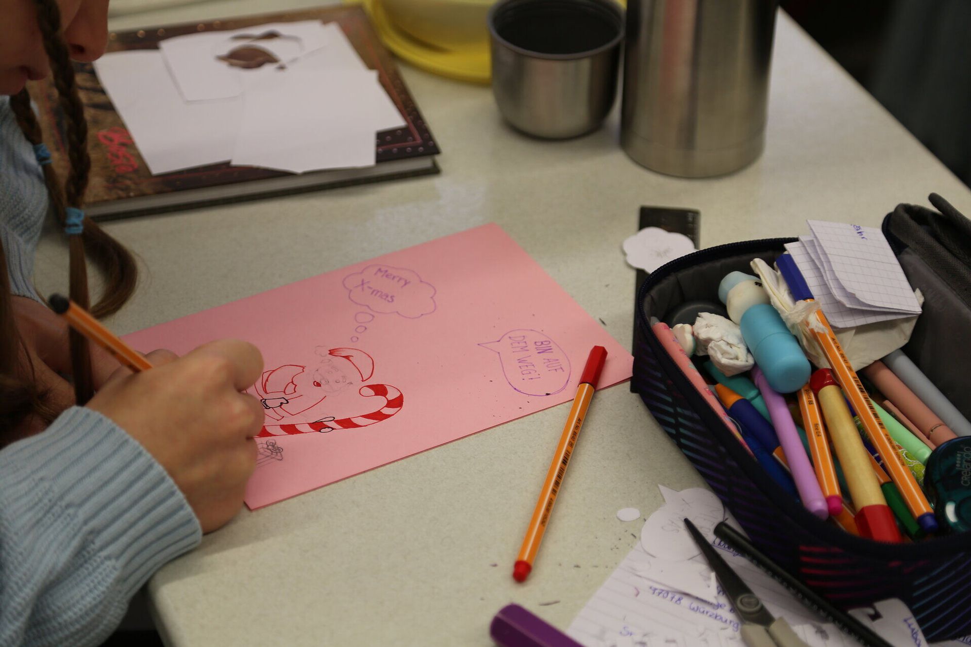 Nach anfänglichem Überlegen sind alle Schülerinnen in die Bearbeitung der Karten vertieft. An den Tischen werden Christbäume ausgeschnitten, Tannenzweige gemalt oder Gedichte geschrieben. Dabei ertönt Weihnachtsmusik aus einem Handy. Hier und da singt oder summt jemand mit. Jana hat einen Schneemann auf ihre Karte gemalt. Über dem lächelnden Schneemann schreibt sie ihre Weihnachtsgrüße auf die Karte. Sie finde es schön, bei der Aktion mitzumachen. „Es ist eine kleine Geste, mit der man relativ viel bewirken kann. Es dauert nicht lange, so eine Karte zu machen, und am Ende freut sich jemand darüber“, sagt sie. Ein paar Reihen weiter sitzt Frieda. Sie denke jetzt an Weihnachten schon mehr über Einsamkeit nach. Wenn sie selbst einsam wäre, „würde ich vielleicht eher eine E-Mail bekommen wollen, aber es macht auch Spaß, die Karten zu machen“. Luise ist fast mit ihrer Karte fertig. Sie findet es toll, dass jemand, der alleine ist, trotzdem Post bekommt, obwohl sie die Person gar nicht kennt. Sie sagt: „Es ist einfach eine schöne Geste, Menschen, die einsam sind, zu sagen: Hey, du bist nicht alleine!“