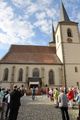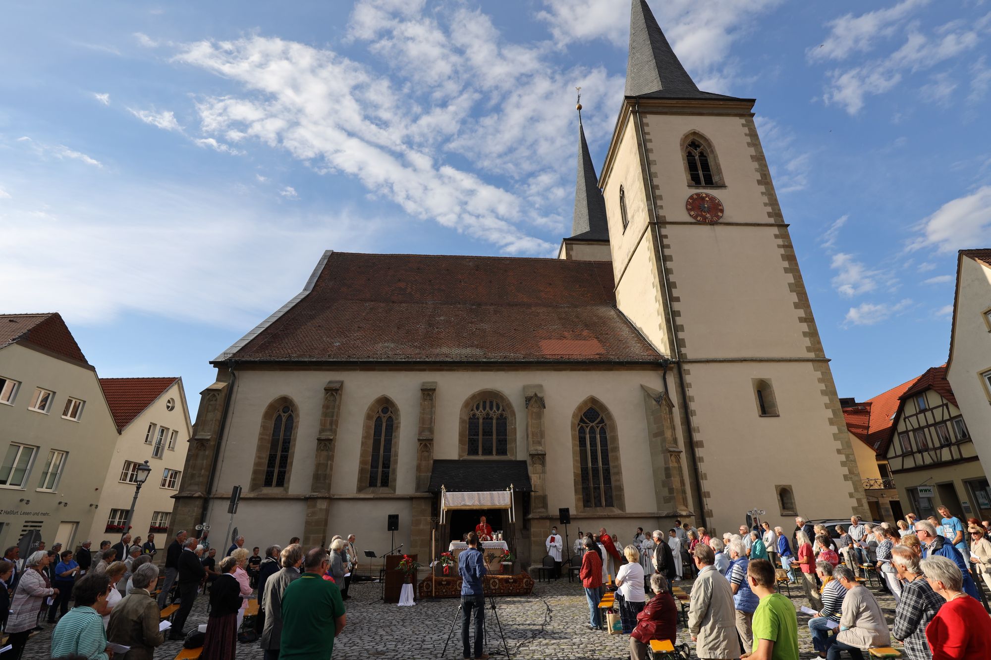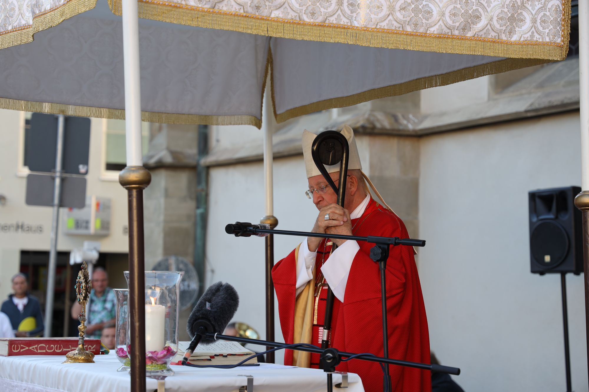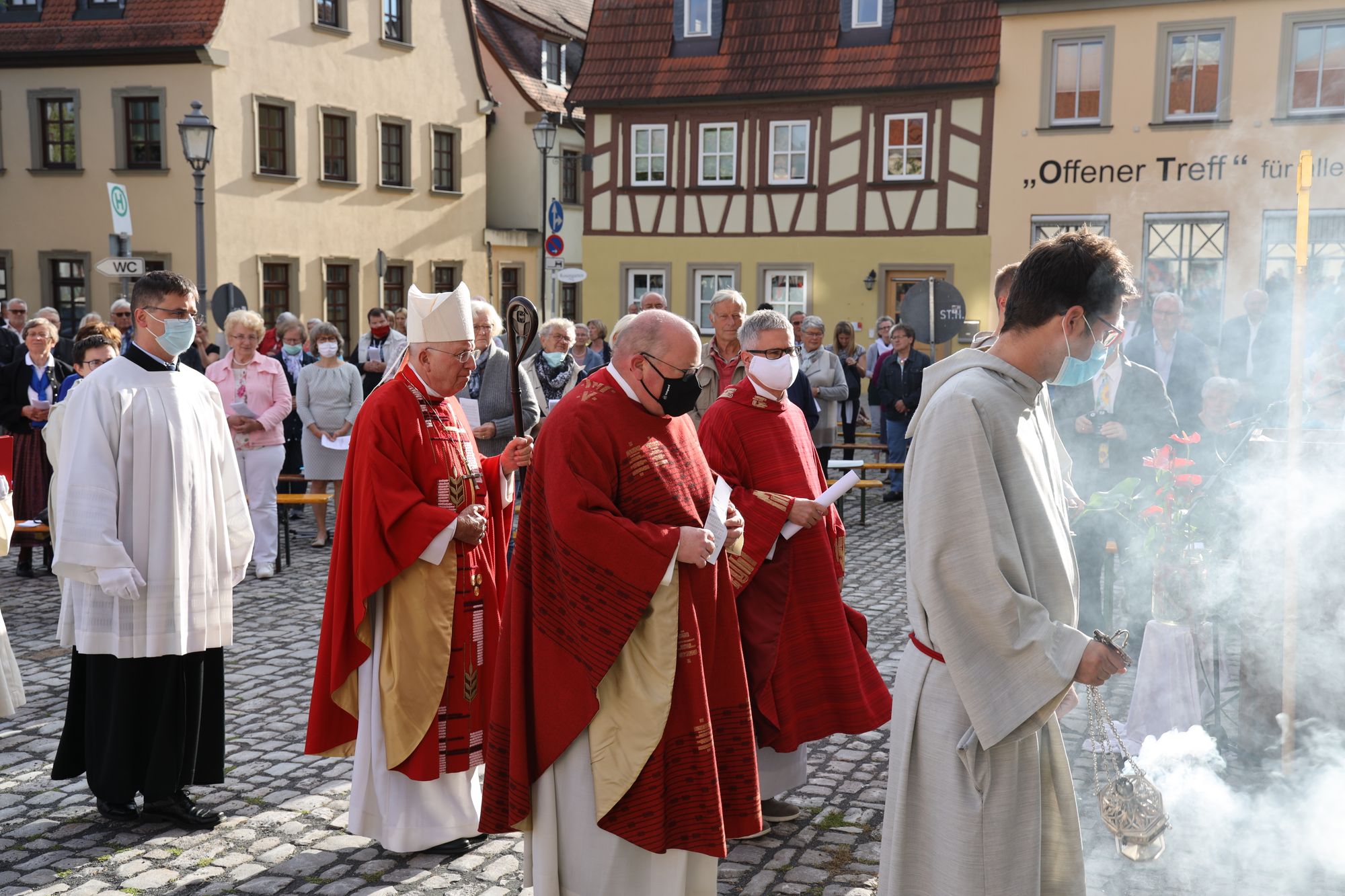 Haßfurt (POW) Immer wieder bleiben Passanten stehen, schauen, was da auf dem Platz an der Haßfurter Pfarrkirche Sankt Kilian los ist. „Wir feiern heute mitten im Leben Gottesdienst“, erklärt Weihbischof Ulrich Boom den mehr als 200 Frauen und Männern, die an diesem Dienstagabend, 7. Juli, zur Feier gekommen sind. Es ist der erste von insgesamt vier Pontifikalgottesdiensten, die in der Kiliani-Wallfahrtswoche an verschiedenen Orten im Bistum Würzburg gefeiert werden. Wegen der Corona-Pandemie gibt es in diesem Jahr nicht wie üblich die großen Wallfahrtsgottesdienste für die Dekanate im Würzburger Kiliansdom.