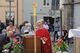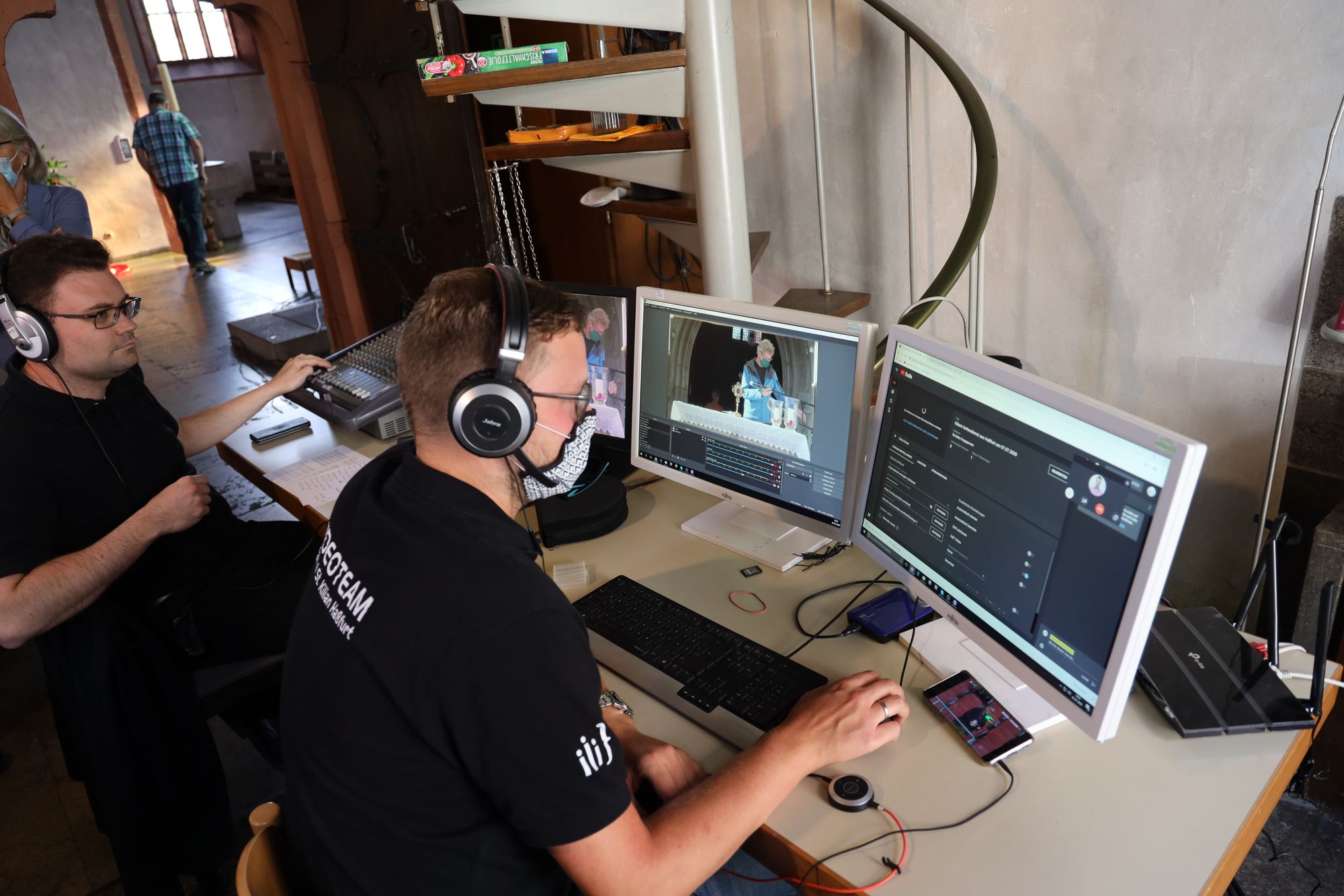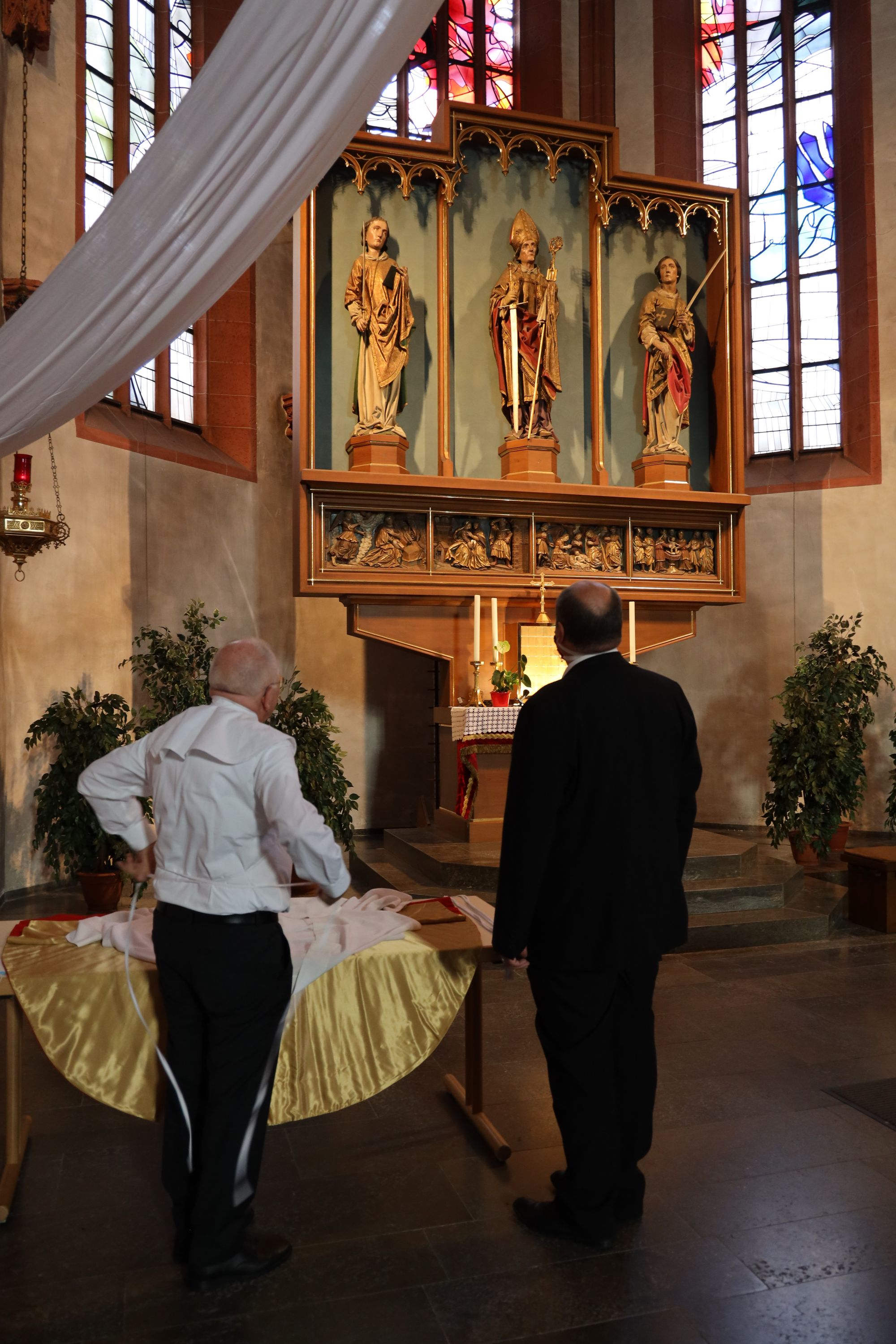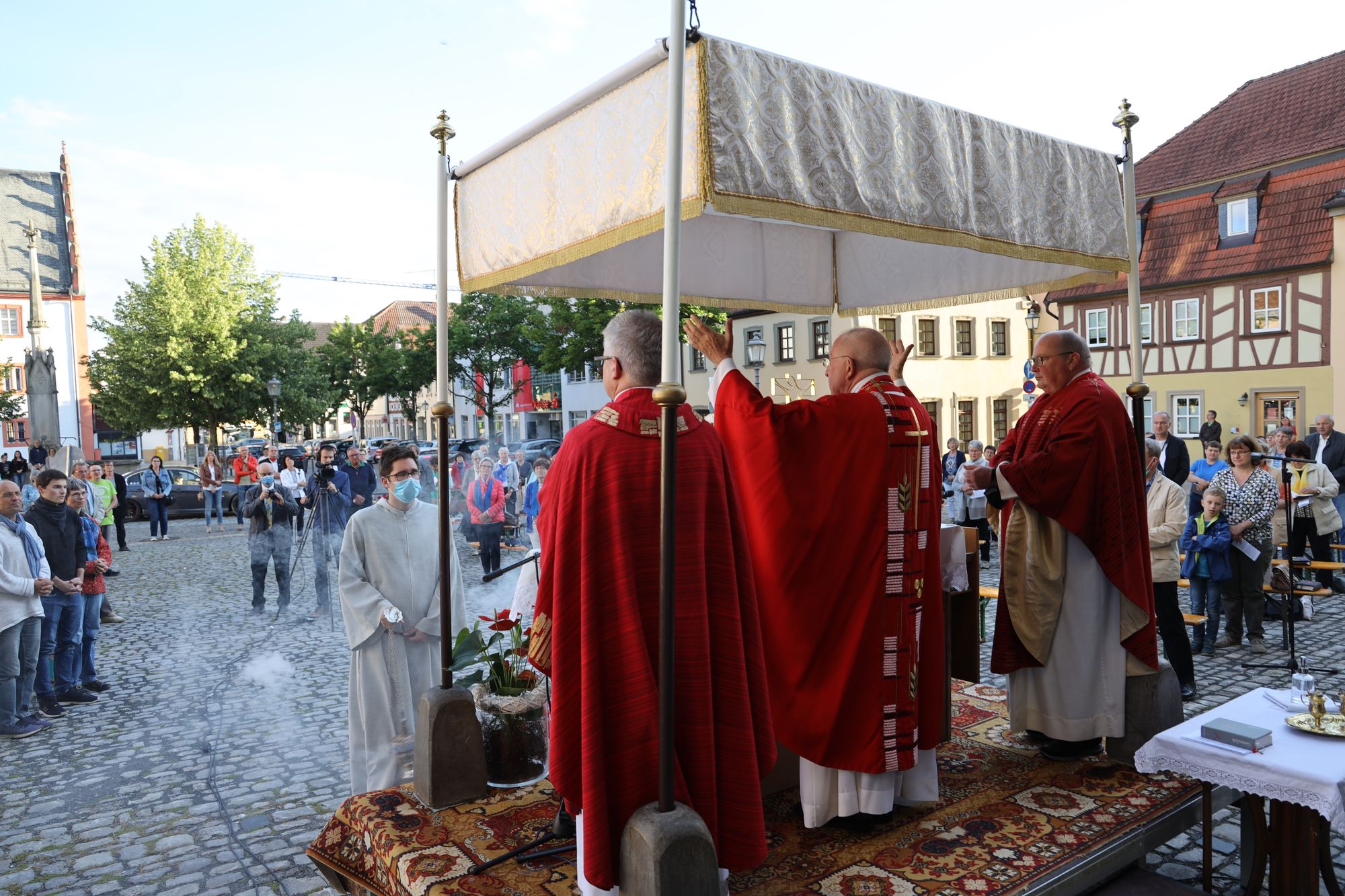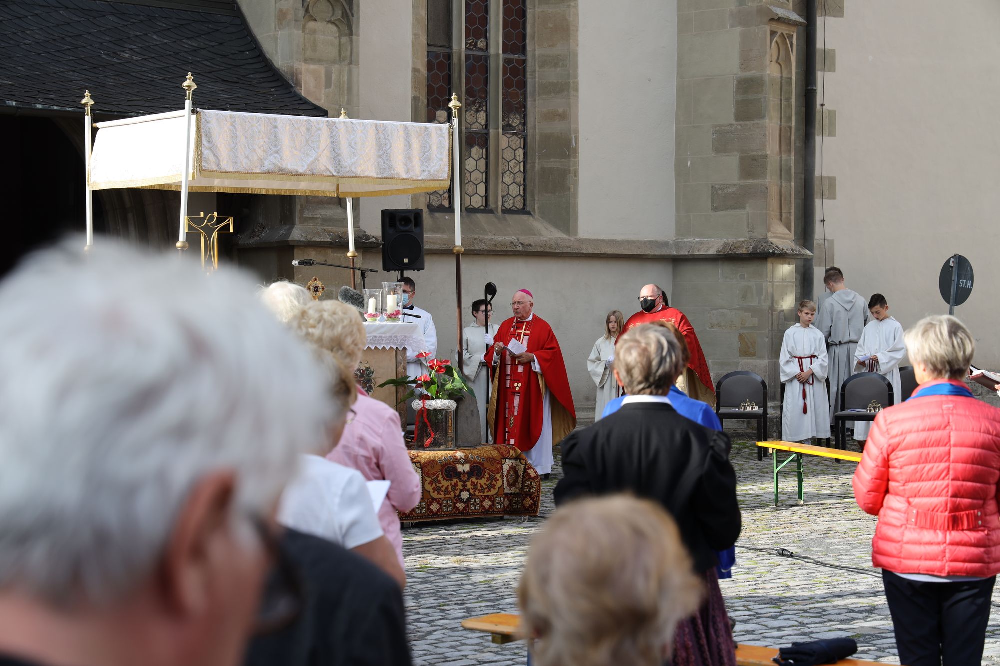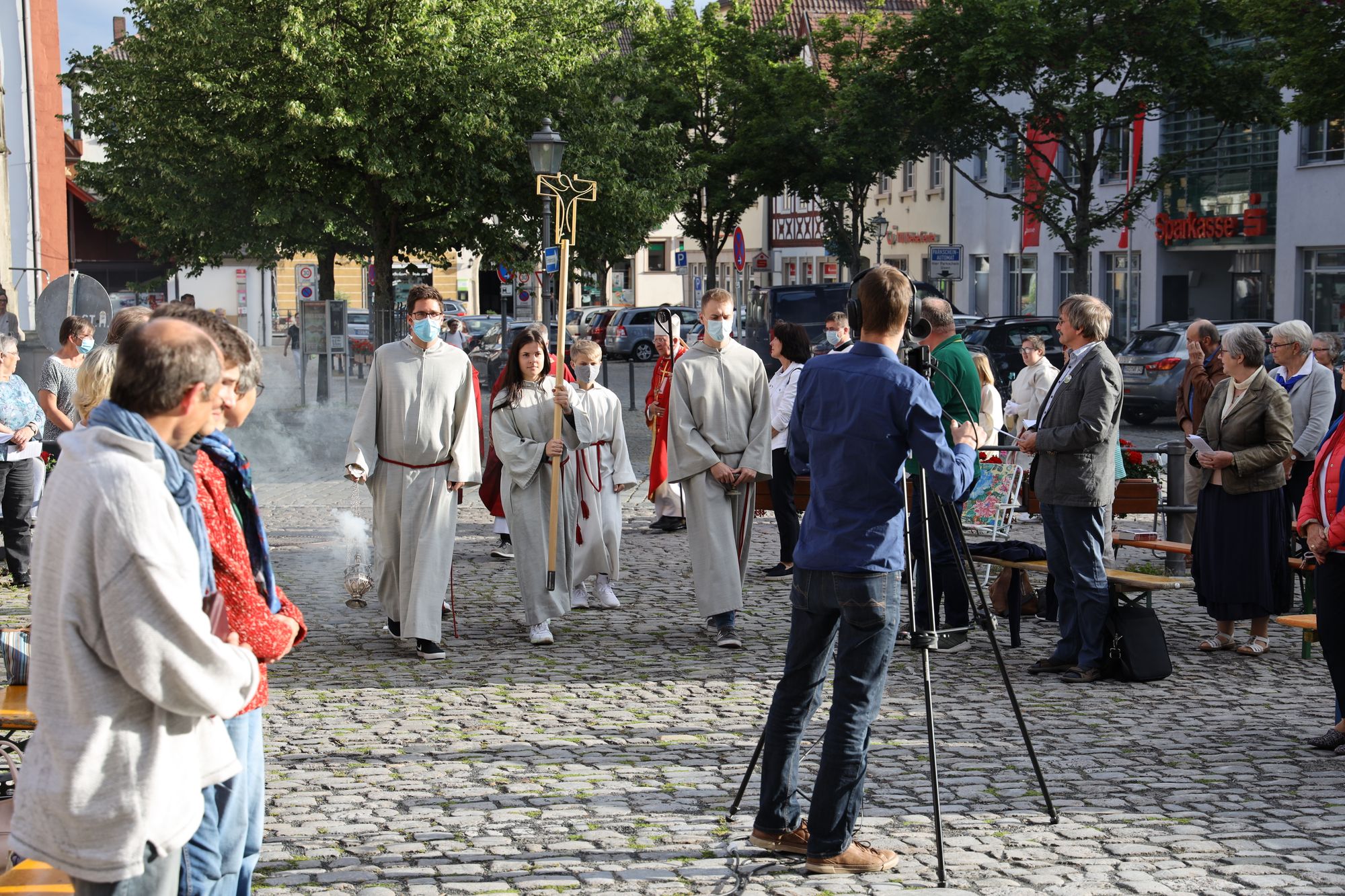 Die Gläubigen aus der Gegend sind der Einladung gern gefolgt. Auf Dutzenden von Bierbänken sitzen sie bei blauem Himmel und angenehmen Temperaturen mit dem vorgeschriebenen Abstand. Ein Blechbläserensemble und ein Chor sorgen für festliche Musik. Bei den Gemeindeliedern tönt der Gesang der vielen Kehlen weit in die umliegenden Straßen hinein. Vor dem Seitenportal ist auf einem Podest ein Freiluftaltar aufgebaut, mit dem Tragehimmel der Fronleichnamsprozession als festlicher Überdachung. Das Videoteam der Pfarrei überträgt – wie seit März – auch diesen Gottesdienst auf seinem YouTube-Kanal, damit möglichst viele Menschen an der Feier teilnehmen können.