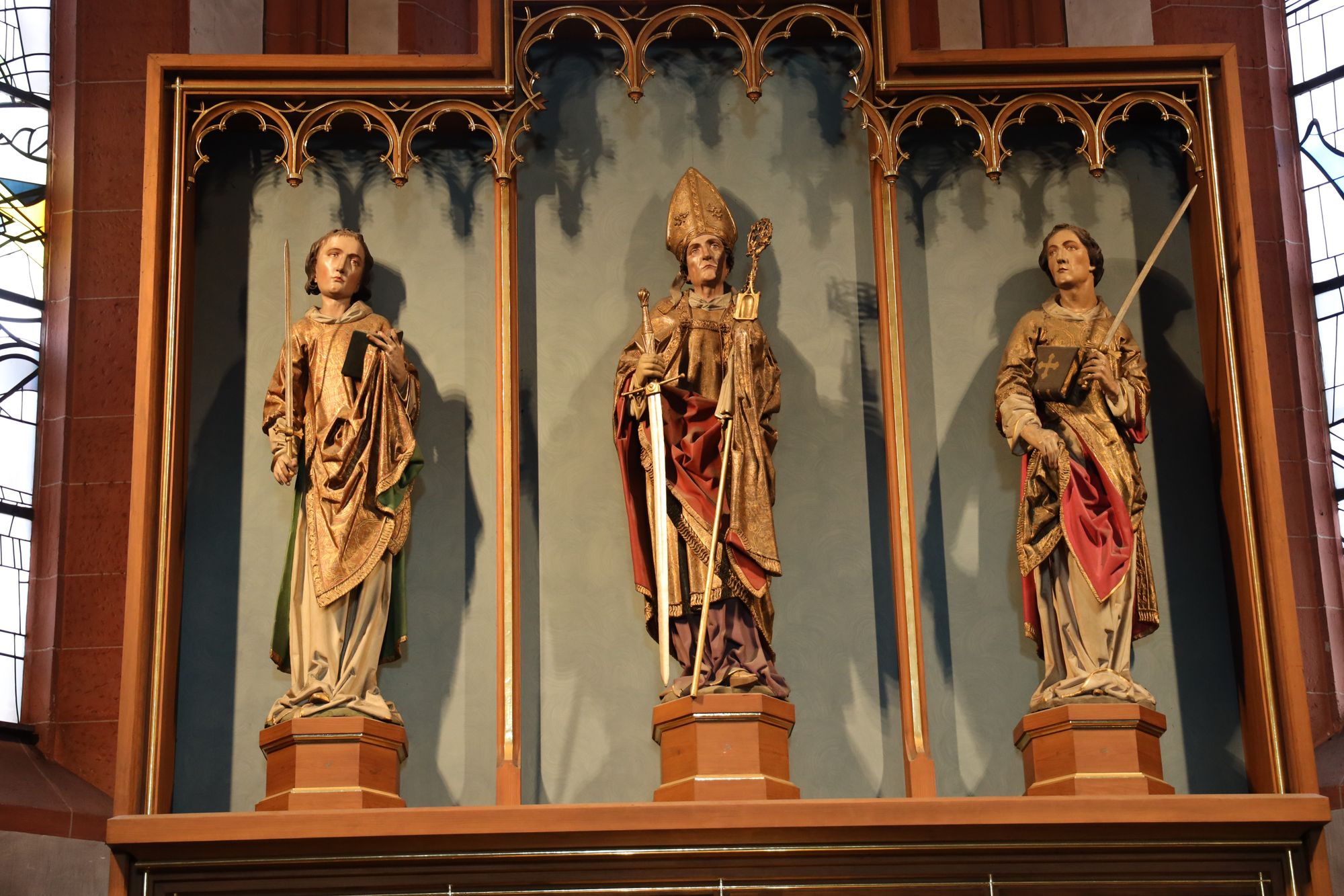In seiner Predigt schlägt Weihbischof Boom von der Darstellung des heiligen Kilian im Hochaltar der Haßfurter Pfarrkirche einen Bogen zu den Darstellungen auf dem Kreuzberg und auf dem Kiliansplatz in Würzburg. „Bei all diesen Kiliansbildern ist das Bild des heiligen Kilian mit seinen Gefährten auf dem Kiliansschrein in der Krypta des Neumünsters für mich das Treffendste.“ Dort sind die Frankenapostel nicht in liturgischen Gewändern dargestellt. „Das Gewand der Pilger ist nicht das Festtagskleid, es ist das Gewand der Straße, auf Kante genäht. An ihm klebt der Staub und Dreck des alltäglichen Mühens. So ist uns der Heilige mit seinen Gefährten in den Nöten und Sorgen unserer Tage nahe“, sagt Weihbischof Boom.