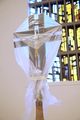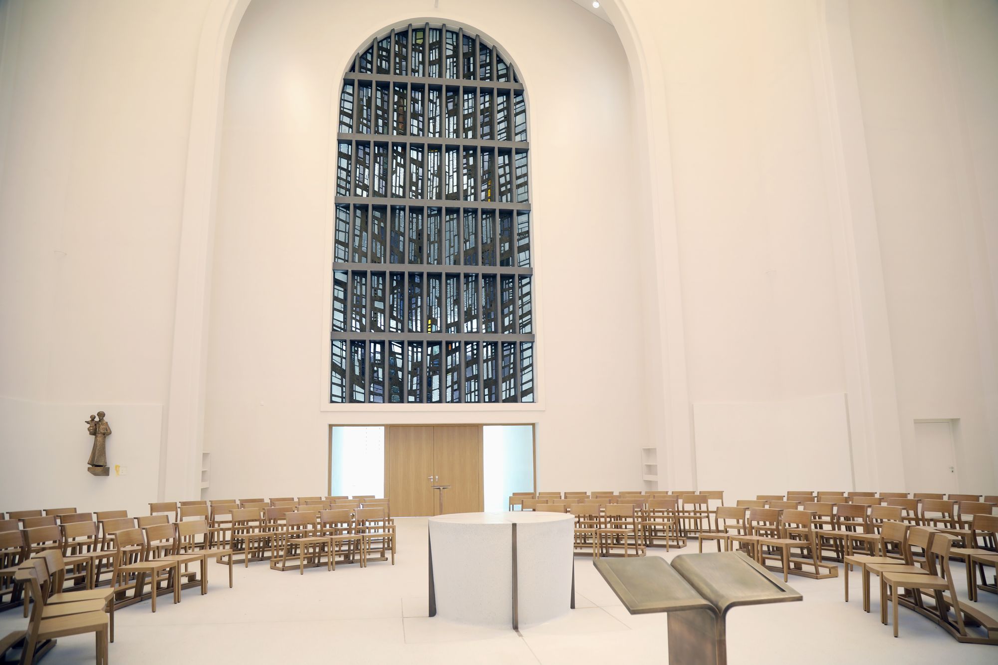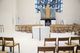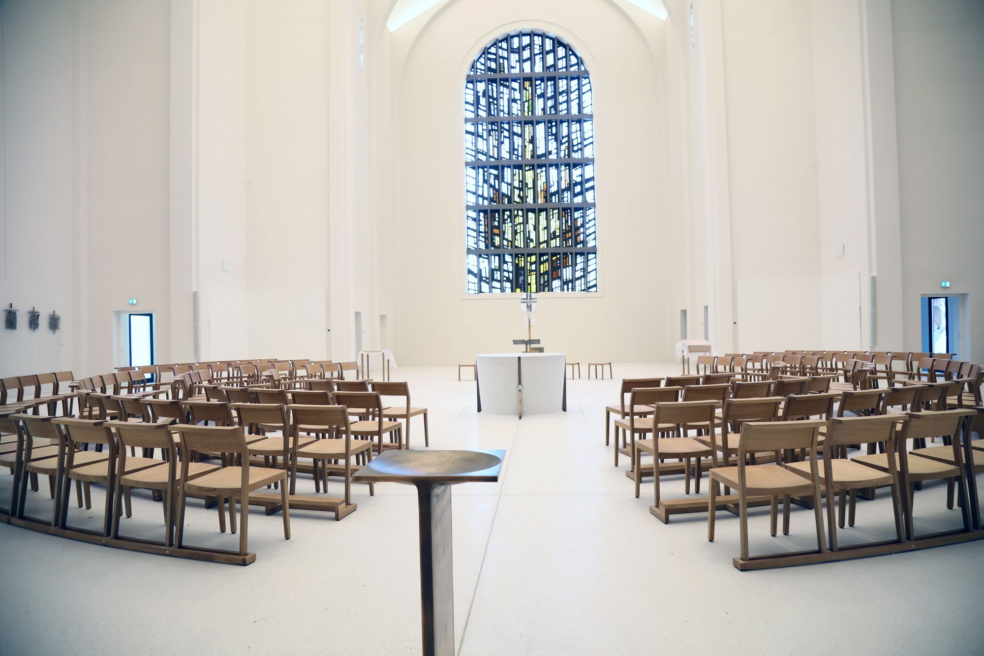 Die Kirche ist schon rein optisch das Herzstück des „casa Vielfalt“. Durch das transparente Eingangsportal mit seinen breiten Glastüren kommt man ebenerdig direkt in den Kirchenraum. Dieser präsentiert sich in einer komplett neuen, „franziskanisch schlichten“ Optik. Im Mittelpunkt steht der Altar, der aus dem gleichen hellen Terrazzo wie der Boden geschaffen wurde. „Er wächst buchstäblich aus dem Fußboden heraus“, beschreibt Werb. Einziger Schmuck sind vier Bronzestreifen, die senkrecht zum Boden verlaufen. Rings um den Altar ist in einem großen Kreis die Bestuhlung angeordnet. „Es gibt keine festen Bänke mehr. Alle Stühle können versetzt und neu positioniert werden.“ Der Priester sei nun auf einer Ebene mit der Gemeinde, ergänzt Monika Seibold vom Gemeindeleitungsteam. Das werde auch für die Zelebranten eine Umgewöhnung bedeuten.