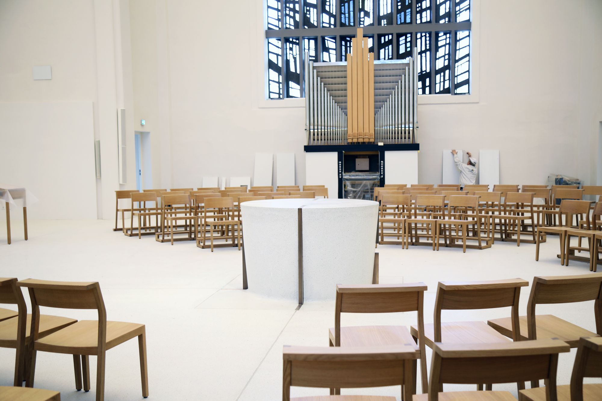 Weihwasserbecken, Altar, Ambo und Kreuz sind in einer geraden Linie angeordnet. Rechts vom Eingang fand die Skulptur des heiligen Antonius einen neuen Platz. Der Kreuzweg hängt nun links unter einem der großen Bogenfenster. „In der alten Kirche ist er nicht aufgefallen“, stellt Mesner Karl-Heinz Seibold fest. Noch sind die einzelnen Stationen unter schützender Plastikfolie verpackt. Rings um die neue Orgel, die unter dem rechten Bogenfenster steht, sind noch Malerarbeiten im Gange. Die Orgel hatte den Planern vom Architekturbüro Brückner & Brückner Tirschenreuth/Würzburg einiges Kopfzerbrechen bereitet. Die alte Orgel sei zu groß gewesen, und so habe man zunächst ohne Orgel geplant. Doch dann organisierte Regionalkantor Rainer Aberle eine Orgel aus einem Übungsraum des Regionalzentrums für Kirchenmusik in Haßfurt als Dauerleihgabe des Bistums. „Die Planungen waren fertig, und dann standen wir vor der Frage: Wo kommt jetzt die Orgel hin?“, erinnert sich Monika Seibold. Mit dem Platz unter dem Fenster, der schließlich gefunden wurde, sind nun alle einverstanden.