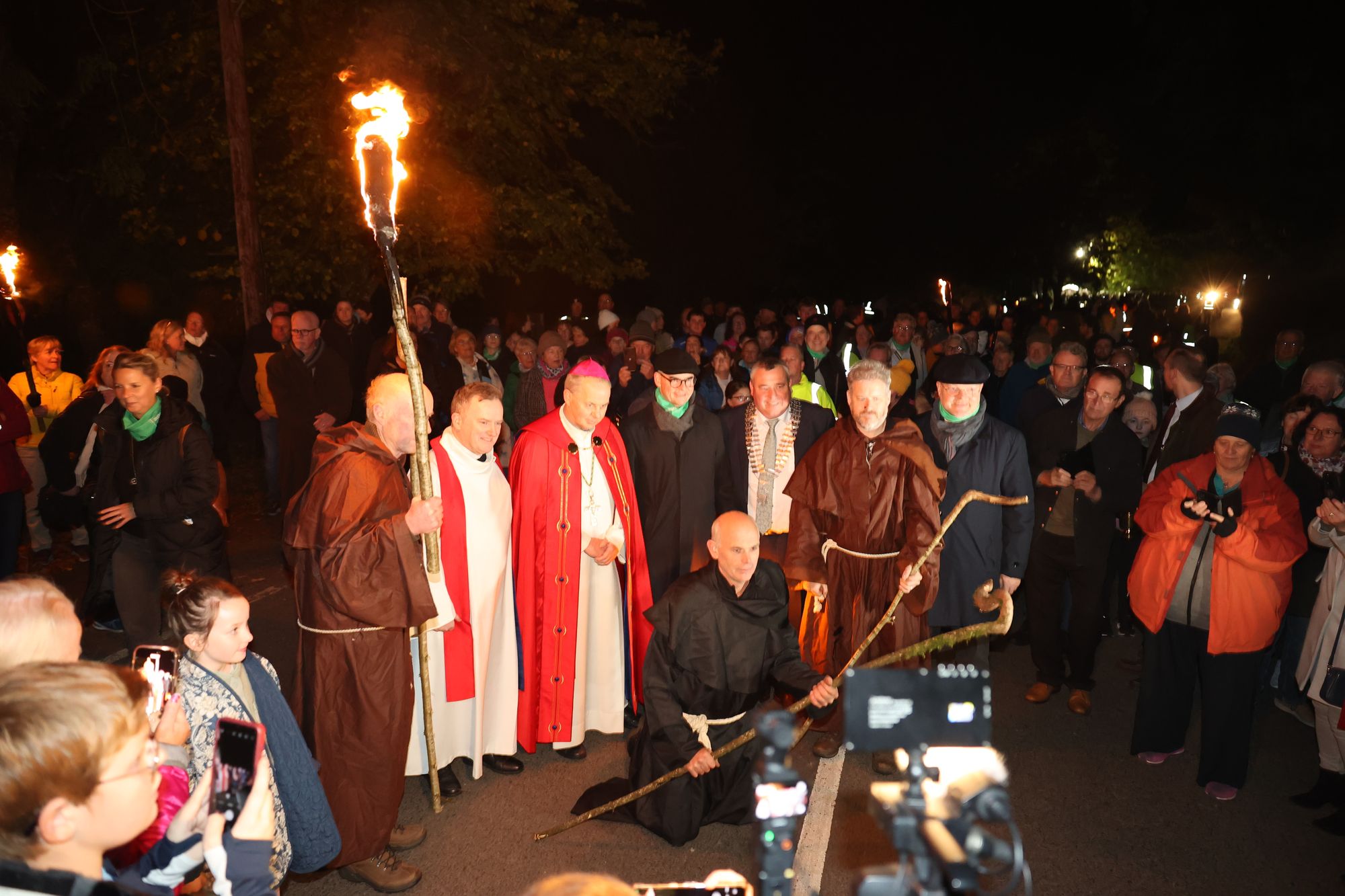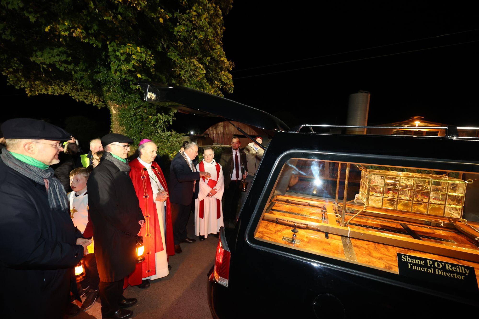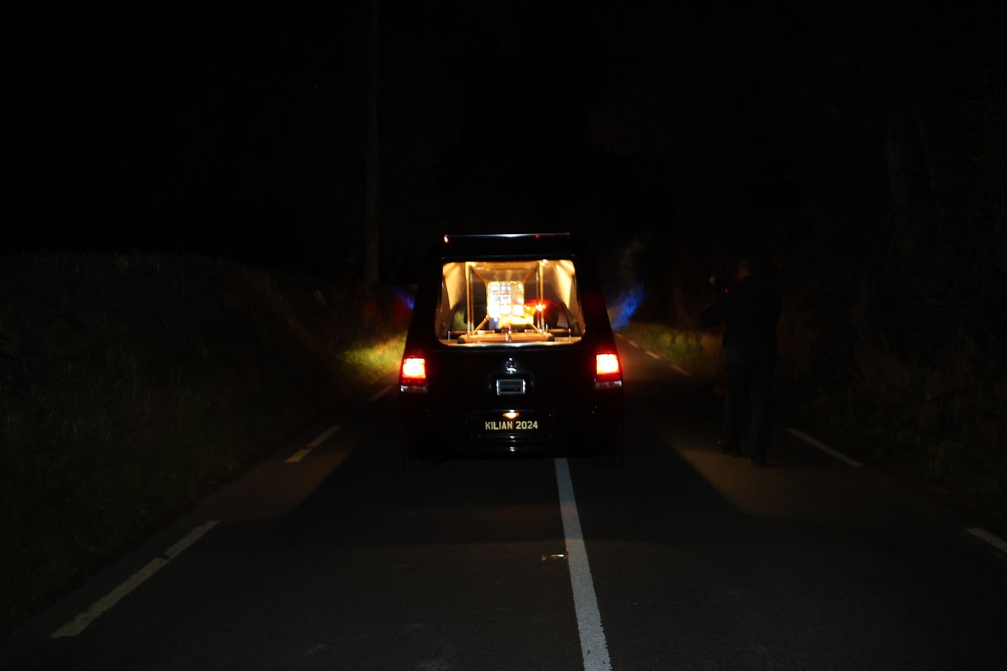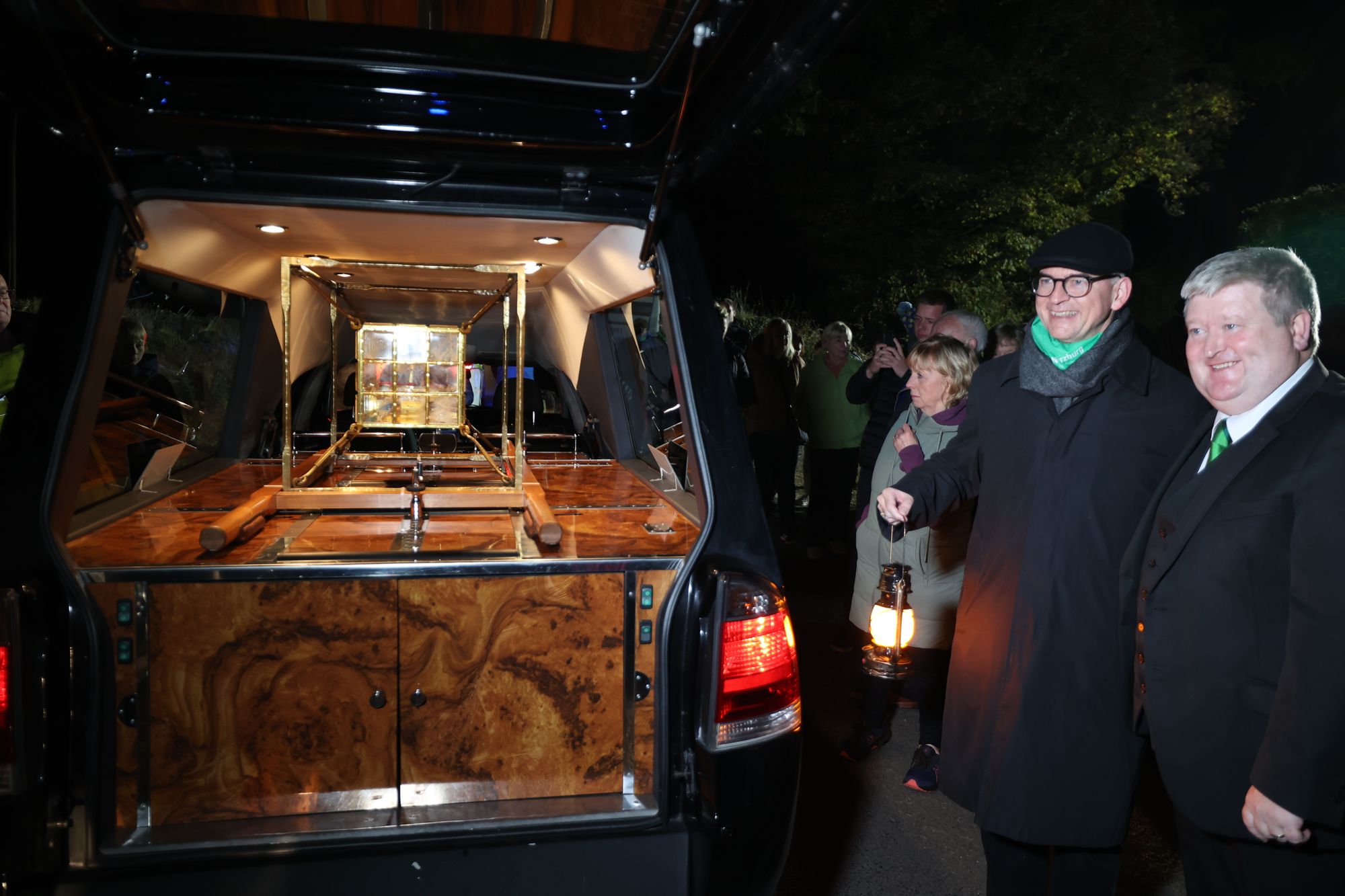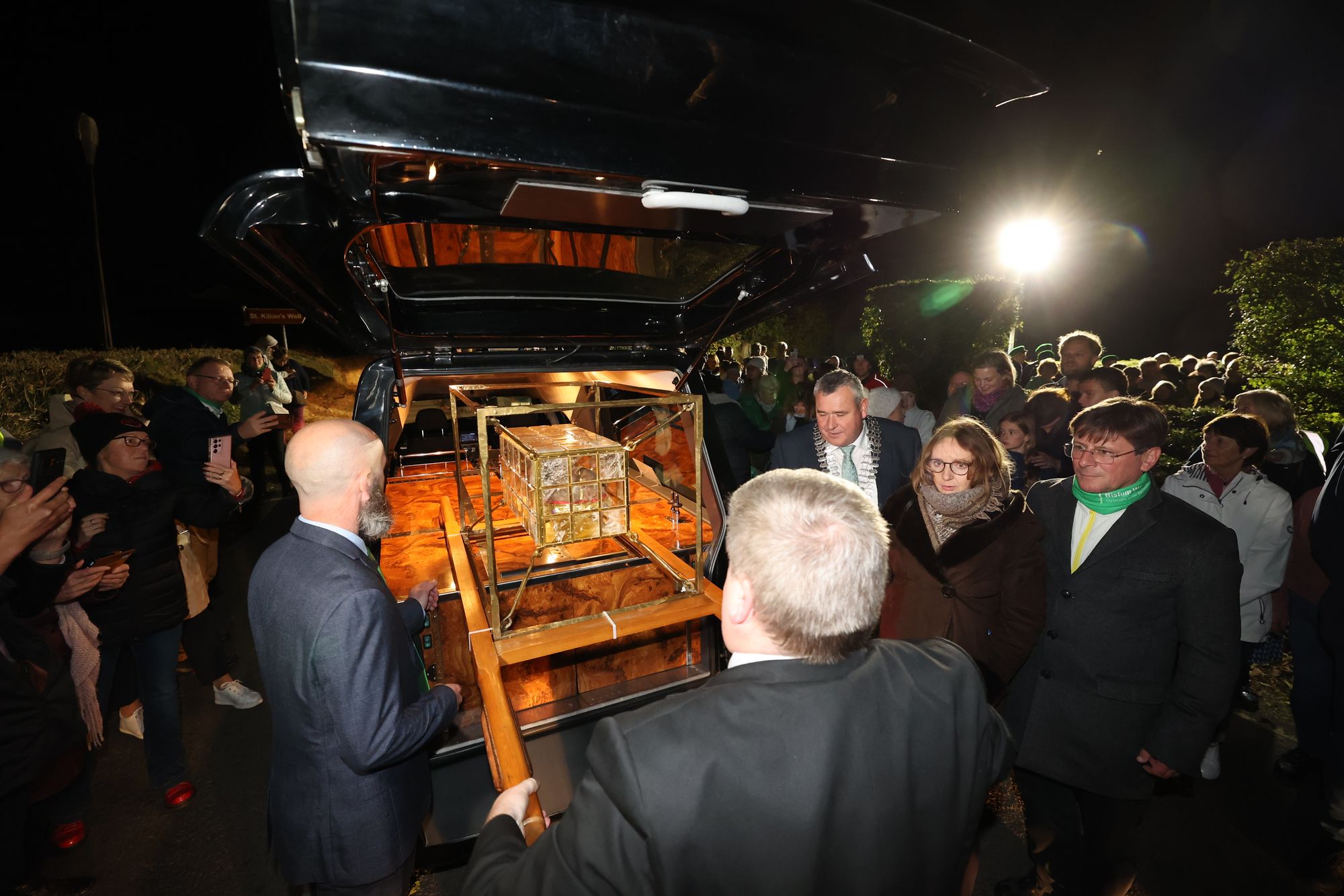 Dann naht das von Polizeiautos eskortierte Transportfahrzeug mit dem Reliquienschrein der Frankenapostel mit dem Nummernschild „Kilian 2024“. Deutsche und Iren tragen die Häupter in die Mitte der auf dem Gelände an der Quelle versammelten Gläubigen. Der Chor der örtlichen Pfarrei singt irische Weisen. Father Paul Prior, Pfarrer von Mullagh, besprengt die Reliquien mit Weihwasser. Auf der abgesperrten Straße setzt sich die Prozession in Richtung Mullagh in Bewegung. Zur Linken ist in der Ferne ein großes Feuer auf dem Berg von Mullagh zu sehen. Sphärischer irischsprachiger Gesang und der tiefe Klang von Hörnern schallen aus großen Lautsprechern beim Feuer herunter und umgeben den stillen Zug mit einer besonderen Stimmung. „Wir haben diesen Abend so lange herbeigesehnt“, raunt der Ortspfarrer seinem Nebenmann zu.