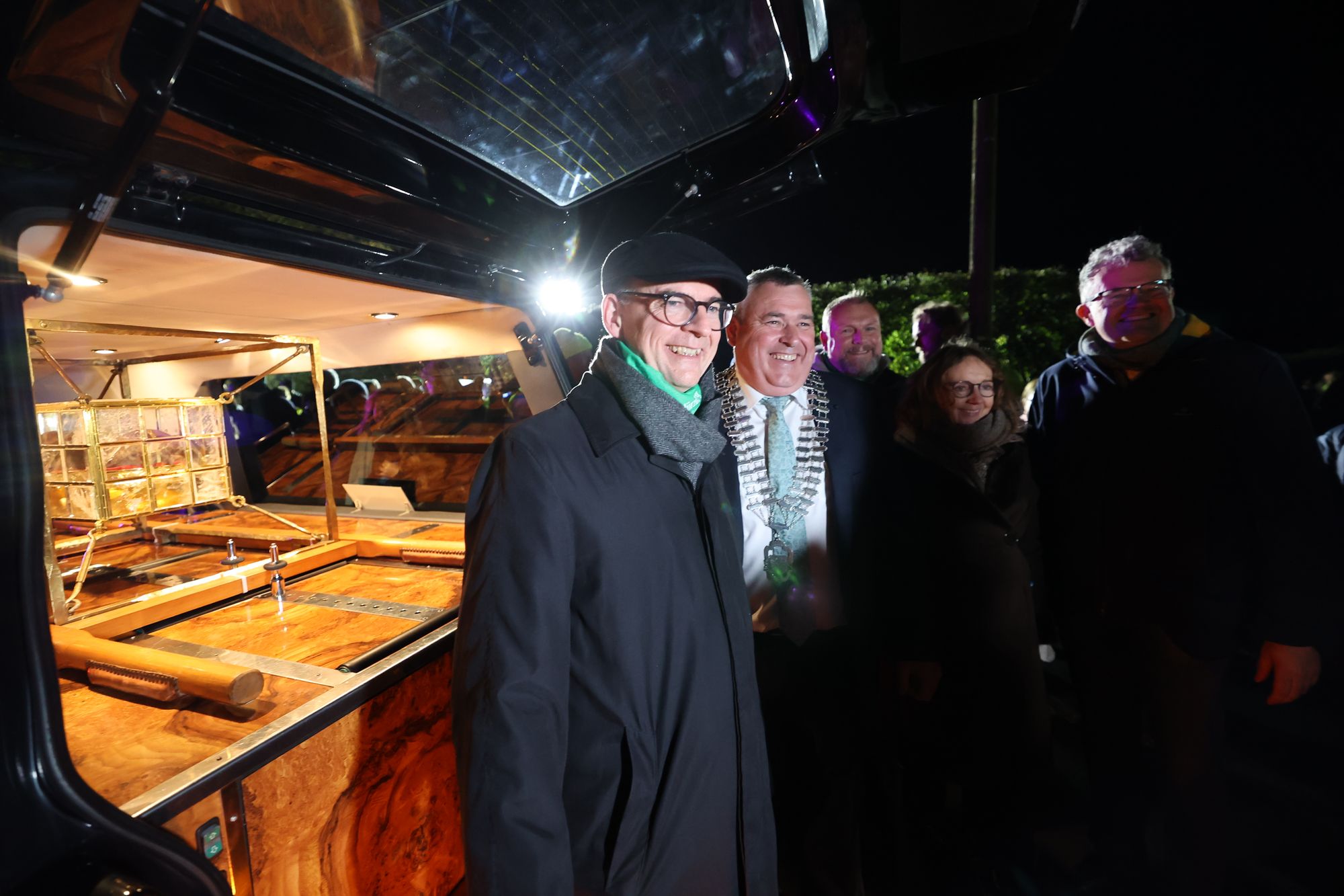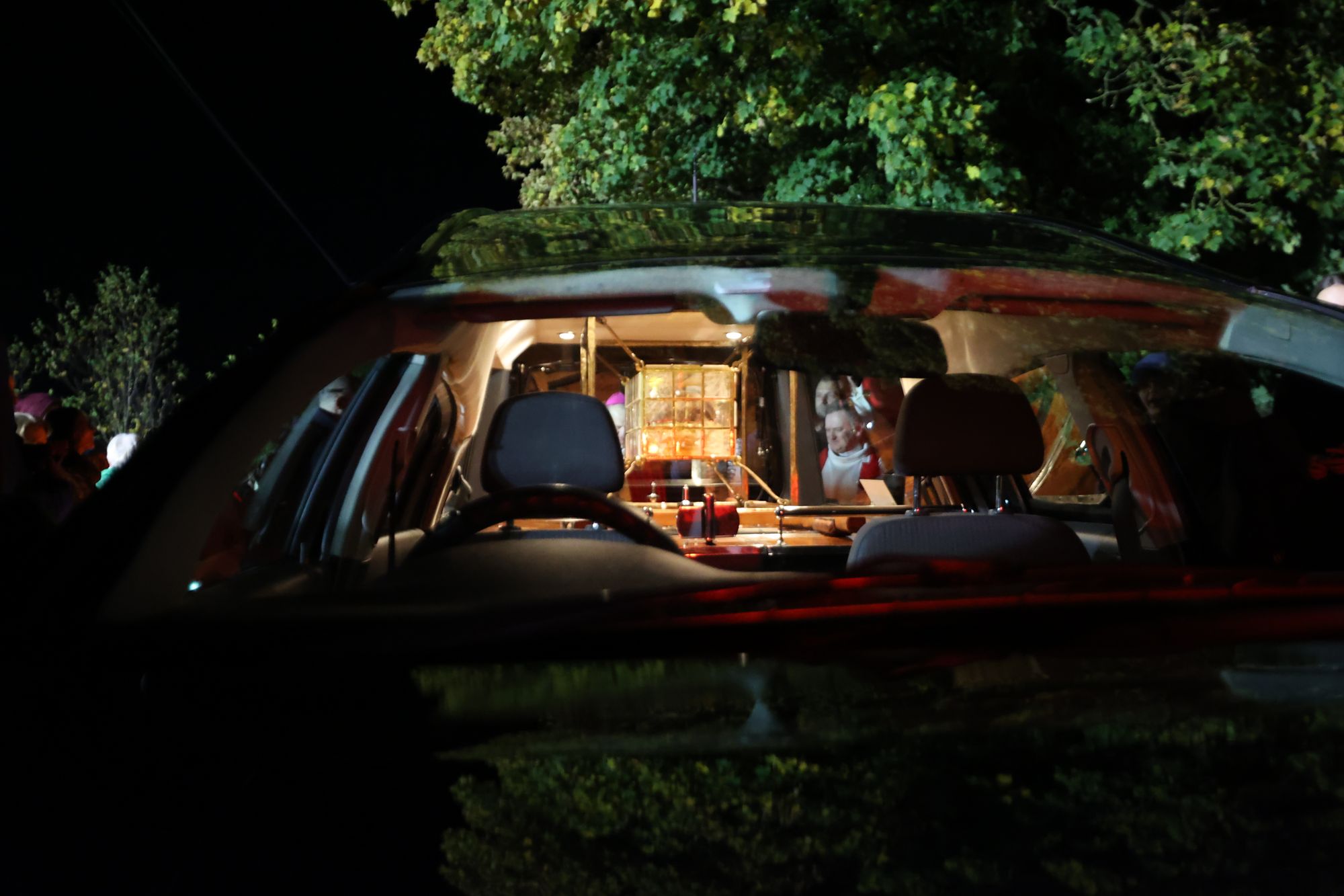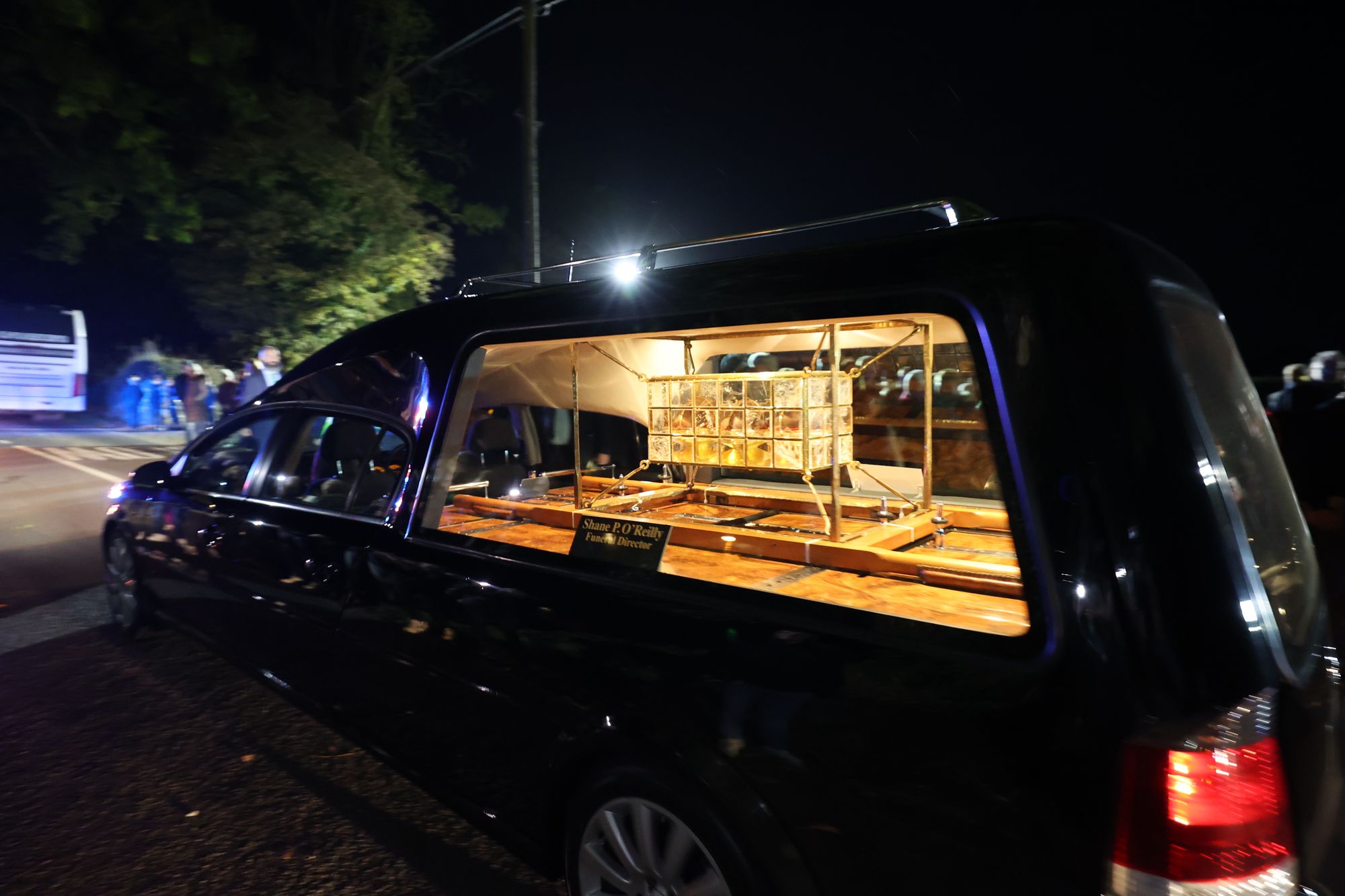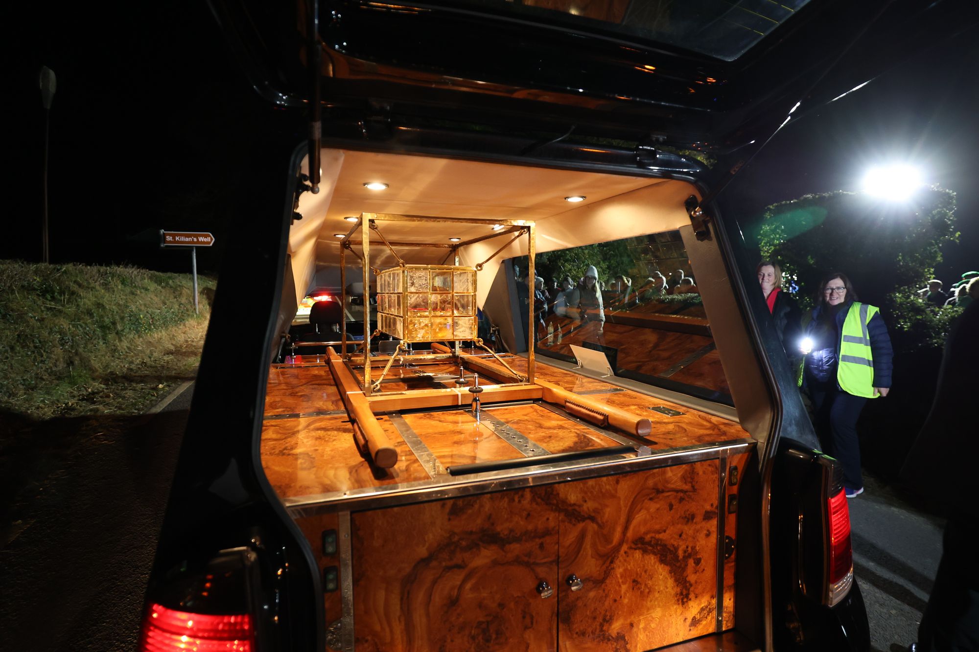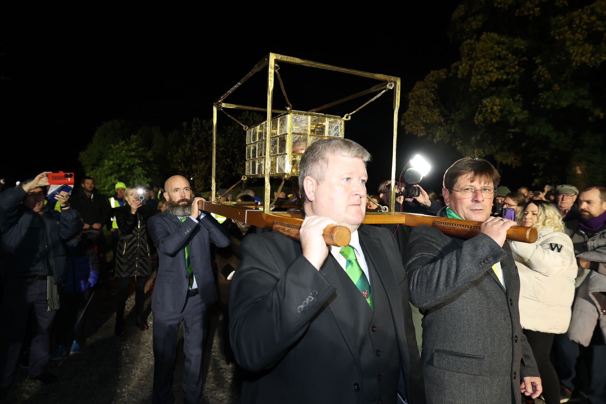 Dann naht das von Polizeiautos eskortierte Transportfahrzeug mit dem Reliquienschrein der Frankenapostel mit dem Nummernschild „Kilian 2024“. Deutsche und Iren tragen die Häupter in die Mitte der auf dem Gelände an der Quelle versammelten Gläubigen. Der Chor der örtlichen Pfarrei singt irische Weisen. Father Paul Prior, Pfarrer von Mullagh, besprengt die Reliquien mit Weihwasser. Auf der abgesperrten Straße setzt sich die Prozession in Richtung Mullagh in Bewegung. Zur Linken ist in der Ferne ein großes Feuer auf dem Berg von Mullagh zu sehen. Sphärischer irischsprachiger Gesang und der tiefe Klang von Hörnern schallen aus großen Lautsprechern beim Feuer herunter und umgeben den stillen Zug mit einer besonderen Stimmung. „Wir haben diesen Abend so lange herbeigesehnt“, raunt der Ortspfarrer seinem Nebenmann zu.