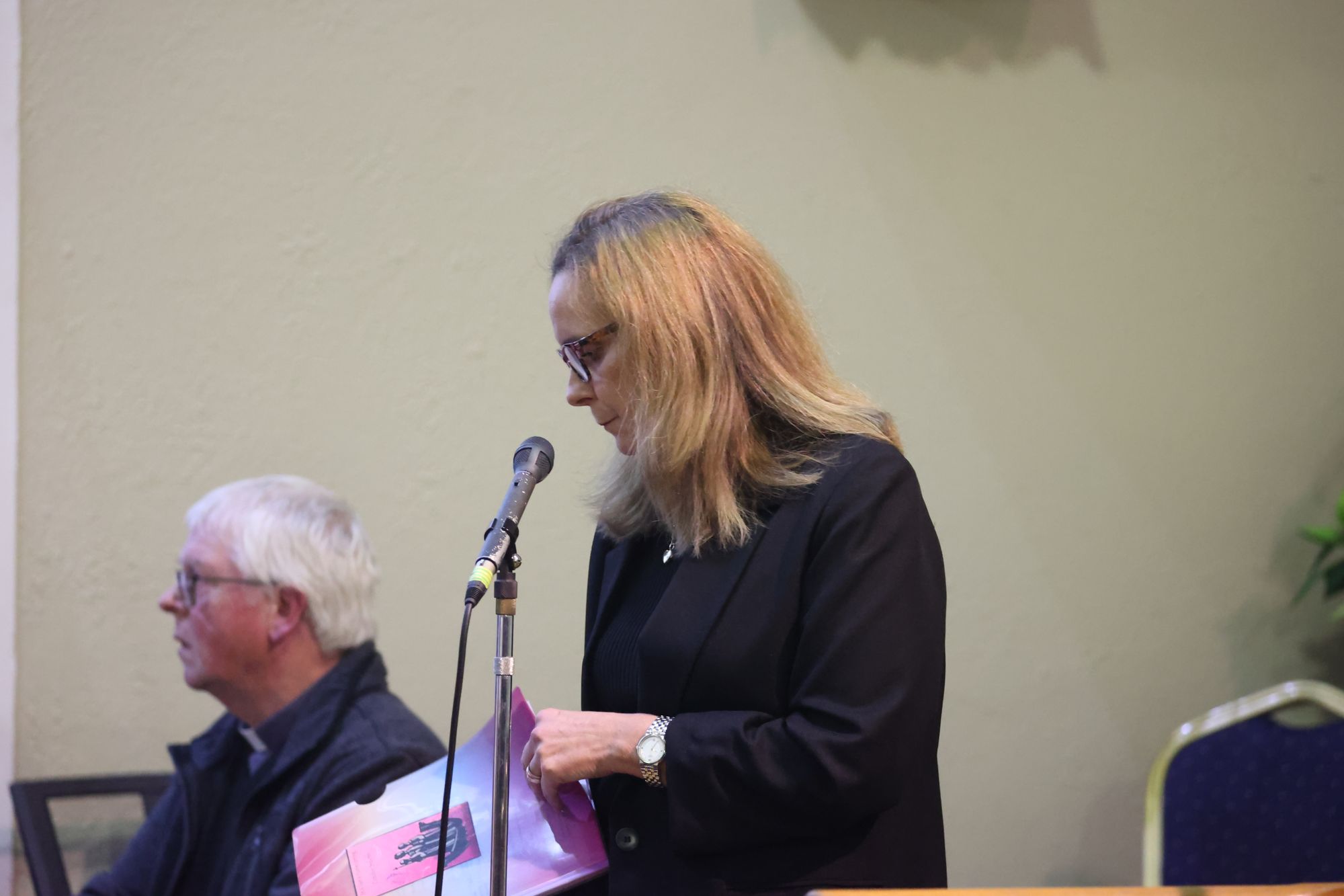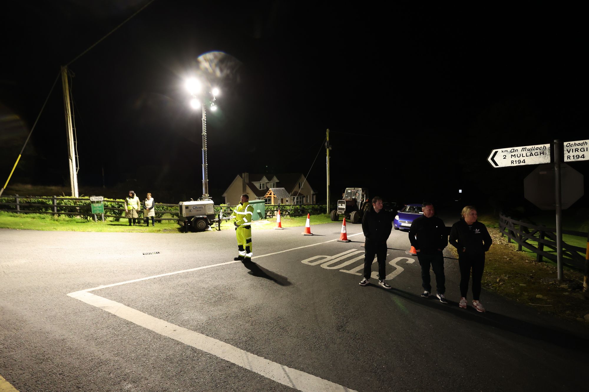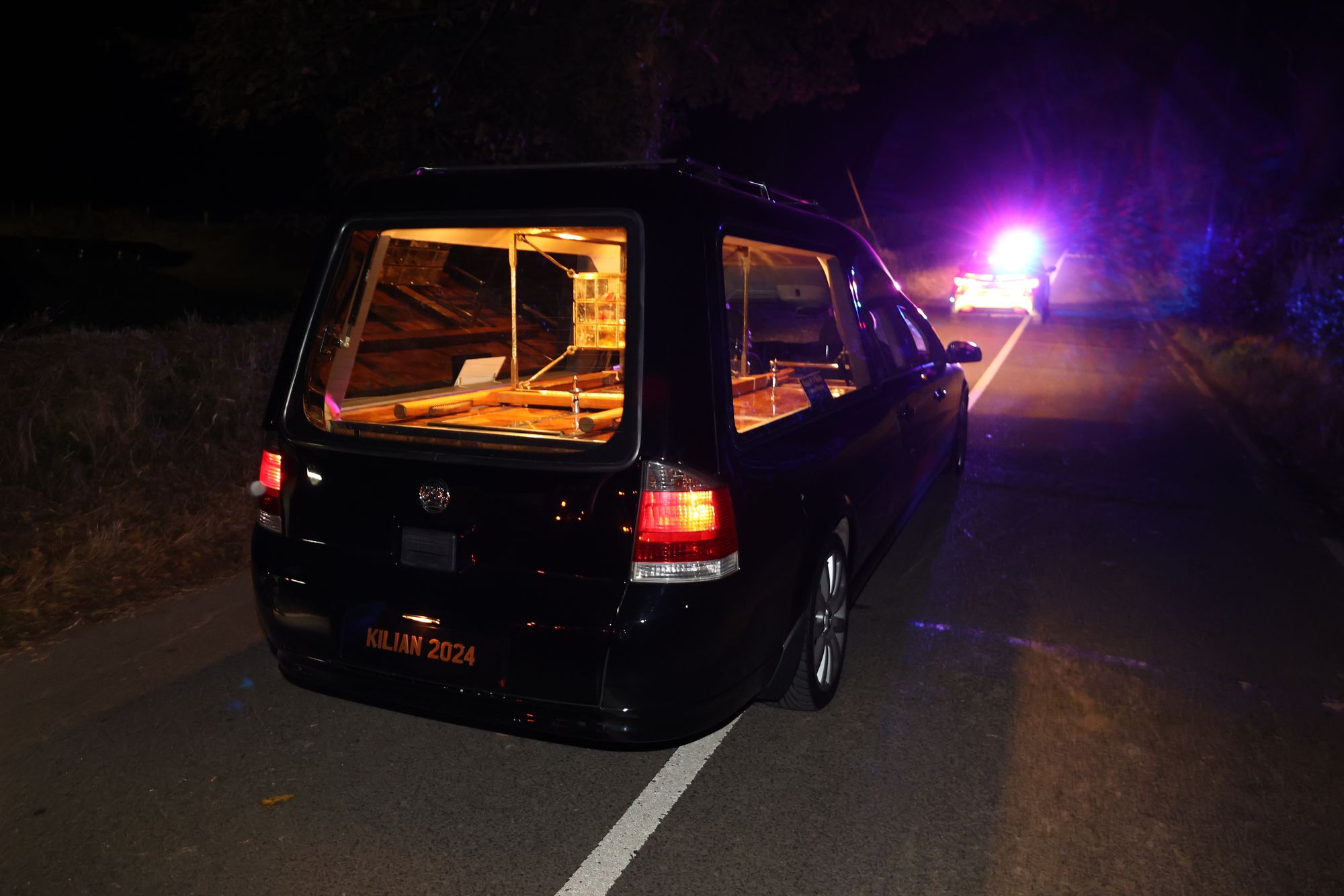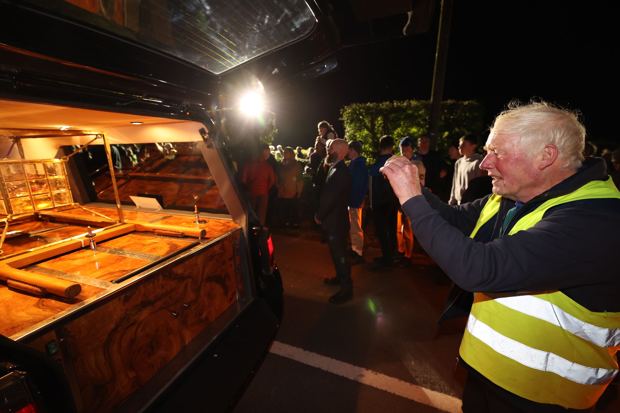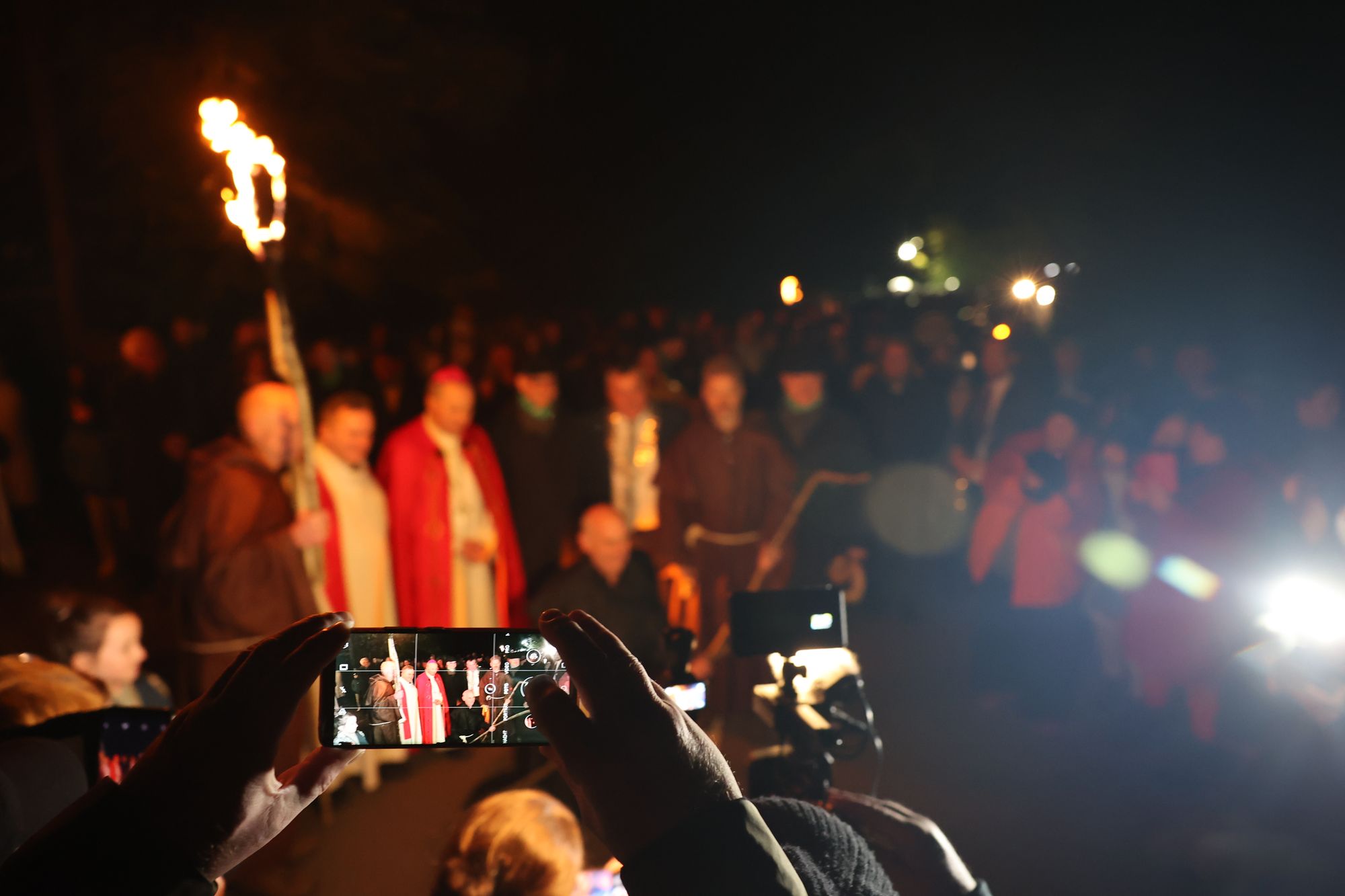 Dann naht das von Polizeiautos eskortierte Transportfahrzeug mit dem Reliquienschrein der Frankenapostel mit dem Nummernschild „Kilian 2024“. Deutsche und Iren tragen die Häupter in die Mitte der auf dem Gelände an der Quelle versammelten Gläubigen. Der Chor der örtlichen Pfarrei singt irische Weisen. Father Paul Prior, Pfarrer von Mullagh, besprengt die Reliquien mit Weihwasser. Auf der abgesperrten Straße setzt sich die Prozession in Richtung Mullagh in Bewegung. Zur Linken ist in der Ferne ein großes Feuer auf dem Berg von Mullagh zu sehen. Sphärischer irischsprachiger Gesang und der tiefe Klang von Hörnern schallen aus großen Lautsprechern beim Feuer herunter und umgeben den stillen Zug mit einer besonderen Stimmung. „Wir haben diesen Abend so lange herbeigesehnt“, raunt der Ortspfarrer seinem Nebenmann zu.