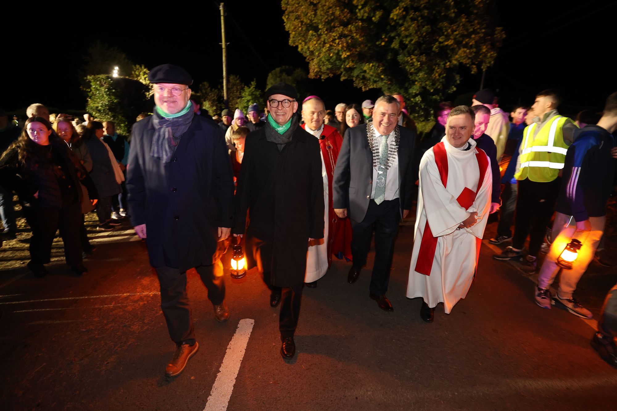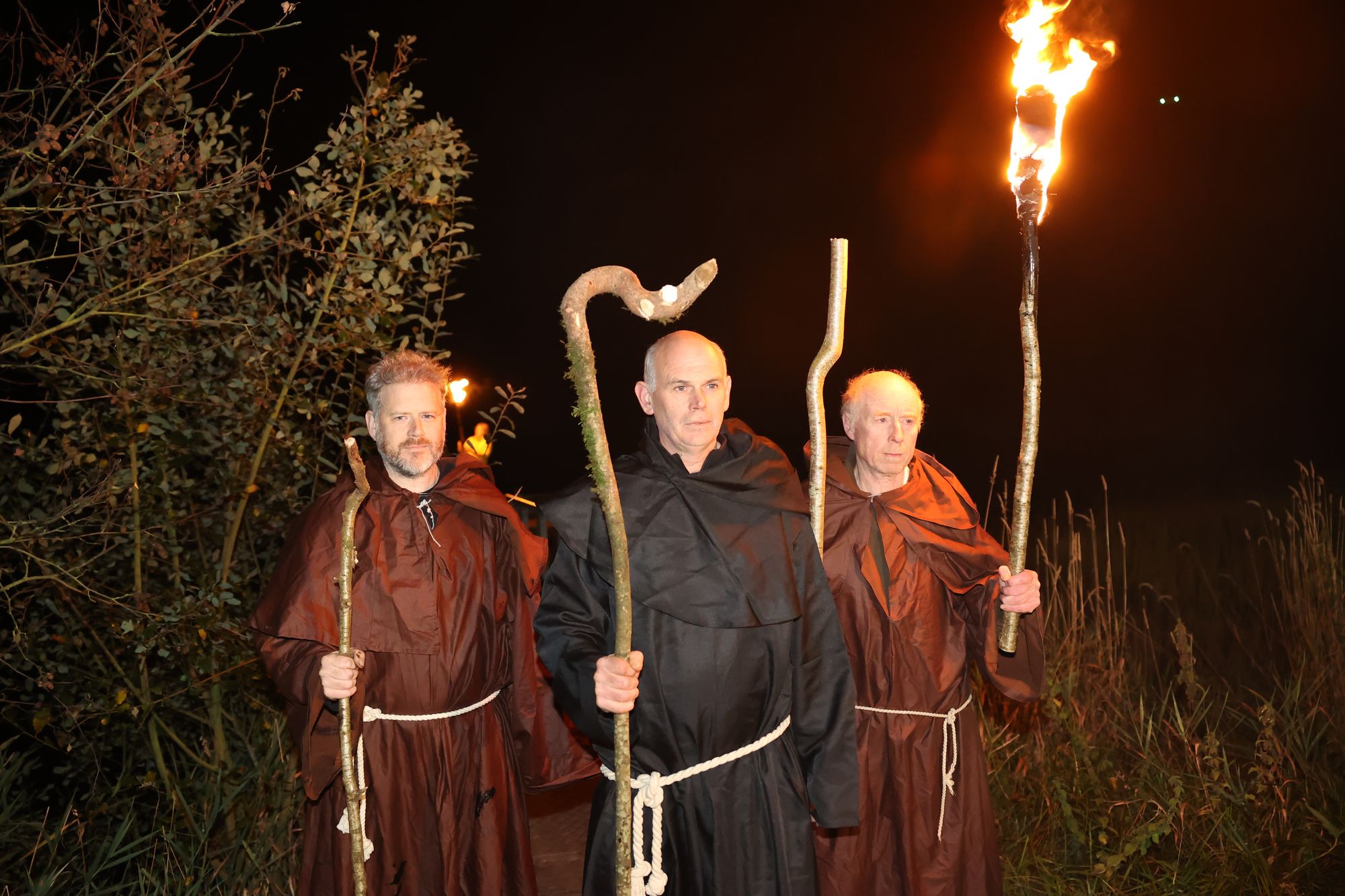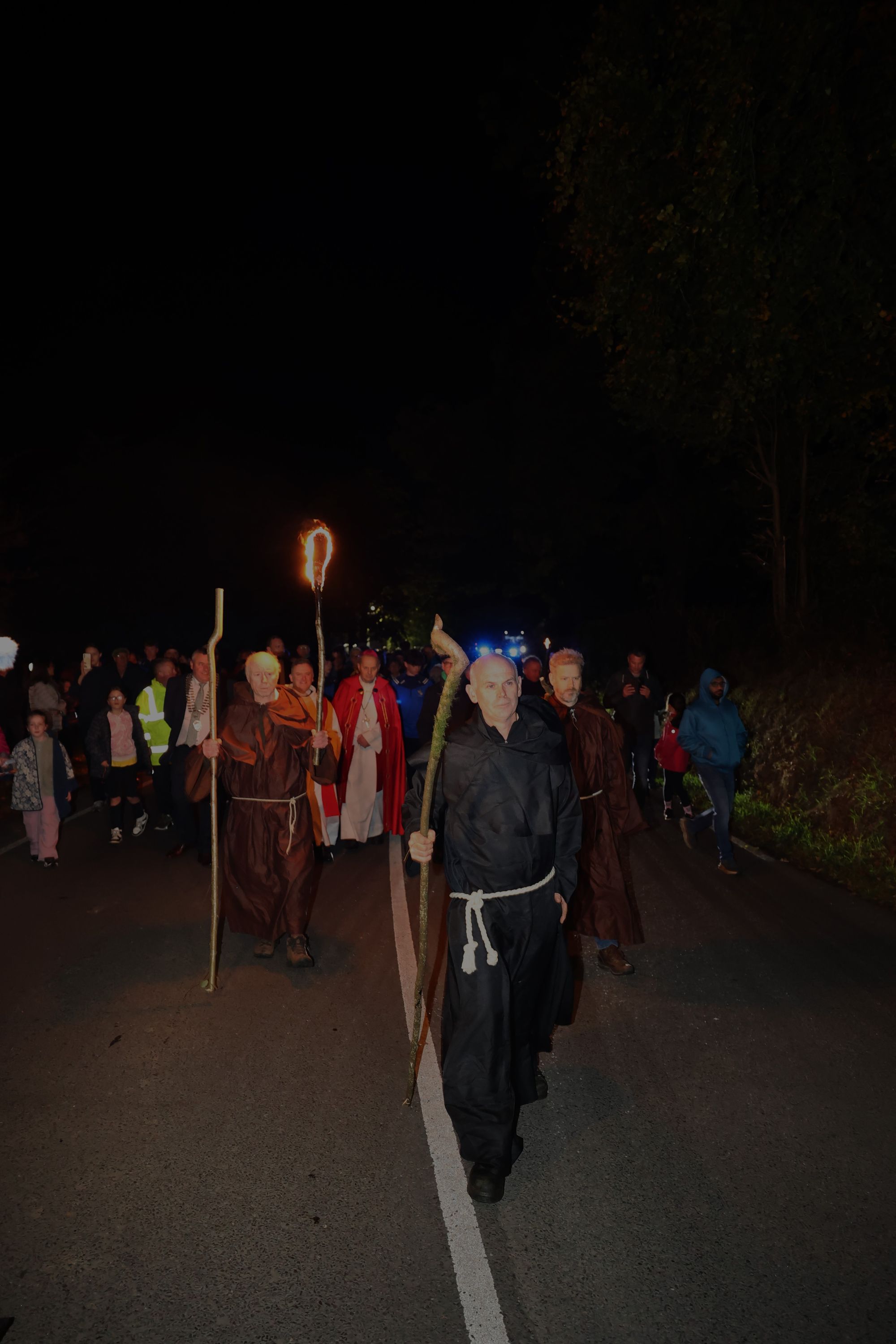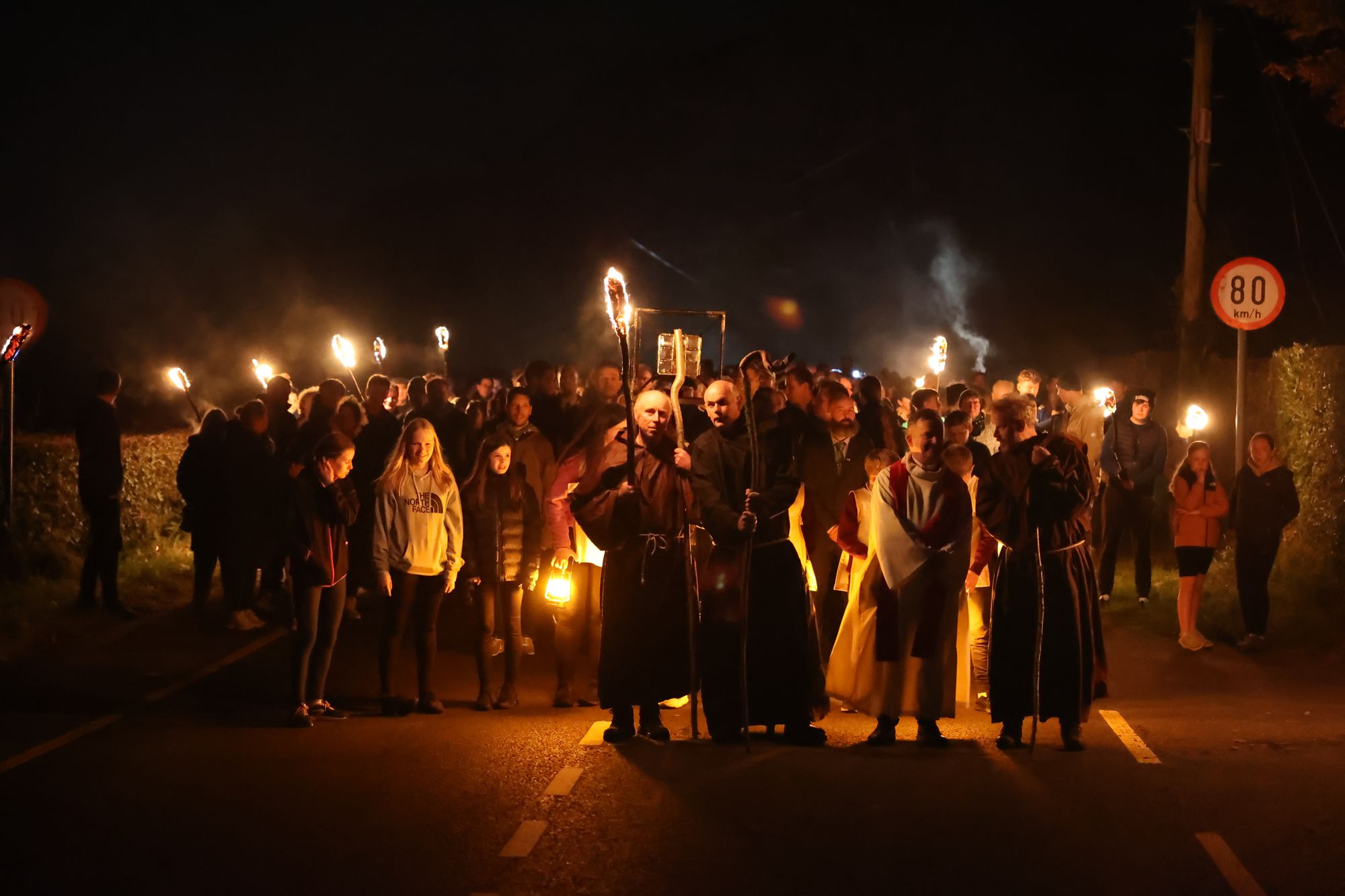 Am See setzen sich die drei Mönche an die Spitze der Gruppe. „Auf zur Kirche“, ruft der Mönch mit dem Bischofsstab. Die Jungen Herren der Würzburger Domsingknaben unter der Leitung von Domkapellmeister Alexander Rüth sorgen unter anderem mit dem irischen Halleluja für die musikalische Umrahmung. Alle paar Meter entfernt stehen links und rechts der Straße Frauen und Männer mit Fackeln und beleuchten so den Weg durch die Nacht. Insgesamt knapp drei Kilometer zieht die Prozession vom Ausgangspunkt zum Ziel. In der Kilianskirche von Mullagh wird der Schrein der Märtyrer aus dem Tragegestell genommen und vor dem Altar aufgestellt.