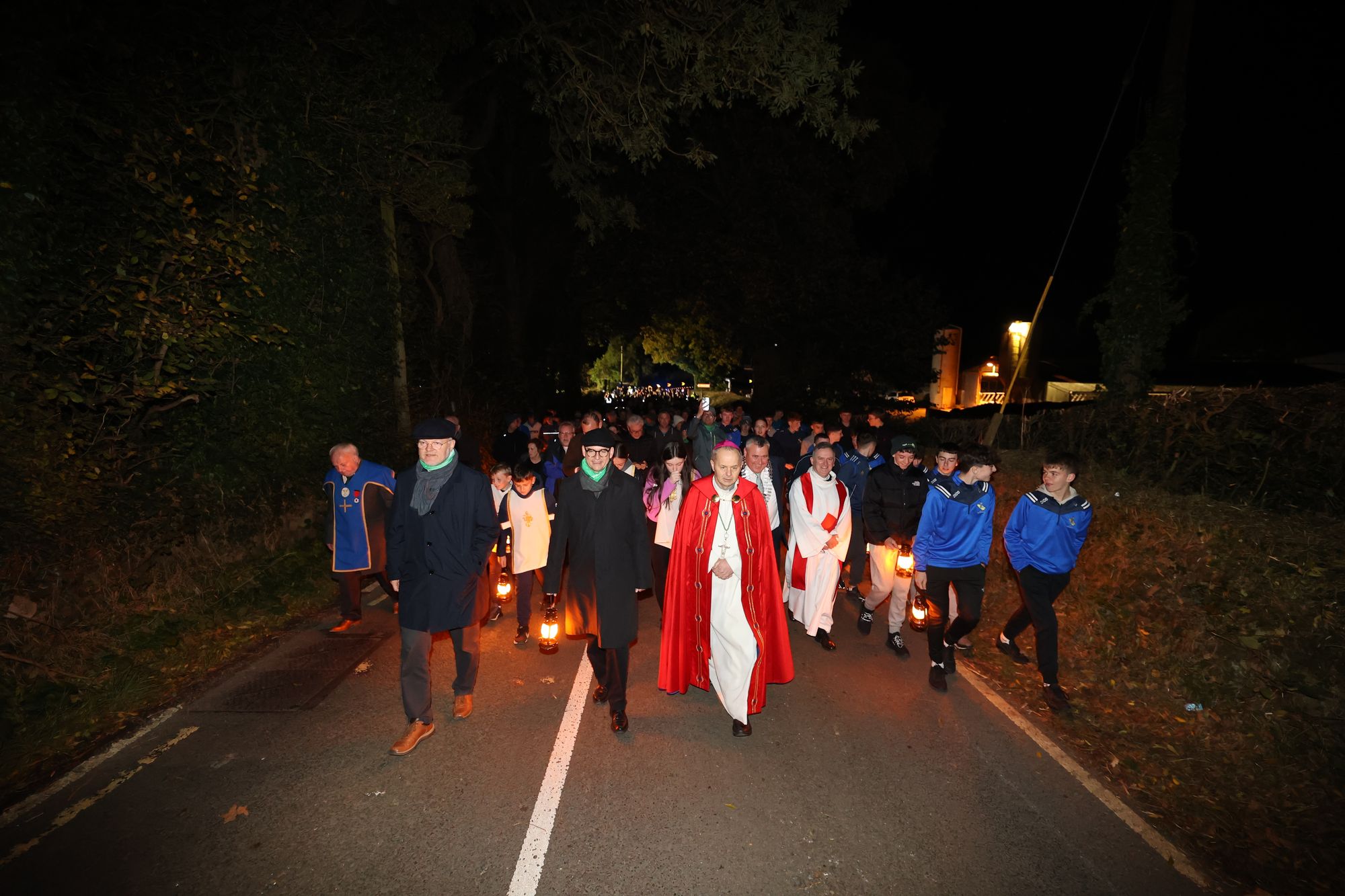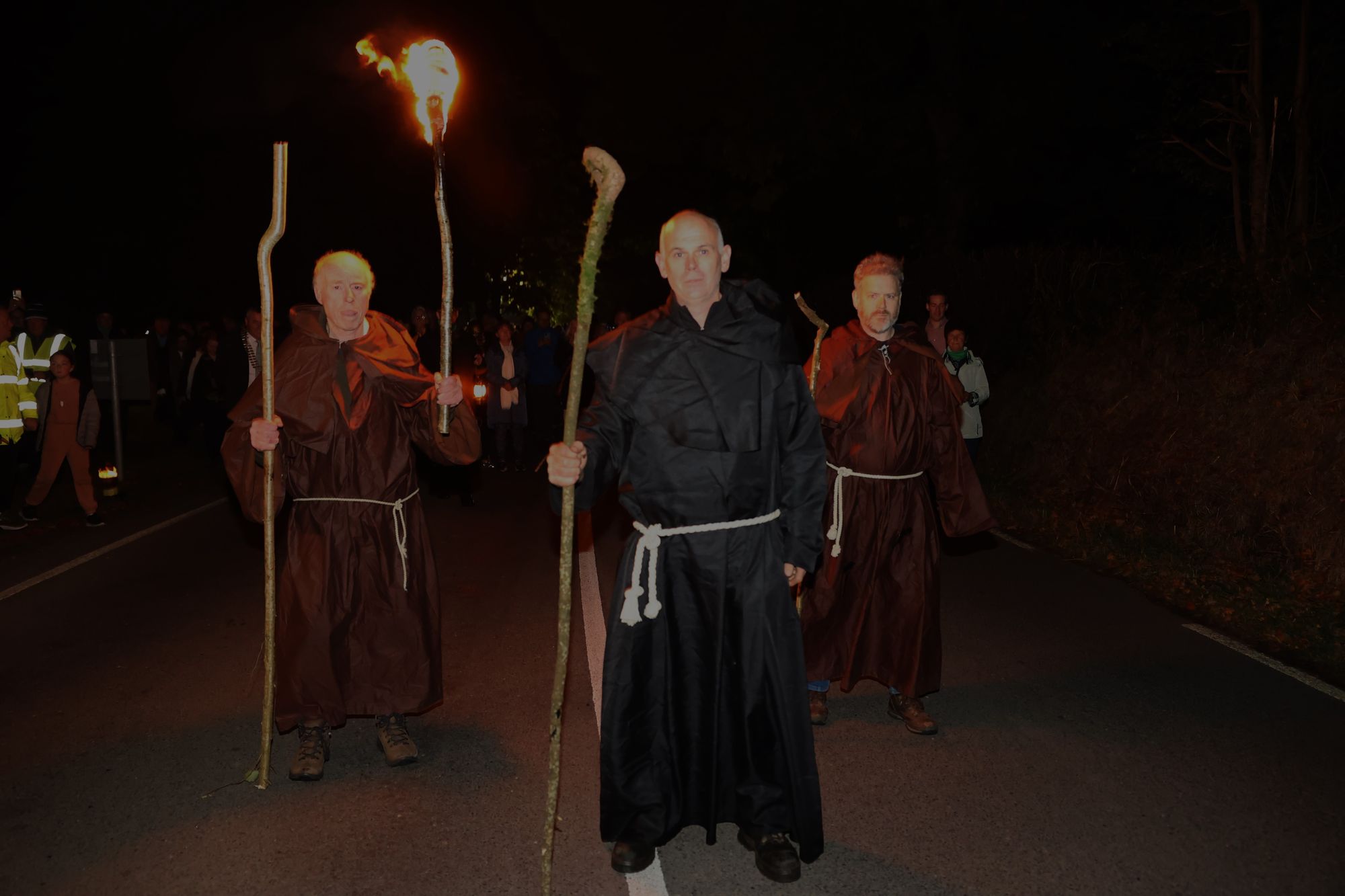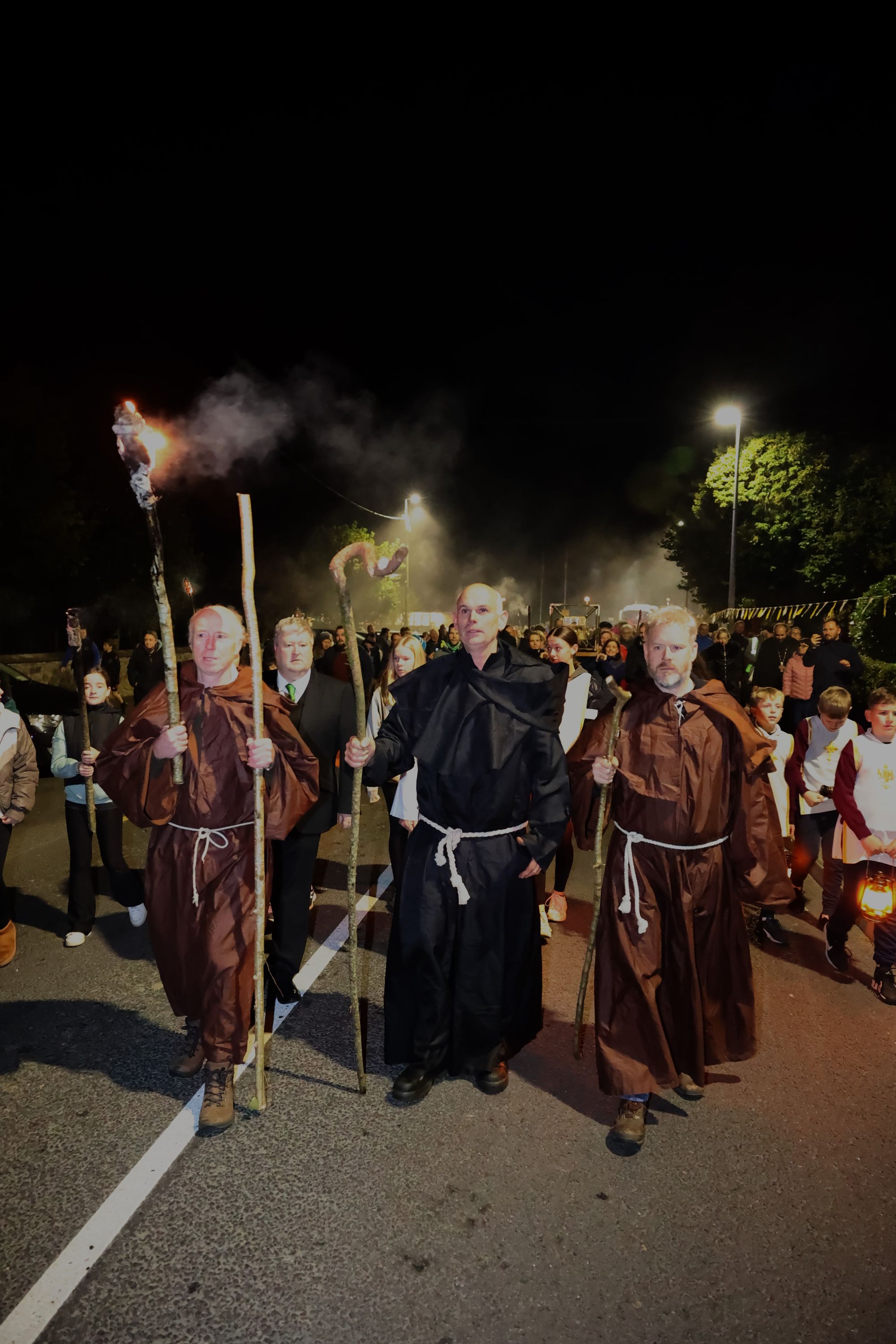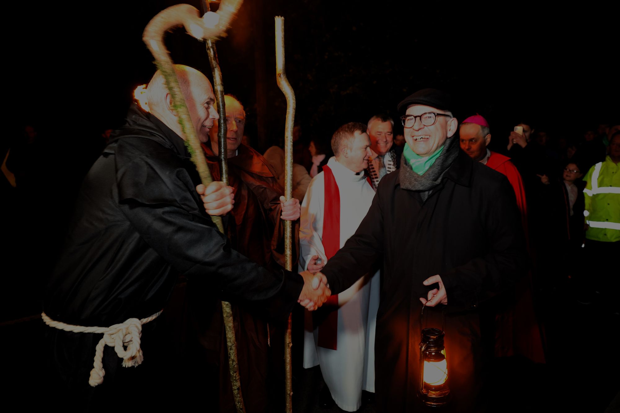 Am See setzen sich die drei Mönche an die Spitze der Gruppe. „Auf zur Kirche“, ruft der Mönch mit dem Bischofsstab. Die Jungen Herren der Würzburger Domsingknaben unter der Leitung von Domkapellmeister Alexander Rüth sorgen unter anderem mit dem irischen Halleluja für die musikalische Umrahmung. Alle paar Meter entfernt stehen links und rechts der Straße Frauen und Männer mit Fackeln und beleuchten so den Weg durch die Nacht. Insgesamt knapp drei Kilometer zieht die Prozession vom Ausgangspunkt zum Ziel. In der Kilianskirche von Mullagh wird der Schrein der Märtyrer aus dem Tragegestell genommen und vor dem Altar aufgestellt.