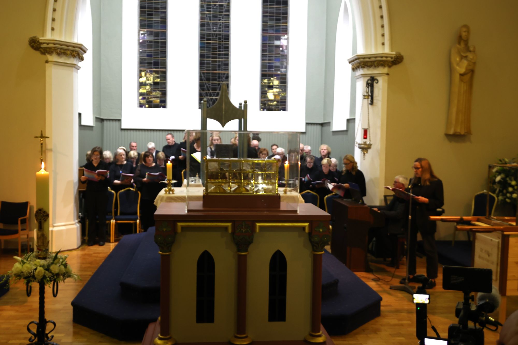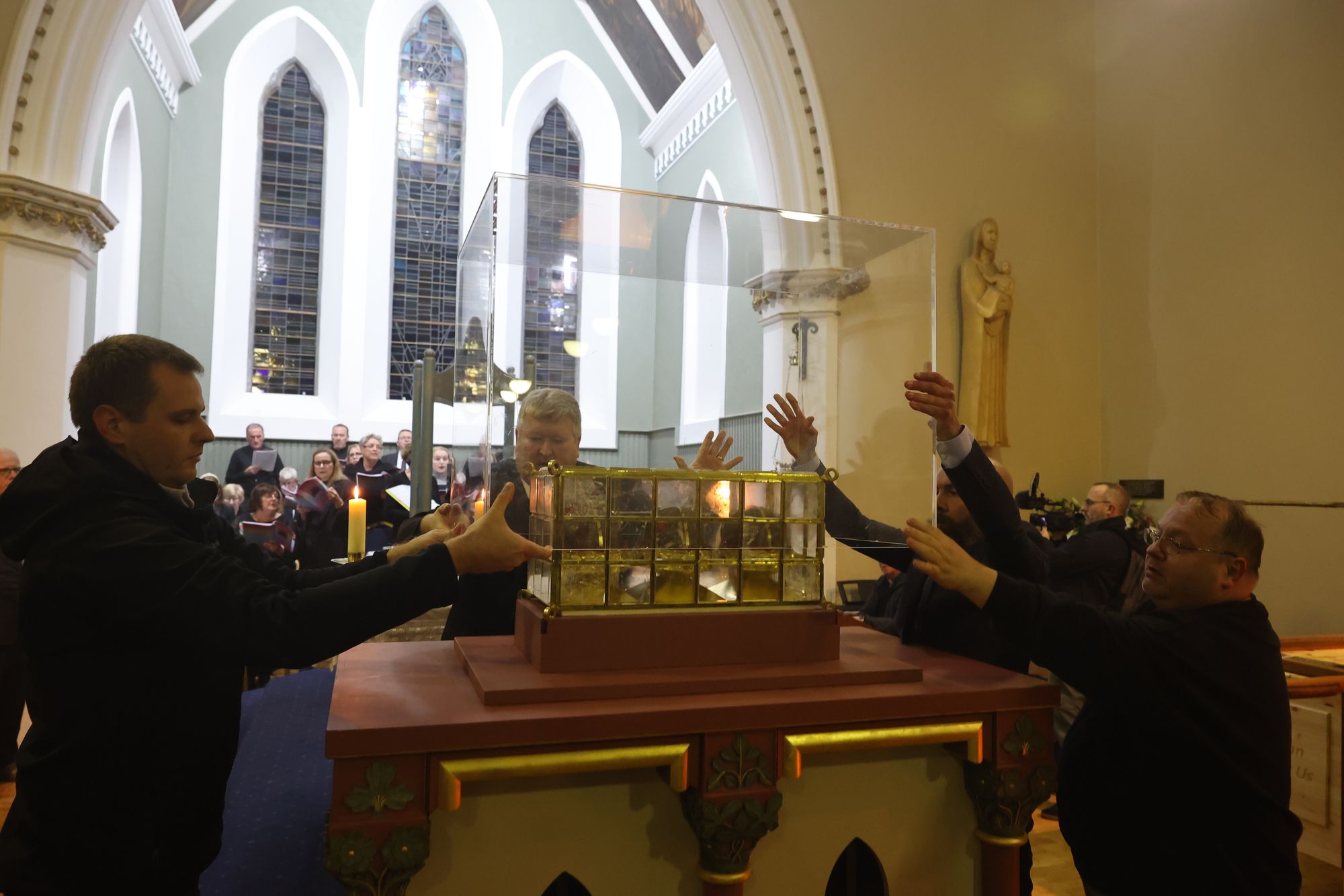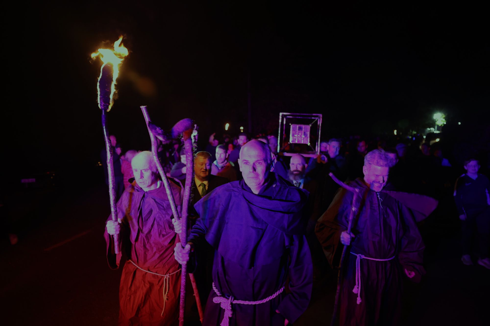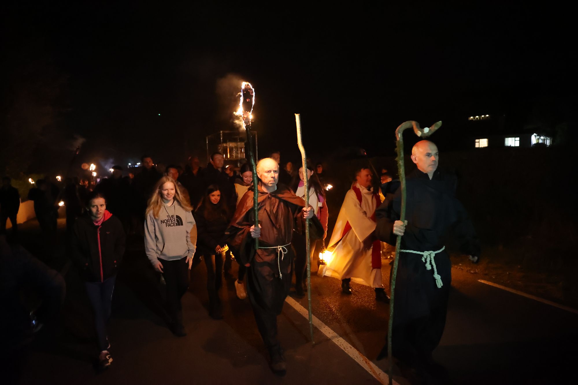 Am See setzen sich die drei Mönche an die Spitze der Gruppe. „Auf zur Kirche“, ruft der Mönch mit dem Bischofsstab. Die Jungen Herren der Würzburger Domsingknaben unter der Leitung von Domkapellmeister Alexander Rüth sorgen unter anderem mit dem irischen Halleluja für die musikalische Umrahmung. Alle paar Meter entfernt stehen links und rechts der Straße Frauen und Männer mit Fackeln und beleuchten so den Weg durch die Nacht. Insgesamt knapp drei Kilometer zieht die Prozession vom Ausgangspunkt zum Ziel. In der Kilianskirche von Mullagh wird der Schrein der Märtyrer aus dem Tragegestell genommen und vor dem Altar aufgestellt.