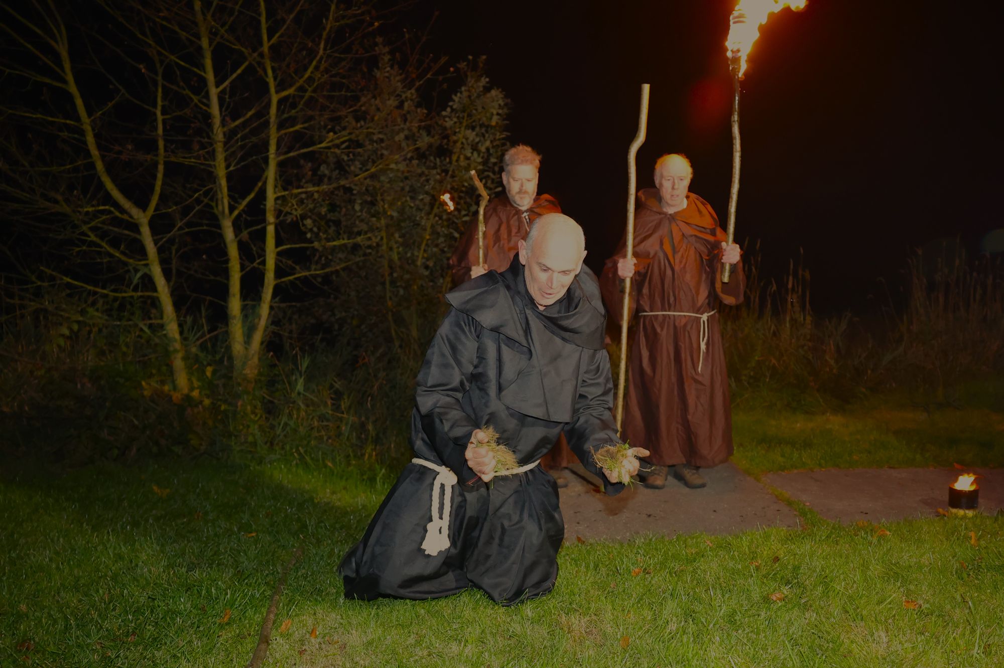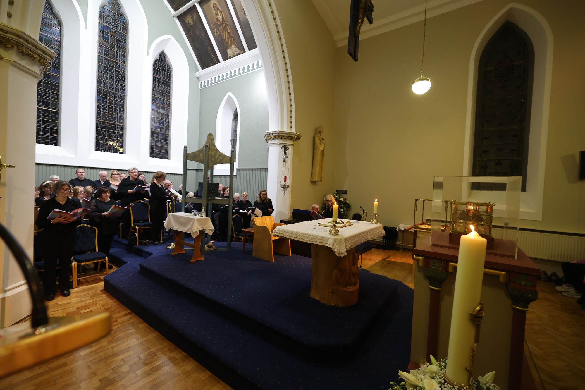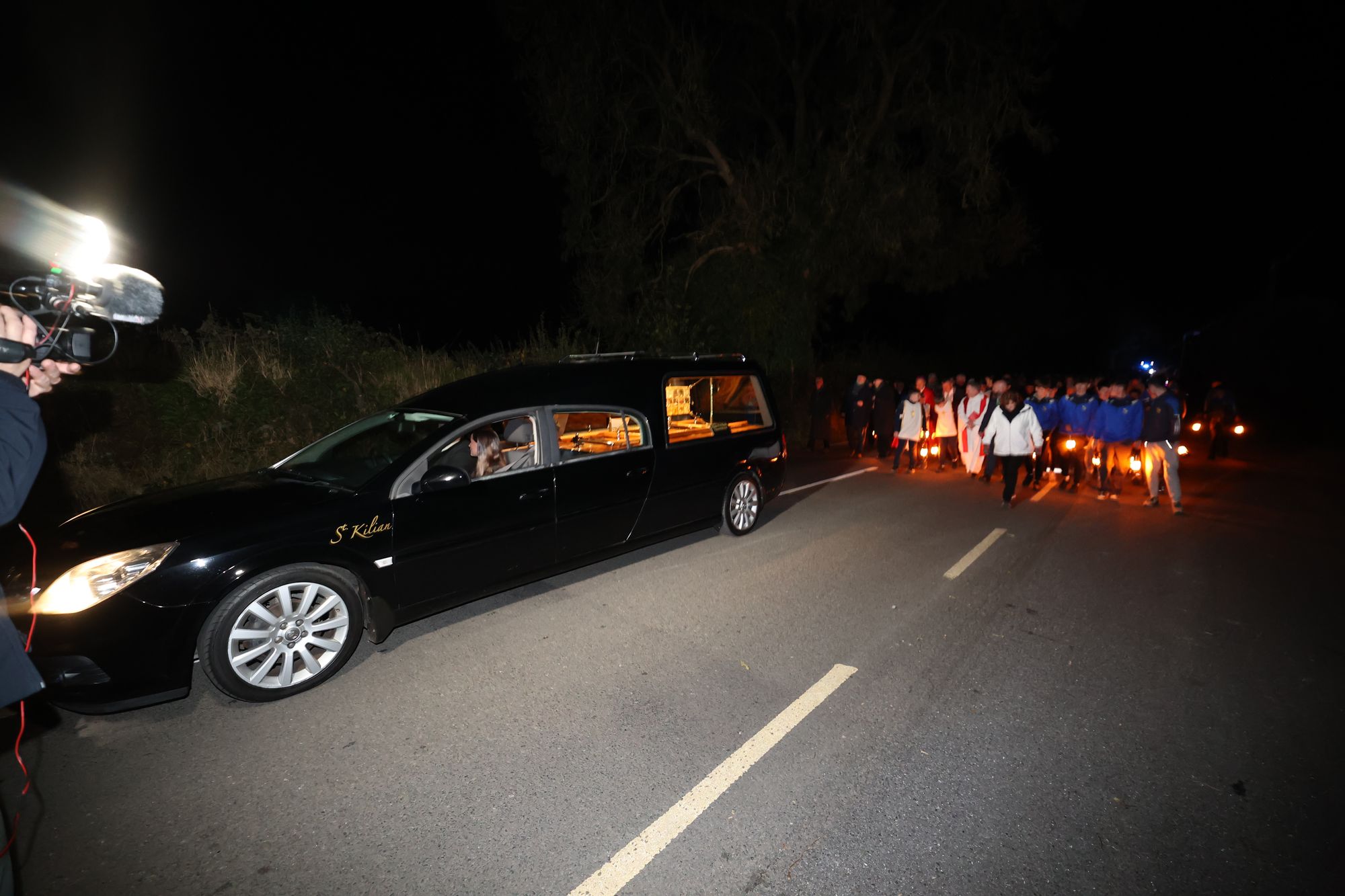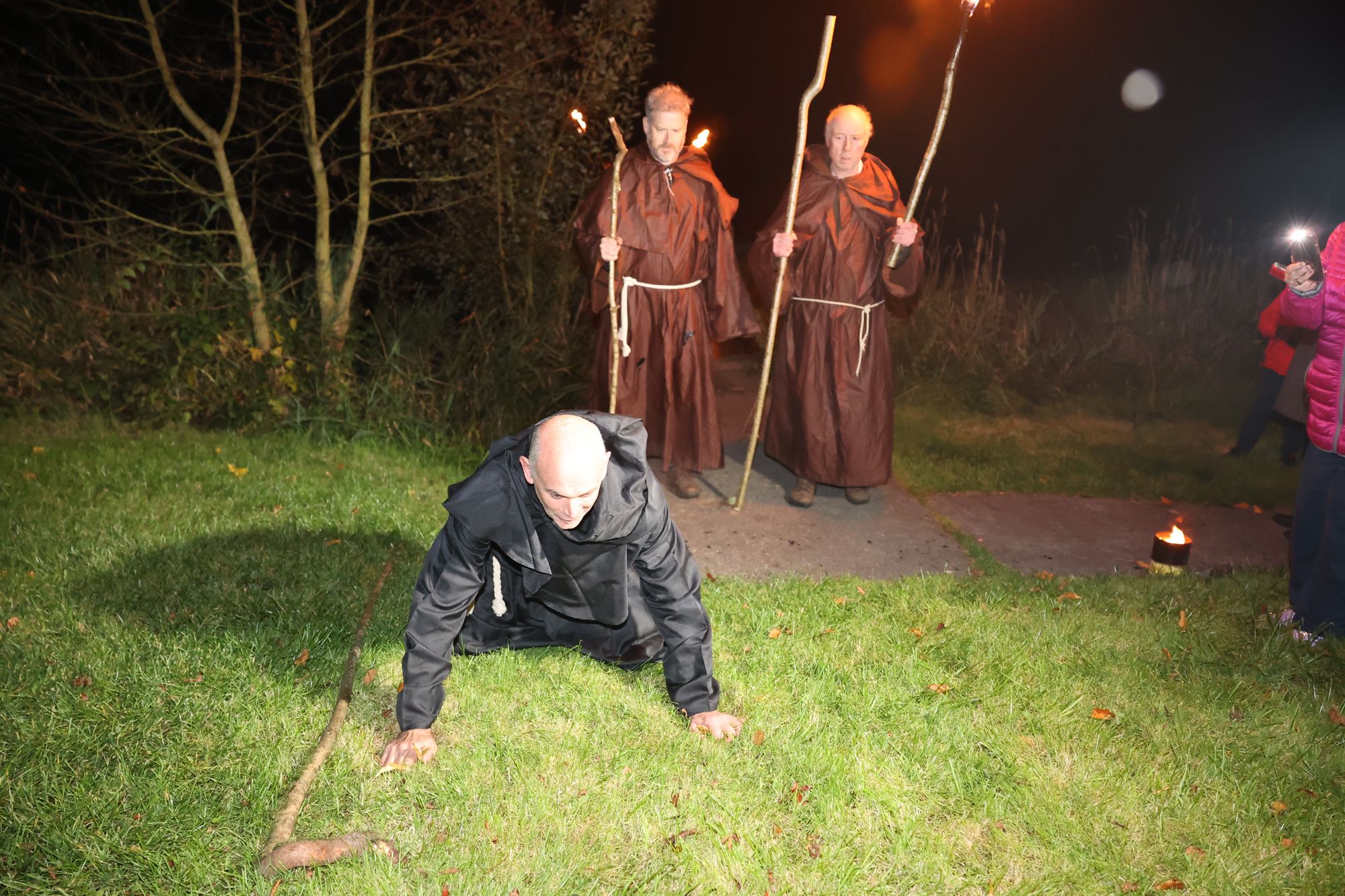 Am See setzen sich die drei Mönche an die Spitze der Gruppe. „Auf zur Kirche“, ruft der Mönch mit dem Bischofsstab. Die Jungen Herren der Würzburger Domsingknaben unter der Leitung von Domkapellmeister Alexander Rüth sorgen unter anderem mit dem irischen Halleluja für die musikalische Umrahmung. Alle paar Meter entfernt stehen links und rechts der Straße Frauen und Männer mit Fackeln und beleuchten so den Weg durch die Nacht. Insgesamt knapp drei Kilometer zieht die Prozession vom Ausgangspunkt zum Ziel. In der Kilianskirche von Mullagh wird der Schrein der Märtyrer aus dem Tragegestell genommen und vor dem Altar aufgestellt.
