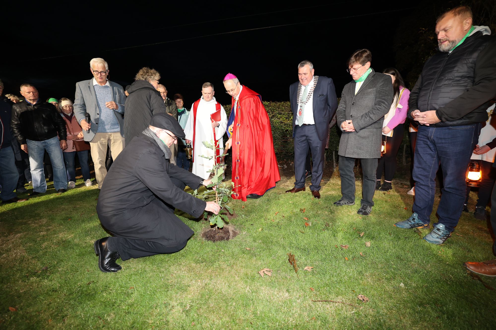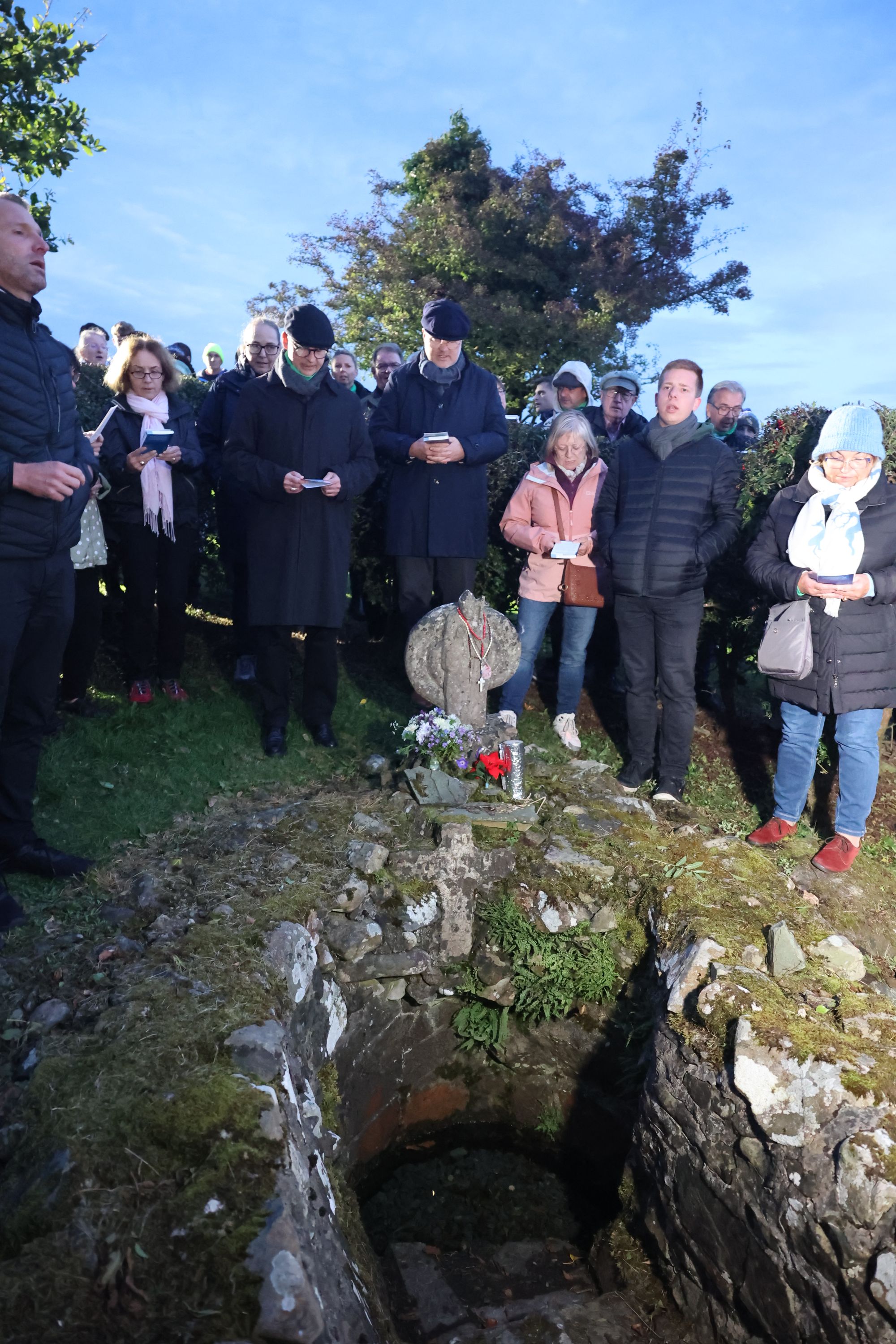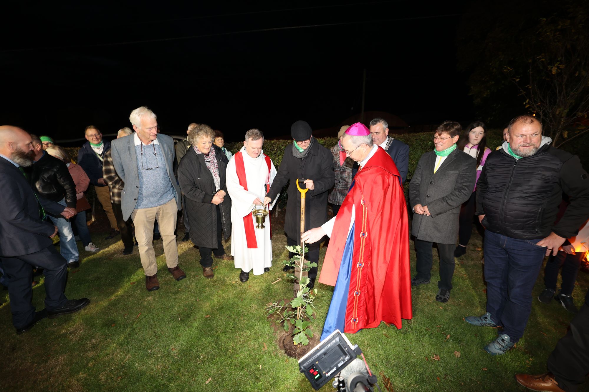 Knapp eine halbe Stunde zuvor haben sich etwa einen Kilometer vom See entfernt an diesem Donnerstagabend, 3. Oktober, die Würzburger Pilgergruppe und zahlreiche Irinnen und Iren an der von mobilen Scheinwerfern hell erleuchteten Sankt Kiliansquelle versammelt. Nicht nur wegen der Verbindung mit dem Frankenapostel ist die äußerlich unscheinbare Wasserstelle ein wichtiger Ort. Sie war auch für die Katholiken der Gegend ein wichtiger Versammlungsort, als während der englischen Besatzung jede öffentliche Ausübung des katholischen Glaubens untersagt war. Es erklingen das Kilianslied „Wir rufen an den teuren Mann“ und das von einem Iren verfasste Kiliansgebet. Darin heißt es: „Der See, der Hügel, und die Quelle in Mullagh, die Du geliebt und doch verlassen hast, erinnern uns bis heute an Deine mutige Pilgerschaft für Christus. Mögen Deine verbindende Reise und Dein heldenhaftes Martyrium uns im Geist erfüllen und tragen.“ Als Zeichen der Verbundenheit zwischen Deutschland und Irland pflanzen die Bischöfe Martin Hayes und Dr. Franz Jung einen jungen Eichenbaum, gezogen aus einem Samen aus Kürnach.