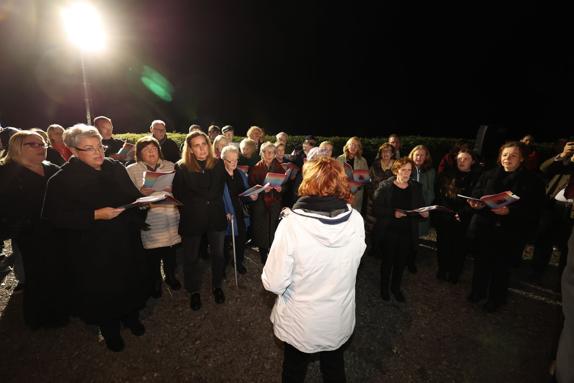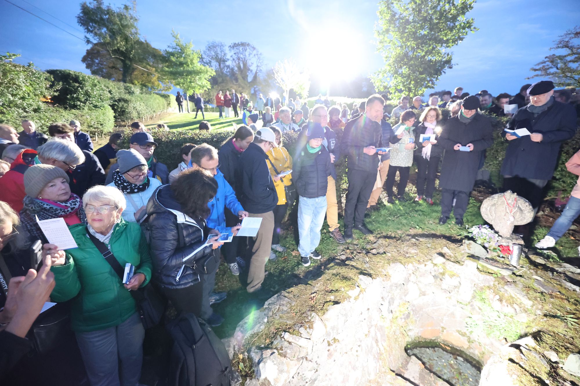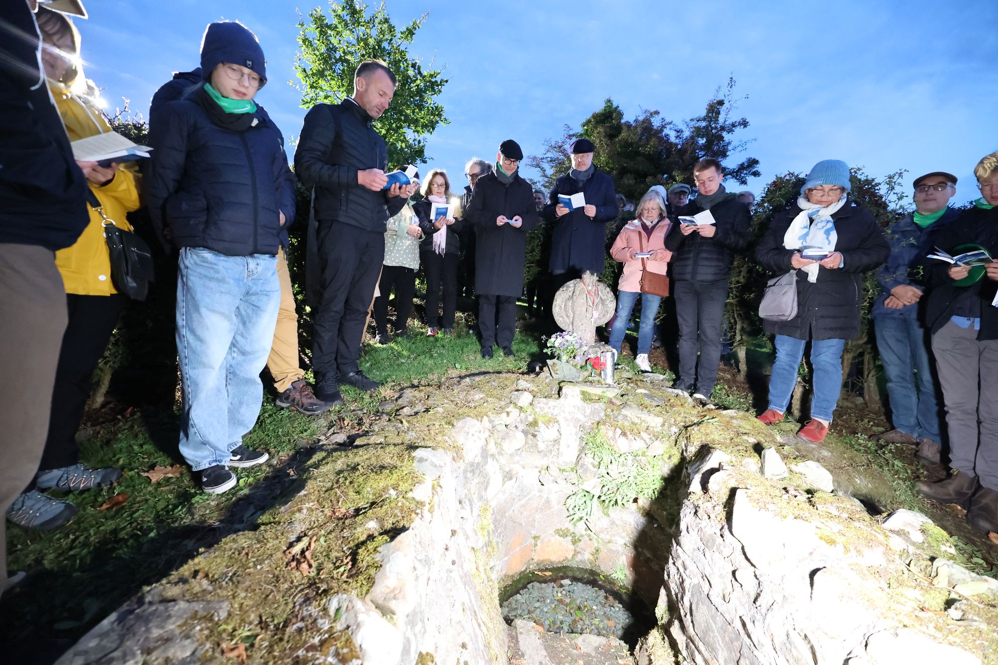 Knapp eine halbe Stunde zuvor haben sich etwa einen Kilometer vom See entfernt an diesem Donnerstagabend, 3. Oktober, die Würzburger Pilgergruppe und zahlreiche Irinnen und Iren an der von mobilen Scheinwerfern hell erleuchteten Sankt Kiliansquelle versammelt. Nicht nur wegen der Verbindung mit dem Frankenapostel ist die äußerlich unscheinbare Wasserstelle ein wichtiger Ort. Sie war auch für die Katholiken der Gegend ein wichtiger Versammlungsort, als während der englischen Besatzung jede öffentliche Ausübung des katholischen Glaubens untersagt war. Es erklingen das Kilianslied „Wir rufen an den teuren Mann“ und das von einem Iren verfasste Kiliansgebet. Darin heißt es: „Der See, der Hügel, und die Quelle in Mullagh, die Du geliebt und doch verlassen hast, erinnern uns bis heute an Deine mutige Pilgerschaft für Christus. Mögen Deine verbindende Reise und Dein heldenhaftes Martyrium uns im Geist erfüllen und tragen.“ Als Zeichen der Verbundenheit zwischen Deutschland und Irland pflanzen die Bischöfe Martin Hayes und Dr. Franz Jung einen jungen Eichenbaum, gezogen aus einem Samen aus Kürnach.