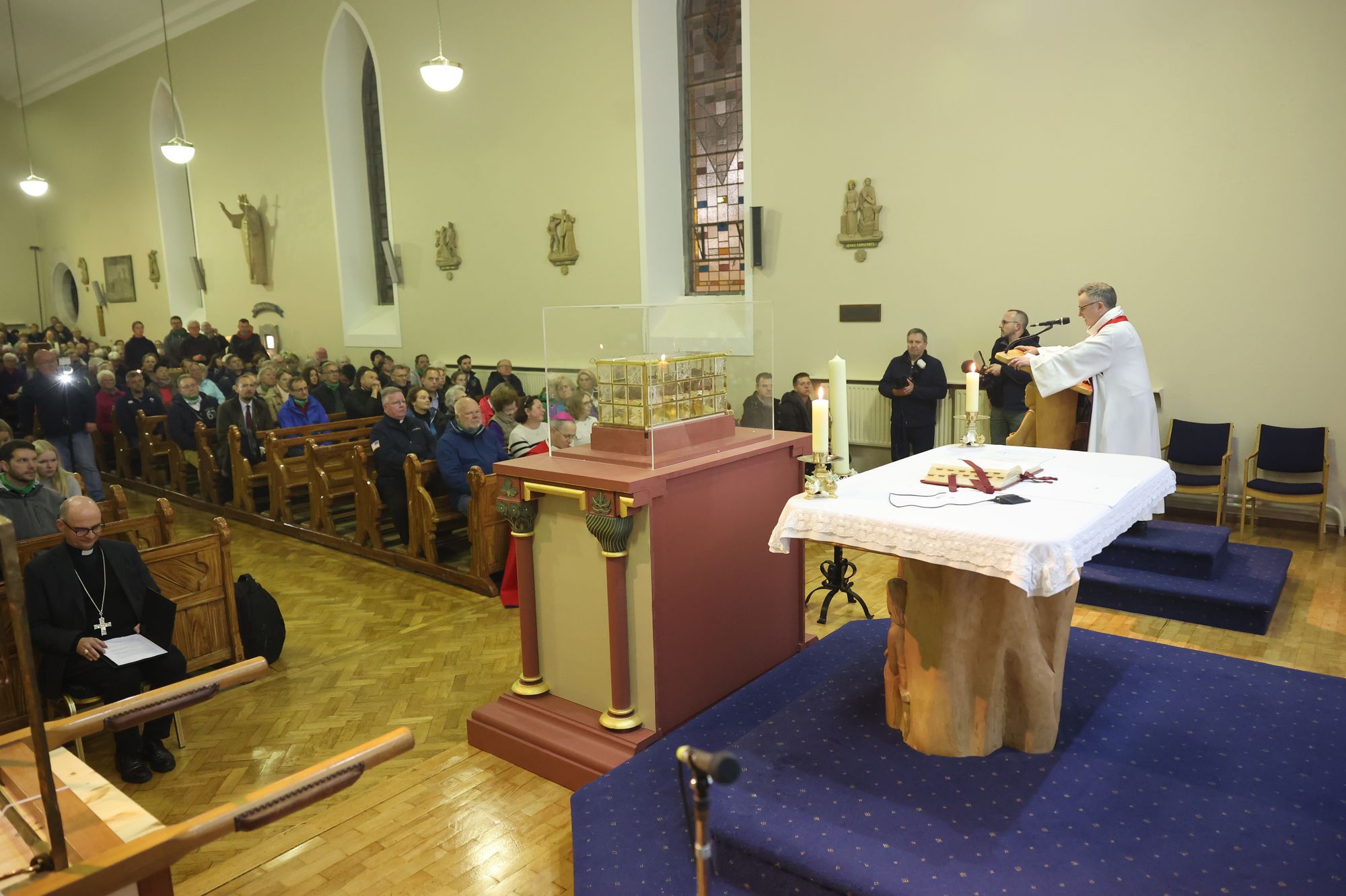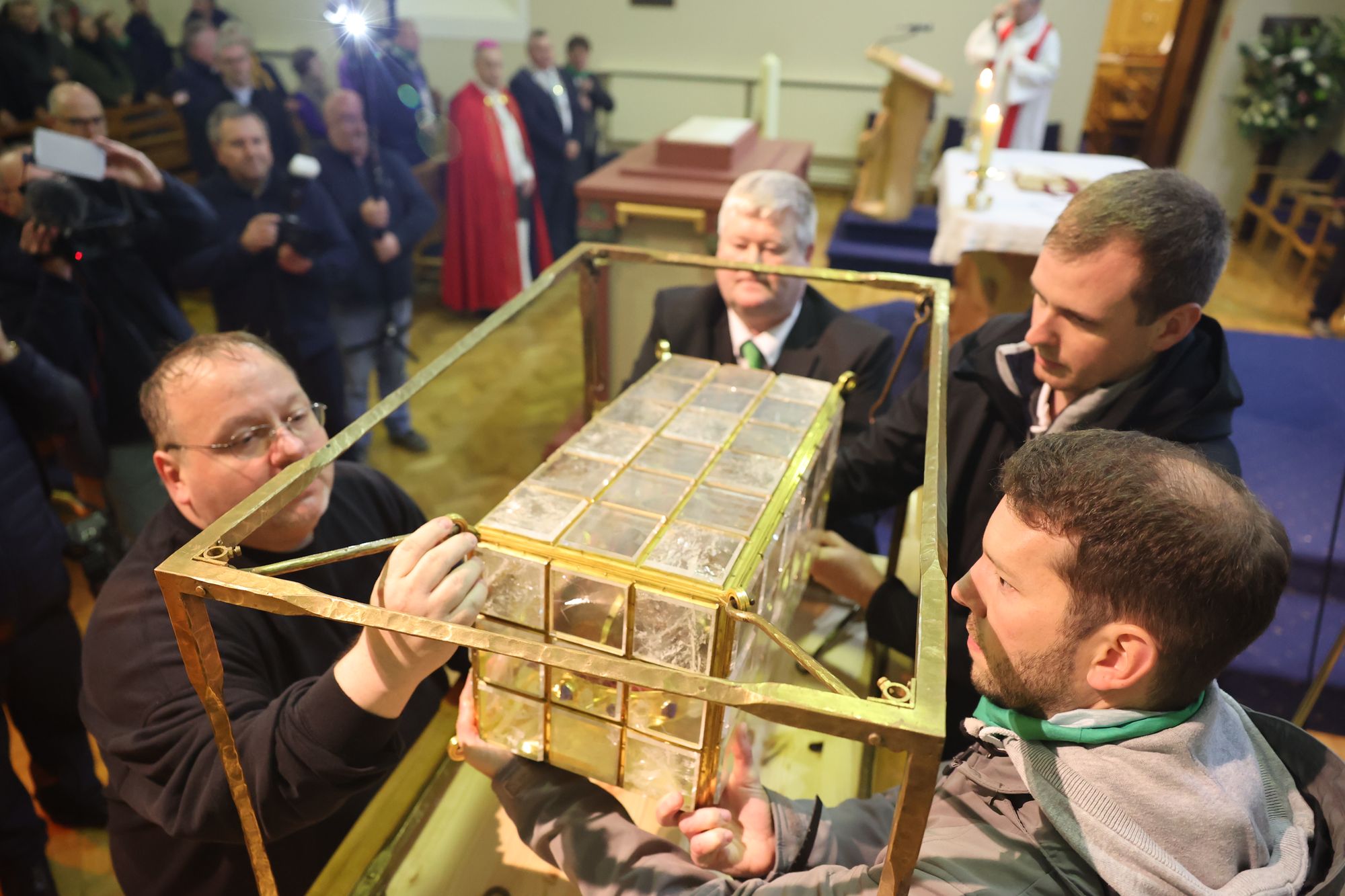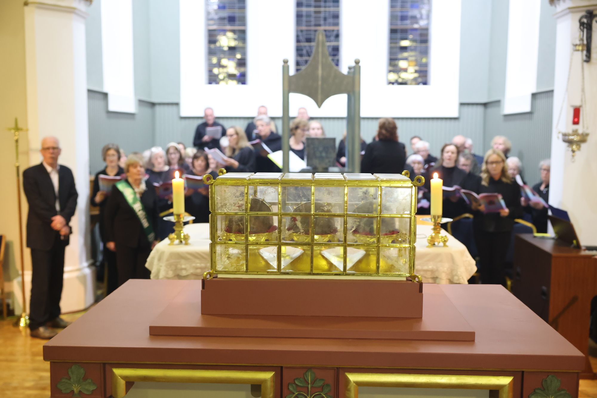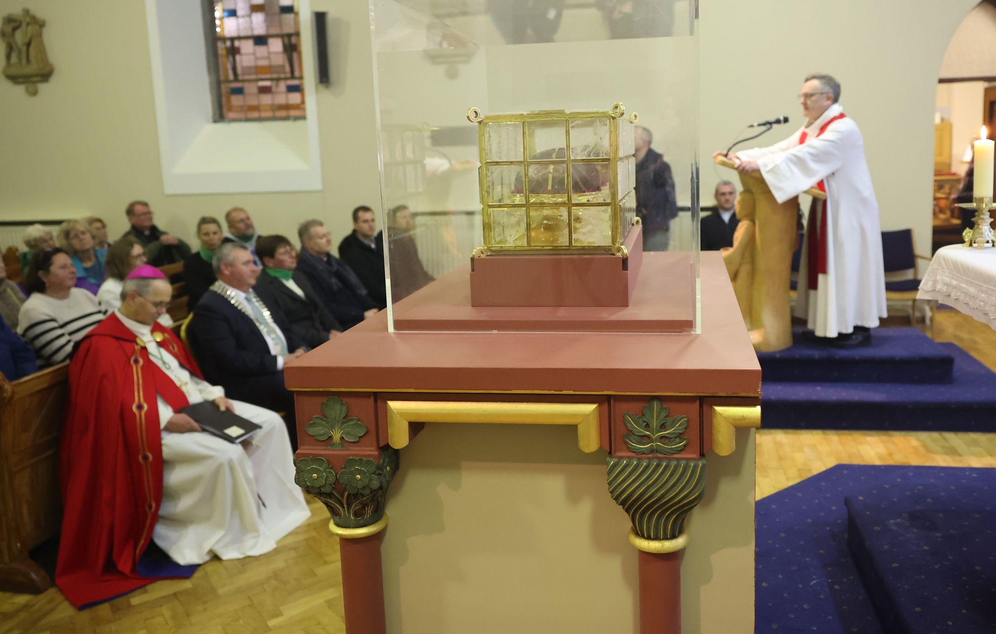 „Uns erfüllt heute eine besondere feierliche Stimmung. Kilian ist mit seinen Gefährten nach Hause zurückgekehrt. Heute sind wir alle Sankt Kilian“, sagt Father Prior. Die Hoffnung, dass Gott den Menschen Glauben und Mut schenkt, verbinde die Menschen der Gegenwart mit dem Frankenapostel und seinen Gefährten. Bischof Hayes legt in seiner Predigt die Berufung der Jünger Jesu am See Genesareth aus. „Wie die Jünger sind wir aufgerufen, uns mit Jesus auf den Weg zu machen, auch wenn wir nicht wissen, was uns unterwegs erwartet.“ Das bedeute auch, den Nächsten vorbehaltlos auf der Pilgerschaft zu begleiten. „Dazu fordert uns Papst Franziskus auf“, betont Bischof Hayes. Schließlich dankt er Bischof Jung, dem Würzburger Domkapitel und der ganzen Diözese Würzburg, die den lang gehegten Wunsch der Rückkehr der Reliquien Kilians und seiner Gefährten nach Mullagh ermöglicht haben.