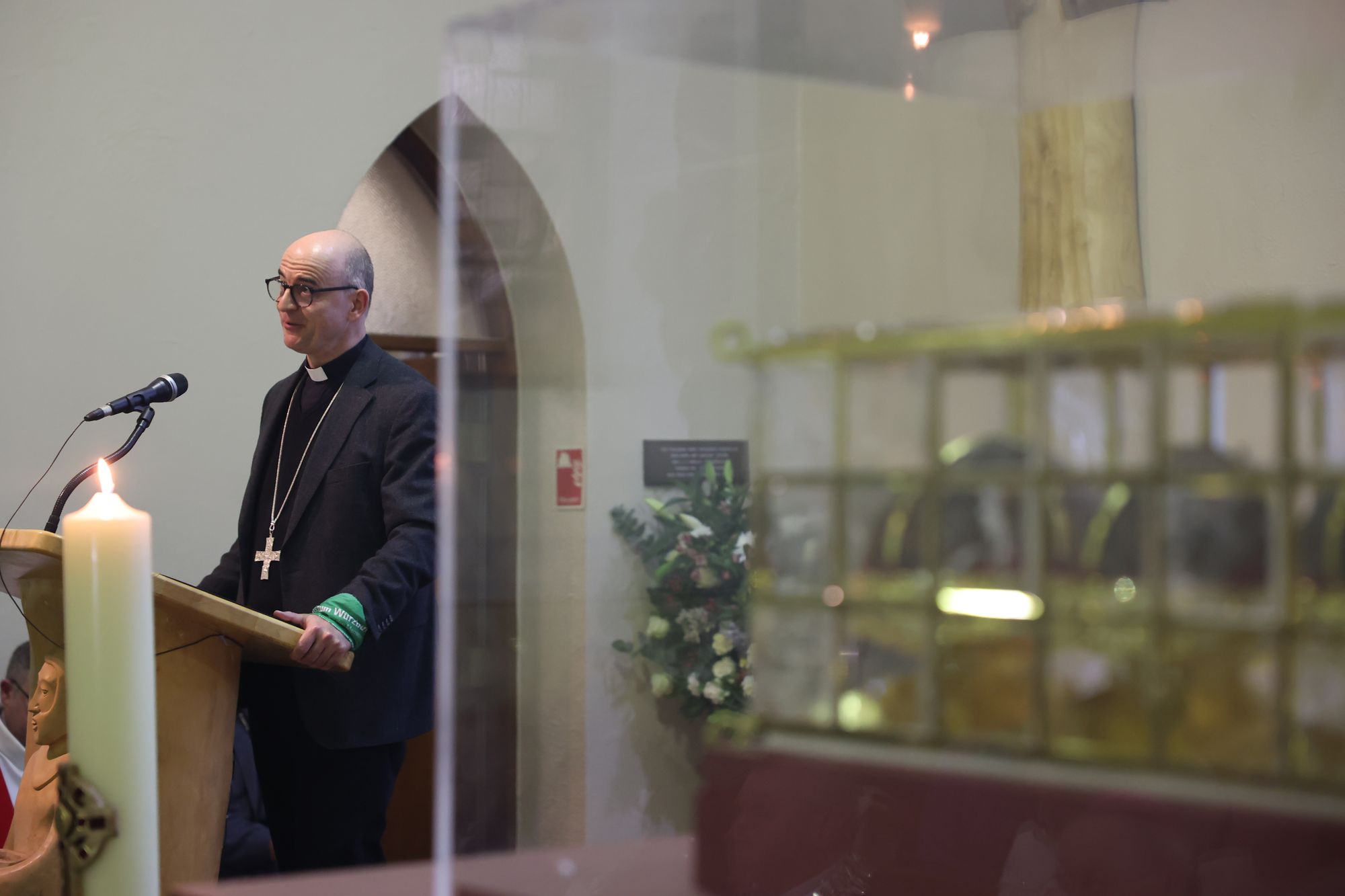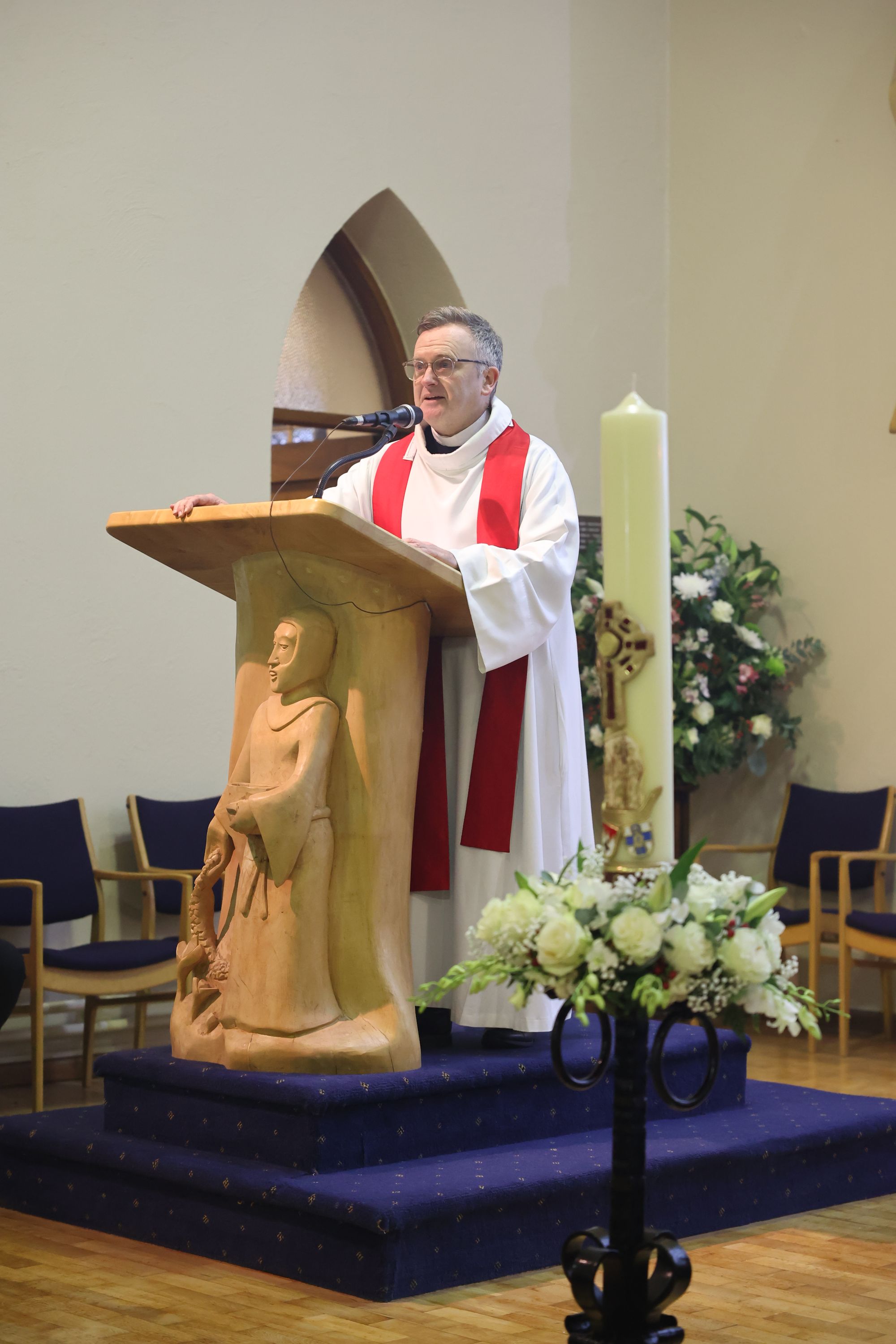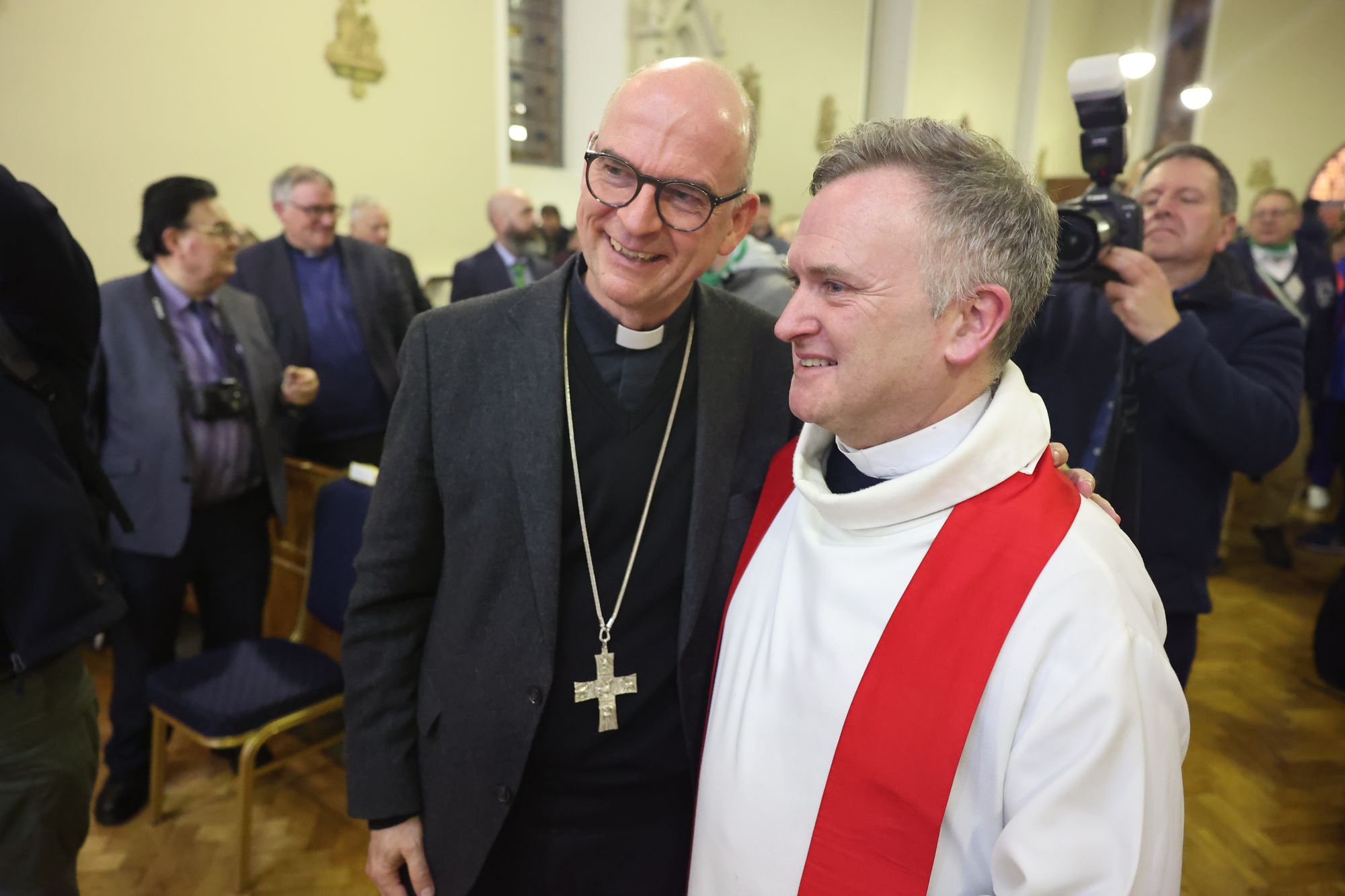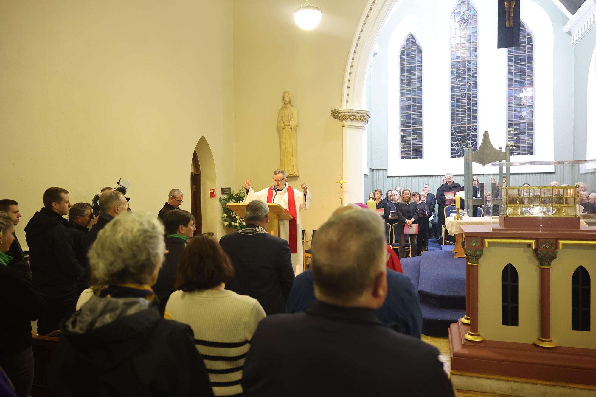 „Uns erfüllt heute eine besondere feierliche Stimmung. Kilian ist mit seinen Gefährten nach Hause zurückgekehrt. Heute sind wir alle Sankt Kilian“, sagt Father Prior. Die Hoffnung, dass Gott den Menschen Glauben und Mut schenkt, verbinde die Menschen der Gegenwart mit dem Frankenapostel und seinen Gefährten. Bischof Hayes legt in seiner Predigt die Berufung der Jünger Jesu am See Genesareth aus. „Wie die Jünger sind wir aufgerufen, uns mit Jesus auf den Weg zu machen, auch wenn wir nicht wissen, was uns unterwegs erwartet.“ Das bedeute auch, den Nächsten vorbehaltlos auf der Pilgerschaft zu begleiten. „Dazu fordert uns Papst Franziskus auf“, betont Bischof Hayes. Schließlich dankt er Bischof Jung, dem Würzburger Domkapitel und der ganzen Diözese Würzburg, die den lang gehegten Wunsch der Rückkehr der Reliquien Kilians und seiner Gefährten nach Mullagh ermöglicht haben.