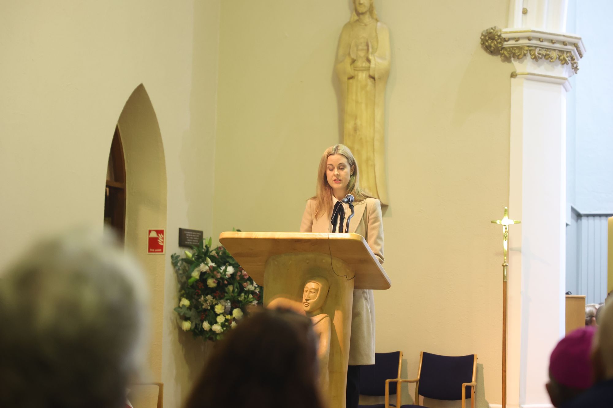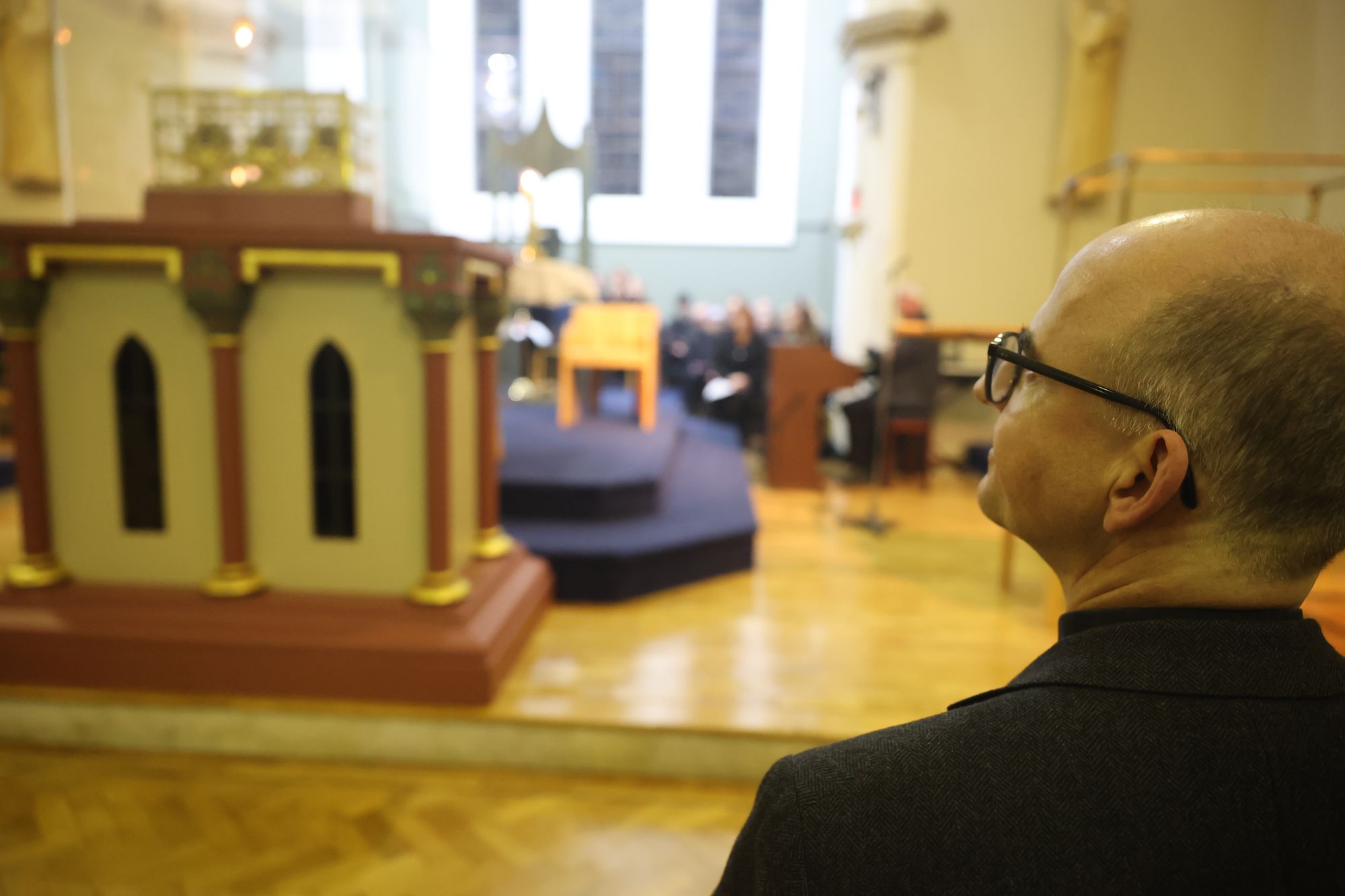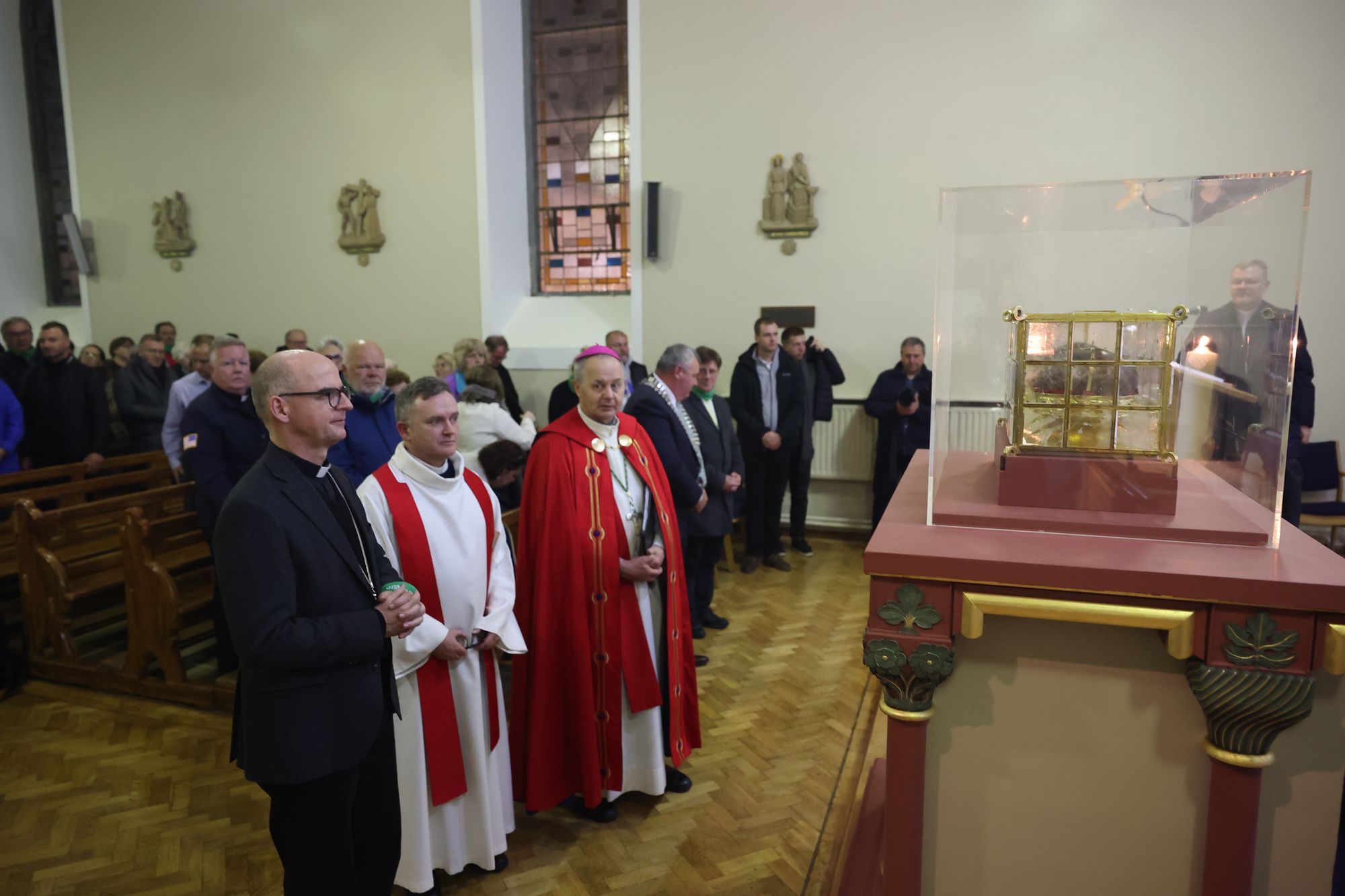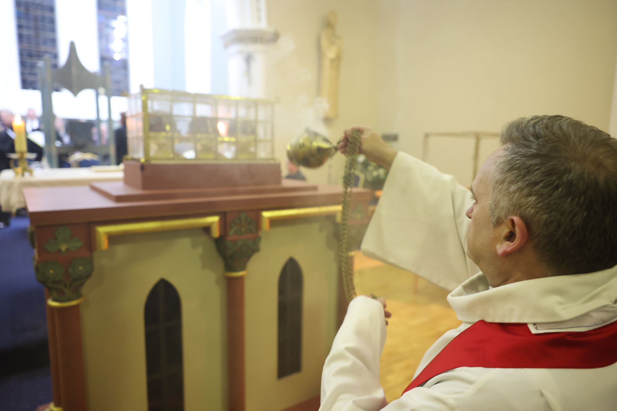 „Uns erfüllt heute eine besondere feierliche Stimmung. Kilian ist mit seinen Gefährten nach Hause zurückgekehrt. Heute sind wir alle Sankt Kilian“, sagt Father Prior. Die Hoffnung, dass Gott den Menschen Glauben und Mut schenkt, verbinde die Menschen der Gegenwart mit dem Frankenapostel und seinen Gefährten. Bischof Hayes legt in seiner Predigt die Berufung der Jünger Jesu am See Genesareth aus. „Wie die Jünger sind wir aufgerufen, uns mit Jesus auf den Weg zu machen, auch wenn wir nicht wissen, was uns unterwegs erwartet.“ Das bedeute auch, den Nächsten vorbehaltlos auf der Pilgerschaft zu begleiten. „Dazu fordert uns Papst Franziskus auf“, betont Bischof Hayes. Schließlich dankt er Bischof Jung, dem Würzburger Domkapitel und der ganzen Diözese Würzburg, die den lang gehegten Wunsch der Rückkehr der Reliquien Kilians und seiner Gefährten nach Mullagh ermöglicht haben.