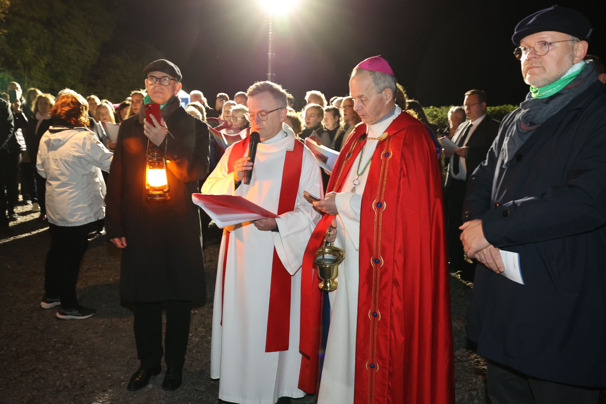 Bischof Jung greift den Ball auf und betont in seiner englischsprachigen Ansprache: „Wir alle haben diesen emotionalen Moment lange herbeigesehnt.“ Diese Nacht sei eine besondere Gelegenheit, den Märtyrern für die besondere Gemeinschaft zu danken, die sie geschenkt hätten. „Es ist die Gemeinschaft in Christus, die sie in Wort und Tat verkündet und mit ihrem Blut besiegelt haben.“ Die Schutzpatrone Kilian, Kolonat und Totnan brächten nicht nur an diesem Abend Menschen unterschiedlicher Nation, Kultur und sozialer Stellung zusammen. „Wir versammeln uns an See, Berg und Quelle, die sie so sehr geliebt haben. Möge dieses Gedenken unsere Liebe zu Christus stärken und uns zu gläubigen und treuen Missionaren seiner frohen Botschaft machen.“ Noch einmal erklingt das Kilianslied, diesmal vom Pfarreichor im Wechsel in irischer und deutscher Sprache gesungen. Als Zeichen der Verbundenheit von Franken und Iren entzünden die beiden Bischöfe eine Kerze, auf der die Frankenapostel in einem Boot abgebildet sind.