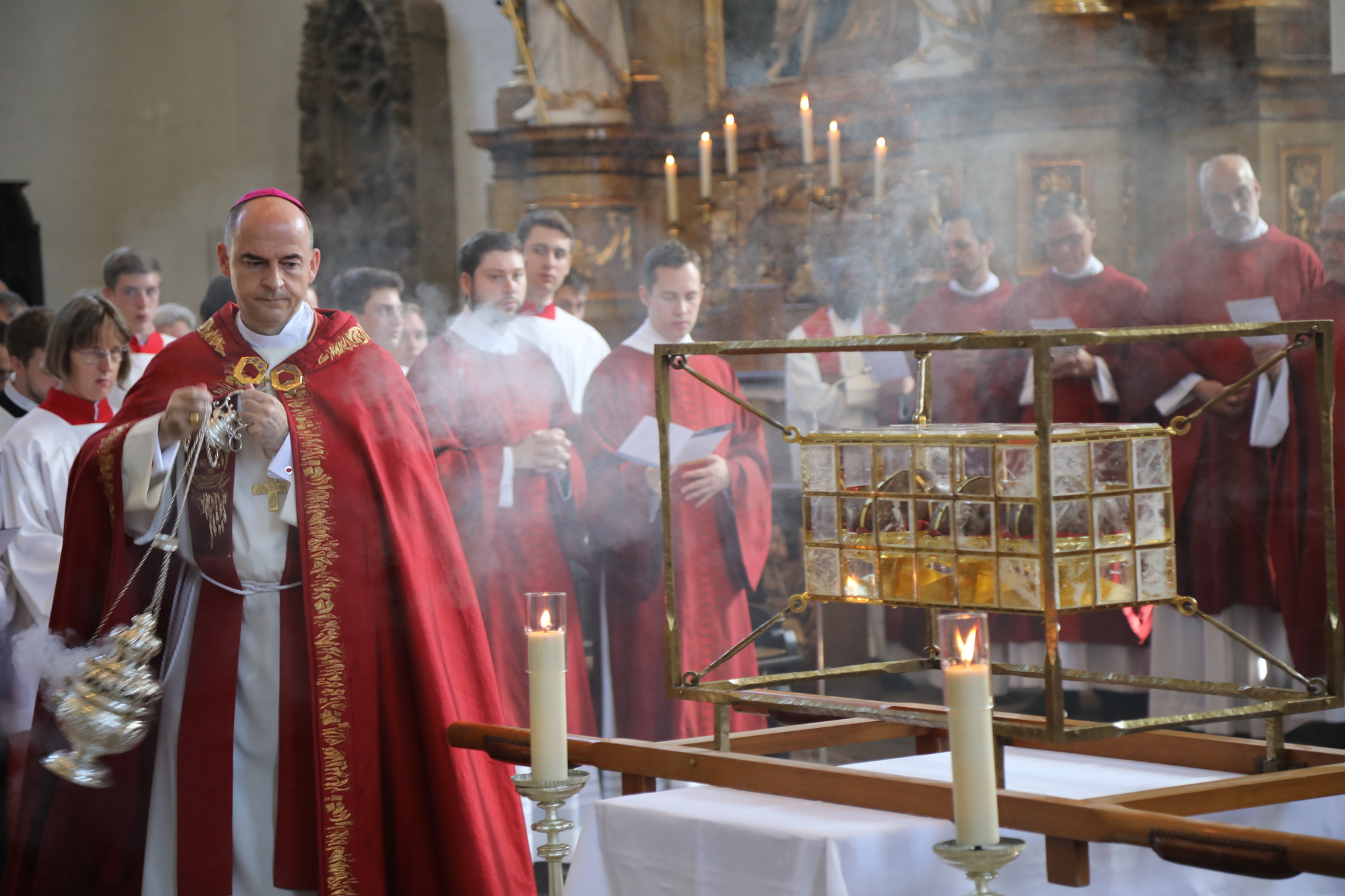 Die Prozession mit den Häuptern der Frankenapostel begann am Sonntagmorgen mit einer Statio in Sankt Burkard. Dort erinnerte Bischof Jung daran, wie wichtig es sei, auf die Frankenapostel zu blicken, die den Glauben nach Unterfranken brachten. „Lassen wir uns immer neu von ihnen in die Pflicht nehmen, für diesen Glauben einzustehen.“ Den Zug zum Dom begleiteten bei Sonnenschein und sommerlichen Temperaturen Weihbischof Dompropst Ulrich Boom, Vertreter des Domkapitels, Mitglieder des Diözesanrats sowie des Würzburger Stadtrats, außerdem Familiaren des Deutschen Ordens, Ritter vom Heiligen Grab sowie Verbände, Vereine, Studentenverbindungen und Innungen. Den Reliquienschrein trugen Priesterseminaristen und Mitglieder der Freiwilligen Feuerwehr Würzburg abwechselnd. Während der Kiliani-Wallfahrtswoche sind die Häupter der drei Frankenapostel in einem Schrein vor dem Altar des Kiliansdoms aufgestellt.