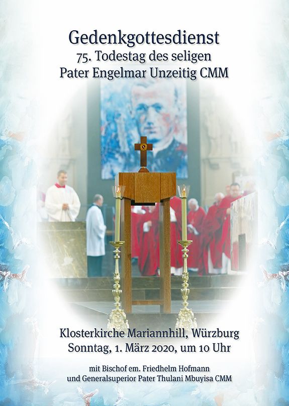 Pater Engelmar Unzeitig wurde als Hubert Unzeitig am 1. März 1911 in Greifendorf in Ostmähren geboren. Am 18. April 1928 begann er seine Ausbildung an der Mariannhiller Schule in Reimlingen und legte im April 1934 sein Abitur ab. Noch im gleichen Monat begann er im Missionshaus Sankt Paul in den Niederlanden sein Noviziat und erhielt den Namen Frater Engelmar. In Würzburg studierte er Philosophie und Theologie und empfing am 6. August 1939 von Bischof Matthias Ehrenfried die Priesterweihe. Danach wirkte Unzeitig als Pfarrer in Glöckelberg im Böhmerwald. Weil er im Religionsunterricht und in seinen Predigten gegen die Verfolgung der Juden durch die Nationalsozialisten protestierte, wurde er 1941 durch die Gestapo verhaftet und in das Konzentrationslager Dachau gebracht. Freiwillig meldete er sich dort 1944 zur Pflege von Flecktyphus-Kranken. Hunderten von Todkranken spendete er die Sakramente. Mitgefangene rettete er vor dem Hungertod, indem er ihnen von seiner Essensration gab. Mithäftlinge bezeichneten ihn als „Engel von Dachau“. Unzeitig starb am 2. März 1945 an Flecktyphus. Seine Asche wurde aus dem Konzentrationslager geschmuggelt und auf dem Würzburger Hauptfriedhof beigesetzt. Seit 1968 war die Urne in einer Seitenkapelle der Mariannhiller Herz-Jesu-Kirche in Würzburg bestattet. Am 24. September 2016 wurde Unzeitig bei einem festlichen Gottesdienst im Würzburger Kiliansdom seliggesprochen.