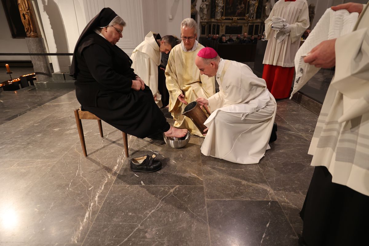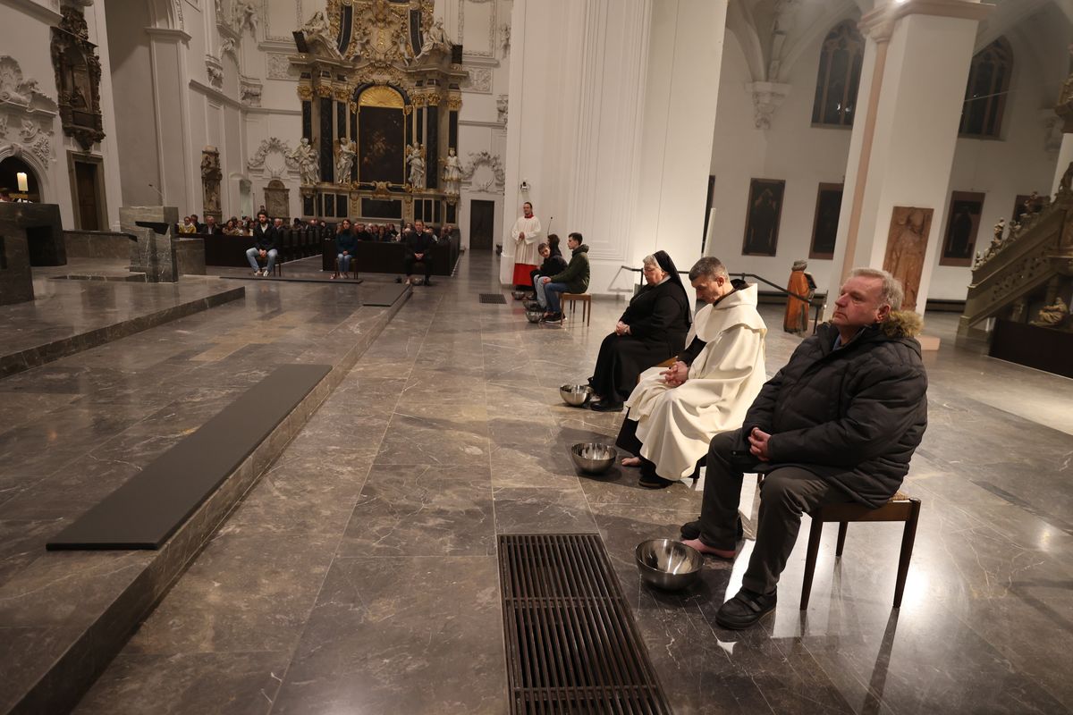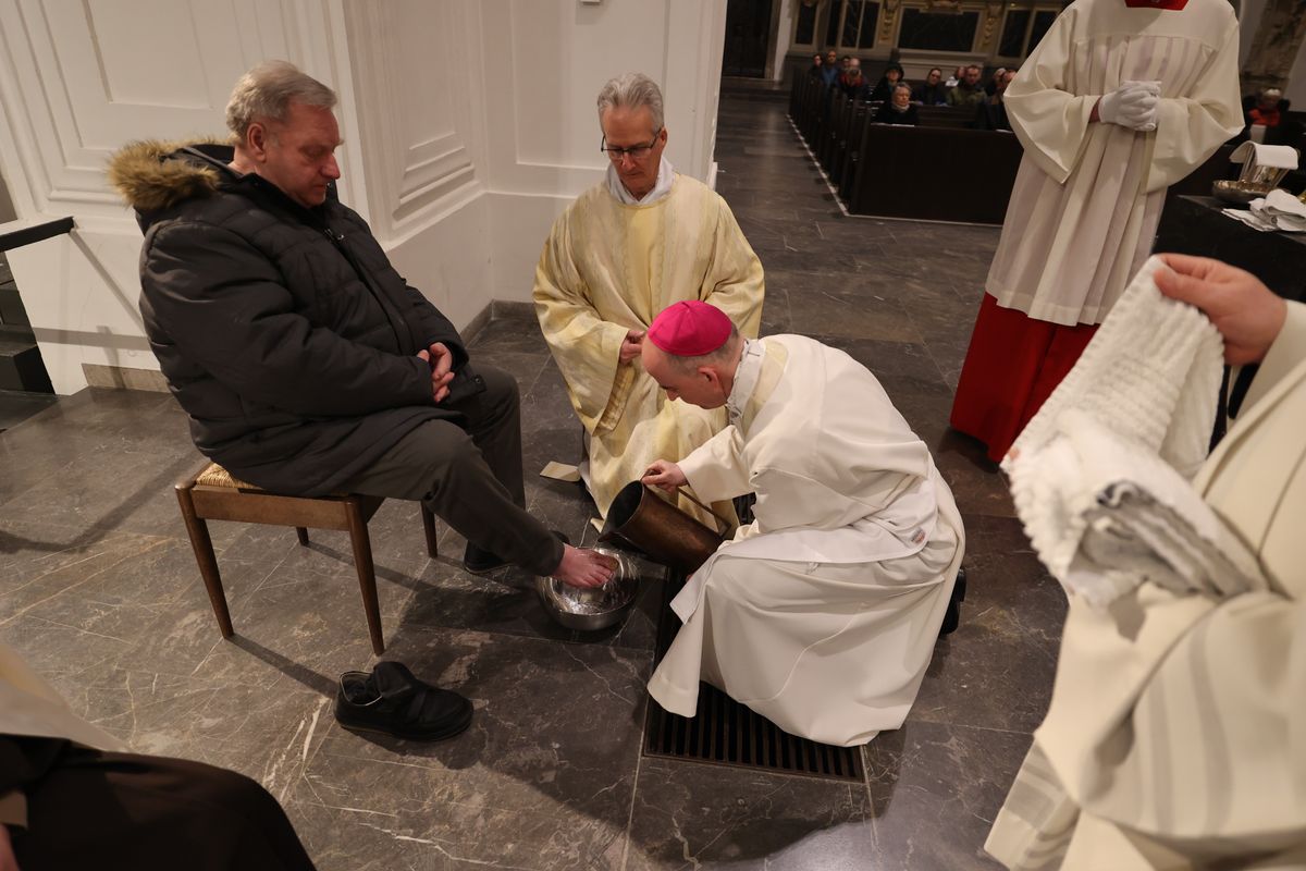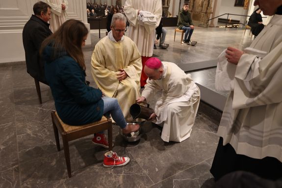In Erinnerung an die Fußwaschung im Abendmahlssaal wusch der Bischof Vertretern von Diözesanrat, Dompfarrei, Flüchtlingen, Passionsspielern aus Sömmersdorf, Menschen mit einer Behinderung und Ordensleuten – Männern wie Frauen – die Füße.