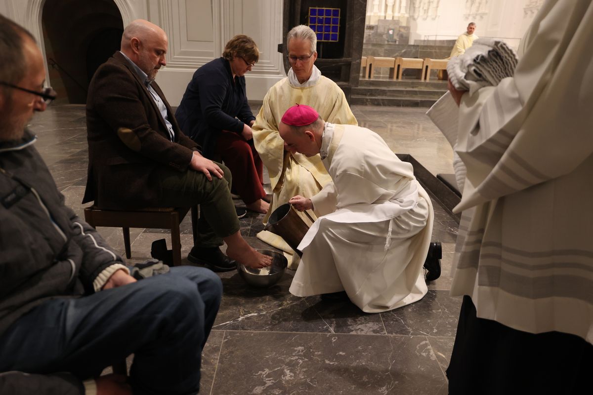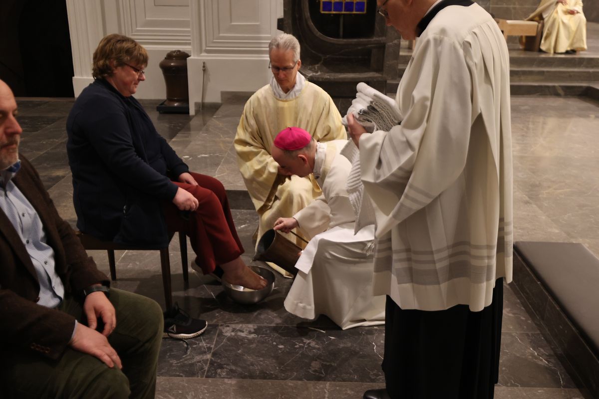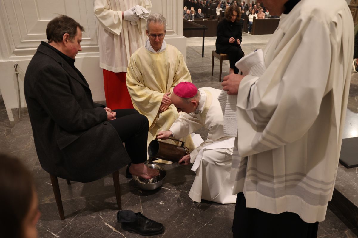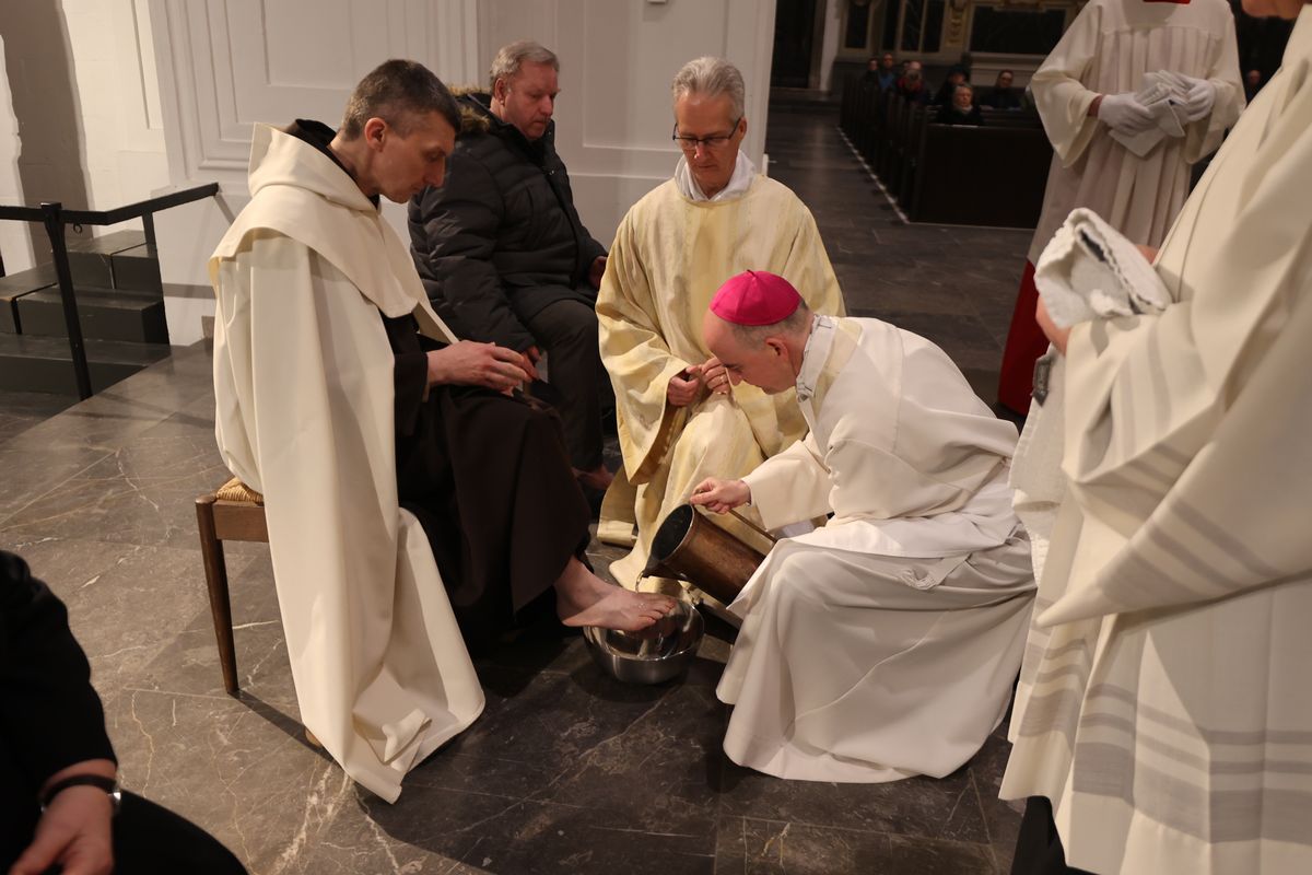 In Erinnerung an die Fußwaschung im Abendmahlssaal wusch der Bischof Vertretern von Diözesanrat, Dompfarrei, Flüchtlingen, Passionsspielern aus Sömmersdorf, Menschen mit einer Behinderung und Ordensleuten – Männern wie Frauen – die Füße.