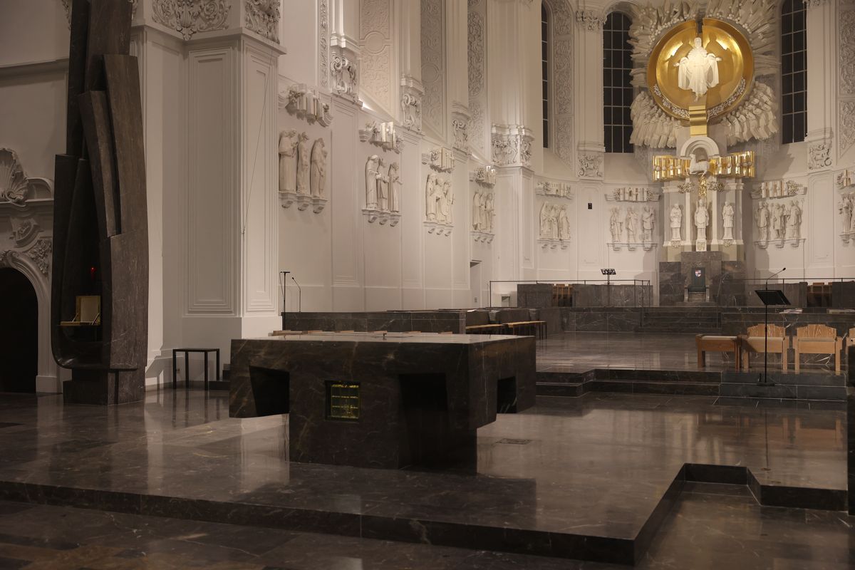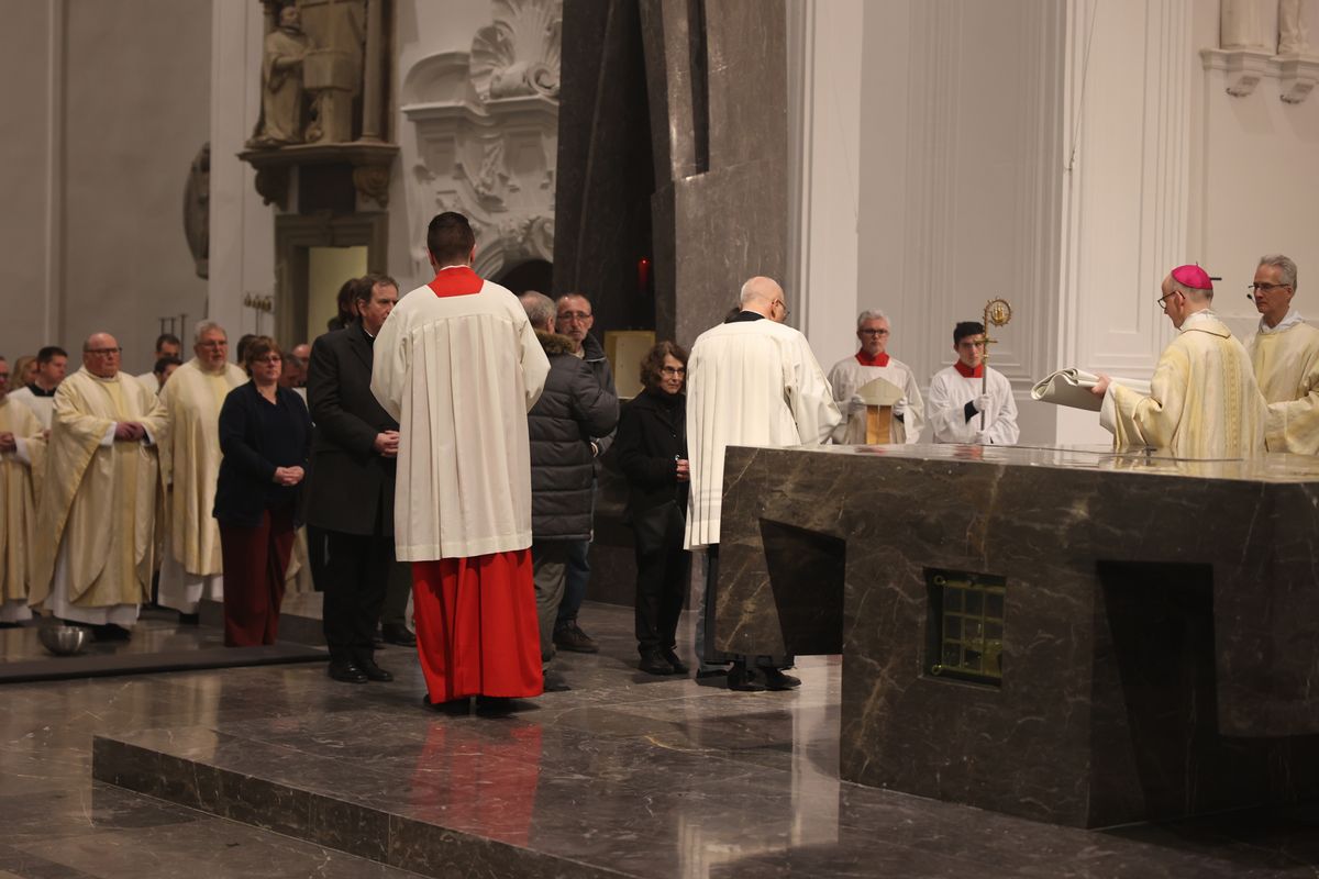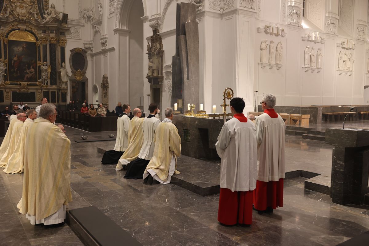 Am Ende der Messe übertrugen Bischof Jung und Mitglieder des Domkapitels das Allerheiligste in die Schönbornkapelle. Schmuck, Kerzen und Decken wurden vom Altar entfernt. Der Tabernakel blieb offen und leer.