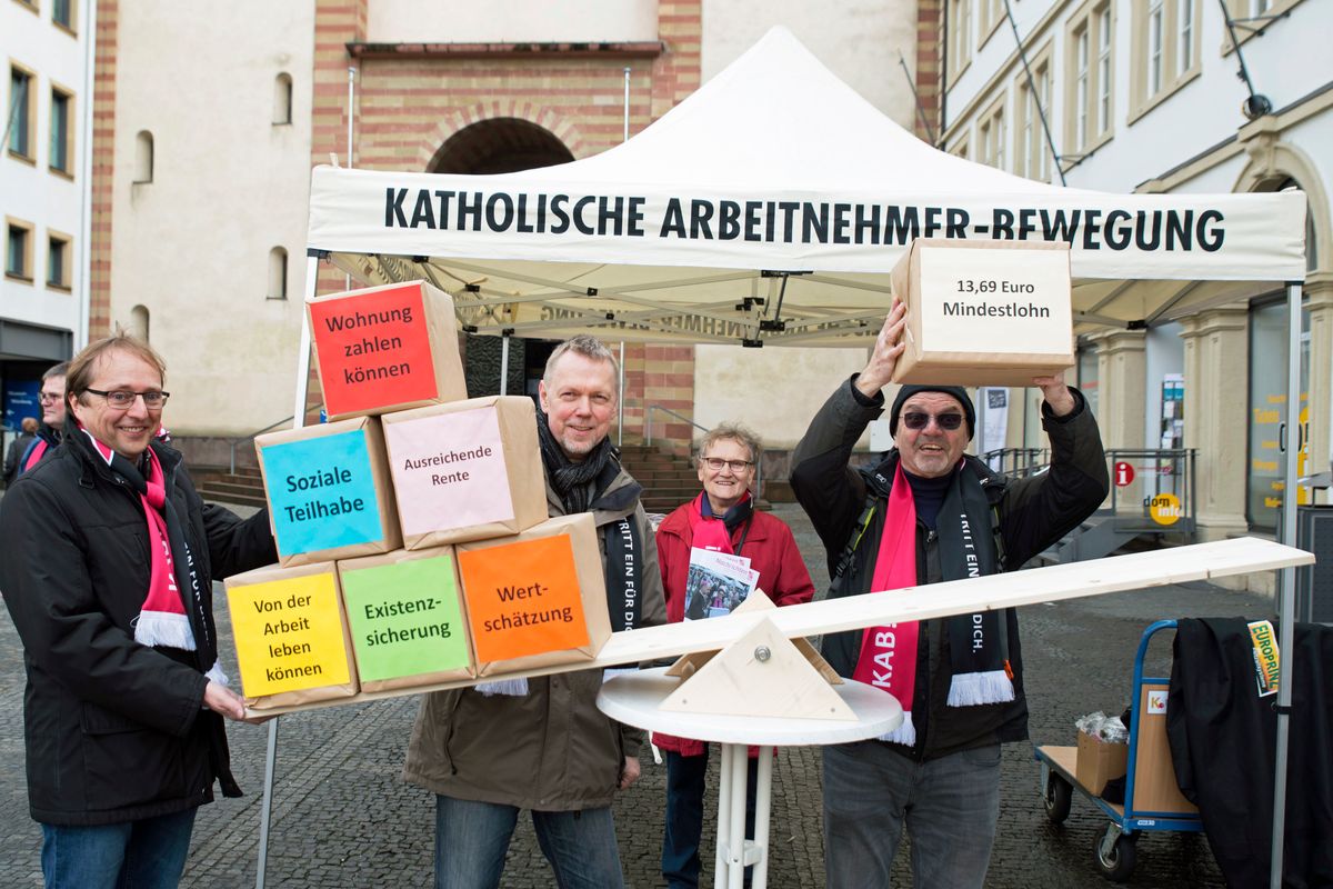 Würzburg (POW) Die „Gerechtigkeits-Waage“ hat der Diözesanverband Würzburg der Katholischen Arbeitnehmer-Bewegung (KAB) am Samstag, 29. Februar, auf dem Vorplatz des Würzburger Kiliansdoms vorgestellt. „Es gibt gewichtige Gründe, den derzeitigen Mindestlohn von 9,35 Euro anzuheben“, schreibt der Verband in einer Pressemitteilung. Die KAB fordert, den gesetzlichen Mindestlohn auf 13,69 Euro anzuheben.