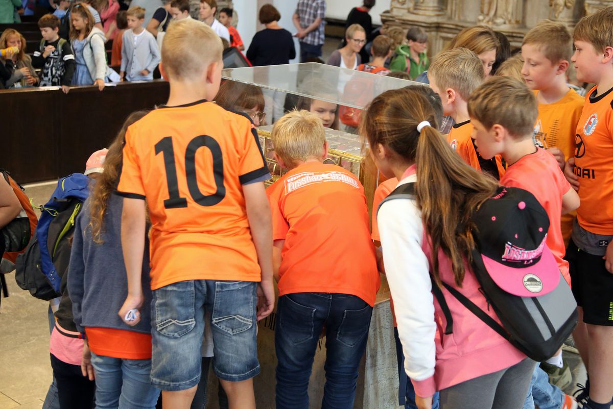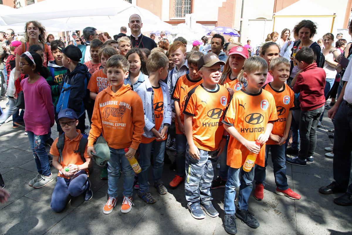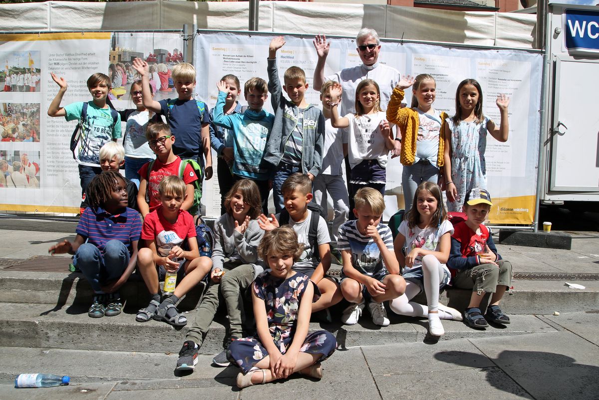 Auf dem Kiliansplatz wartet schon eine Stärkung – Bananen, Brezeln und viele Wasserflaschen. „Es war schön, dass Kinder vorgekommen sind und die Geschichte von David und Goliath erzählt haben“, finden die Kommunionkinder aus der Pfarreiengemeinschaft „Sankt Maria und Johannes der Täufer, Johannesberg“ (Dekanat Aschaffenburg-West). „Wir konnten alle Lieder mitsingen!“, rufen die Kinder aus der Pfarreiengemeinschaft „Sankt Laurentius am Spessart, Marktheidenfeld“. Auch von den Häuptern der Frankenapostel sind die Kinder beeindruckt, und vom Dom. „Die Kirche ist so groß, es hat so viel Platz. Und die vielen Bilder und Figuren“, sagt ein Junge. Die Geschichte von David und Goliath hat die Kommunionkinder aus der Pfarrei Sankt Peter und Paul in Kleinwallstadt (Dekanat Obernburg) beeindruckt. „Der David hat sich alleine gegen einen viel Größeren durchgesetzt. Ich finde es gut, dass er seinen eigenen Weg gegangen ist“, sagt ein Junge.