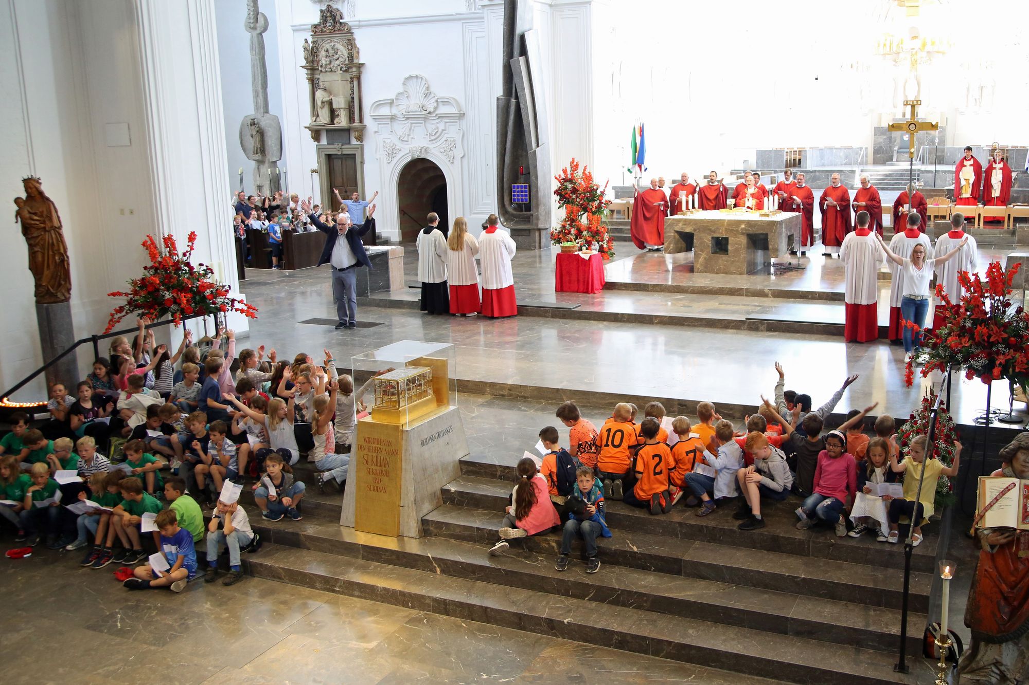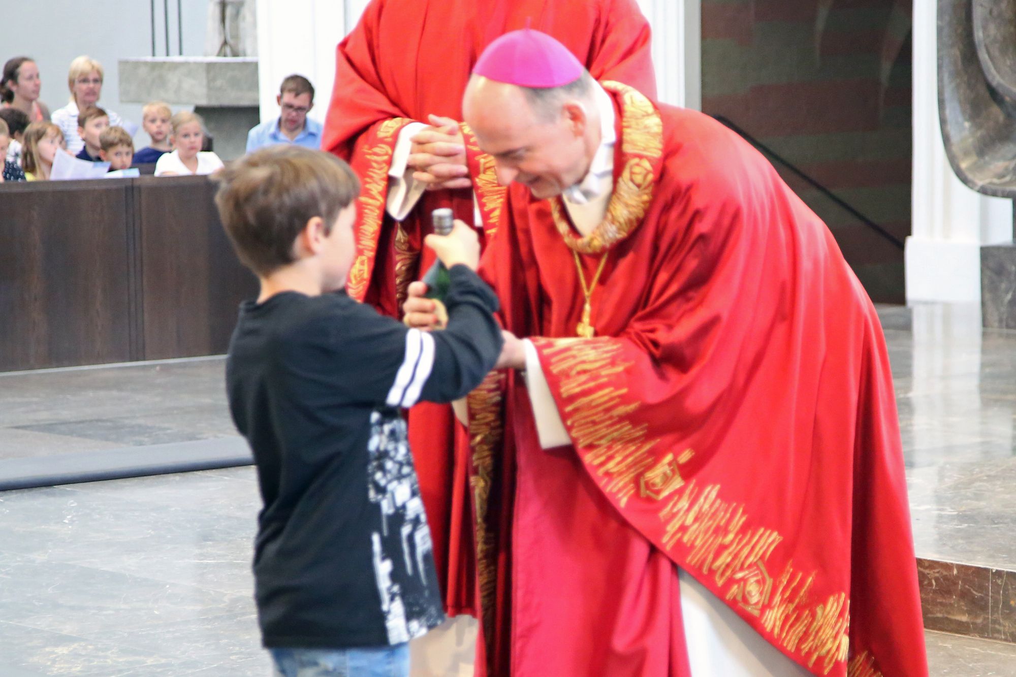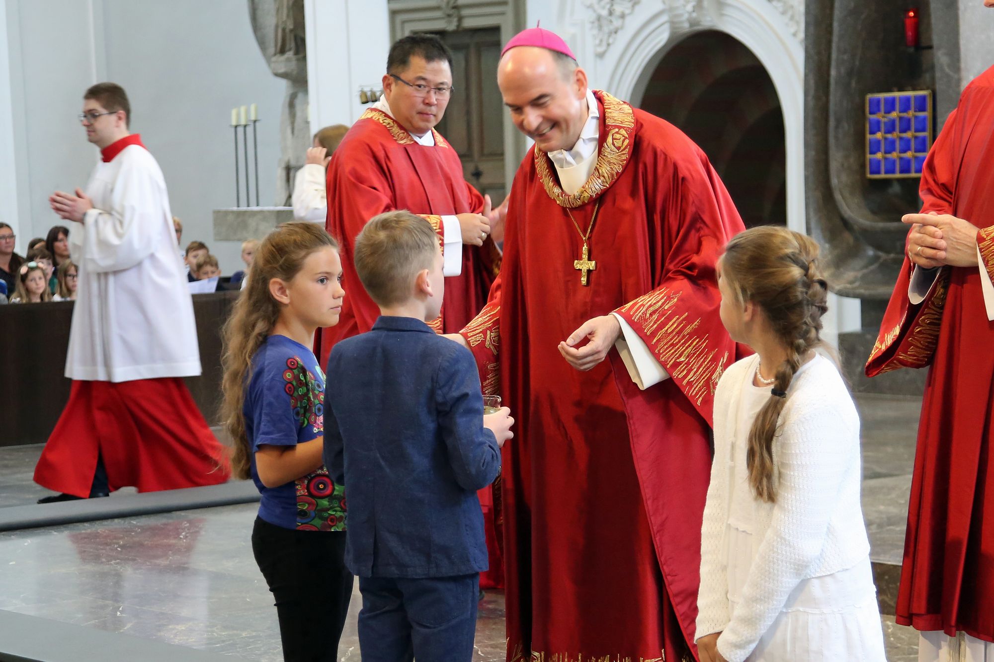 Dem David habe Gott Kraft und Mut gegeben, nicht die Rüstung oder das Schwert. David habe gesagt, er brauche das alles nicht, seine Stärke sei der Herr und seine Kraft der Glaube an Gott. „In diesem Glauben hat er den Goliath besiegt. Der große Goliath ist einfach umgefallen.“ Fünf Steine habe David für den Kampf gegen Goliath gesammelt. Diese Steine stünden für Tapferkeit, Mut, Glaube, Selbstbewusstsein und den Segen Gottes für den Tüchtigen, findet der Bischof gemeinsam mit den Kindern heraus. „Ihr könnt jetzt überlegen: Was sind die fünf Steine, die ich brauche, damit ich keine Angst habe vor den Riesen in meinem Leben? Freuen wir uns über die fünf Steine, und überlegt gut, was Ihr braucht für Eure Reise, um den Kampf mit dem Riesen aufnehmen und gewinnen zu können.“ Beim Schlusslied „Gottes Liebe ist so wunderbar“ recken alle die Arme weit in alle Richtungen, um zu zeigen, wie hoch, tief und weit Gottes Güte ist. Nach dem Schlusssegen applaudieren die Kinder und ihre Begleiter laut und lange.