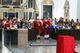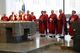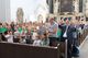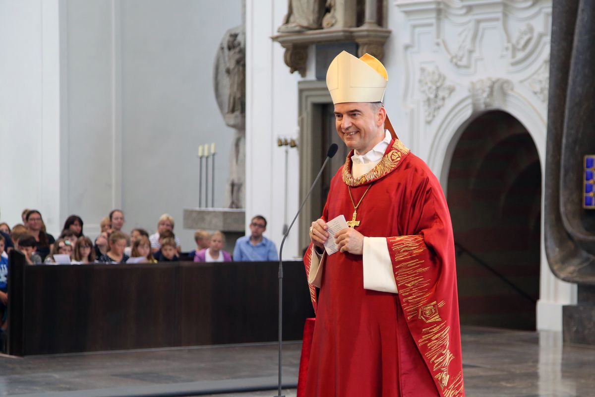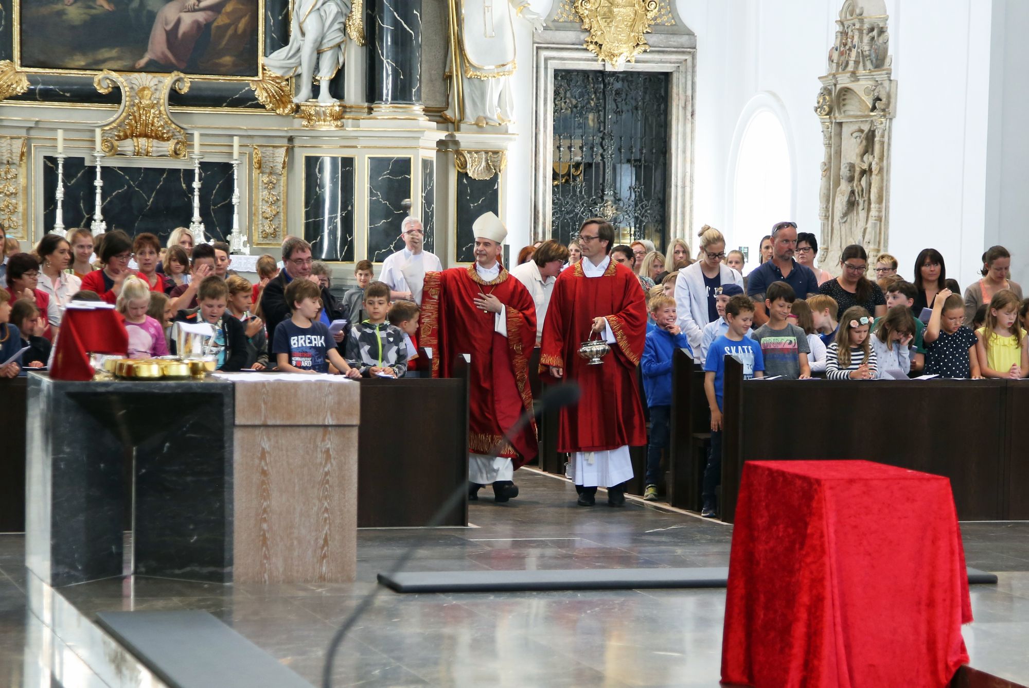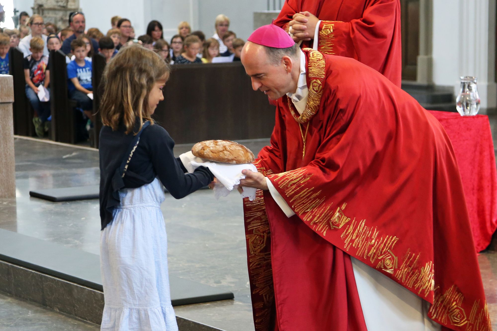 Dem David habe Gott Kraft und Mut gegeben, nicht die Rüstung oder das Schwert. David habe gesagt, er brauche das alles nicht, seine Stärke sei der Herr und seine Kraft der Glaube an Gott. „In diesem Glauben hat er den Goliath besiegt. Der große Goliath ist einfach umgefallen.“ Fünf Steine habe David für den Kampf gegen Goliath gesammelt. Diese Steine stünden für Tapferkeit, Mut, Glaube, Selbstbewusstsein und den Segen Gottes für den Tüchtigen, findet der Bischof gemeinsam mit den Kindern heraus. „Ihr könnt jetzt überlegen: Was sind die fünf Steine, die ich brauche, damit ich keine Angst habe vor den Riesen in meinem Leben? Freuen wir uns über die fünf Steine, und überlegt gut, was Ihr braucht für Eure Reise, um den Kampf mit dem Riesen aufnehmen und gewinnen zu können.“ Beim Schlusslied „Gottes Liebe ist so wunderbar“ recken alle die Arme weit in alle Richtungen, um zu zeigen, wie hoch, tief und weit Gottes Güte ist. Nach dem Schlusssegen applaudieren die Kinder und ihre Begleiter laut und lange.