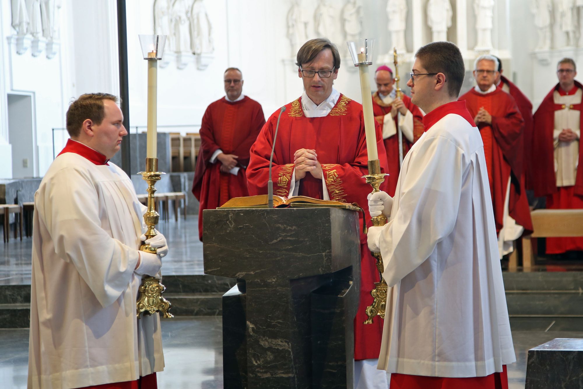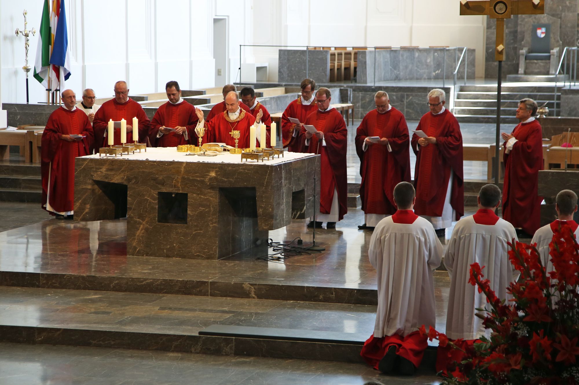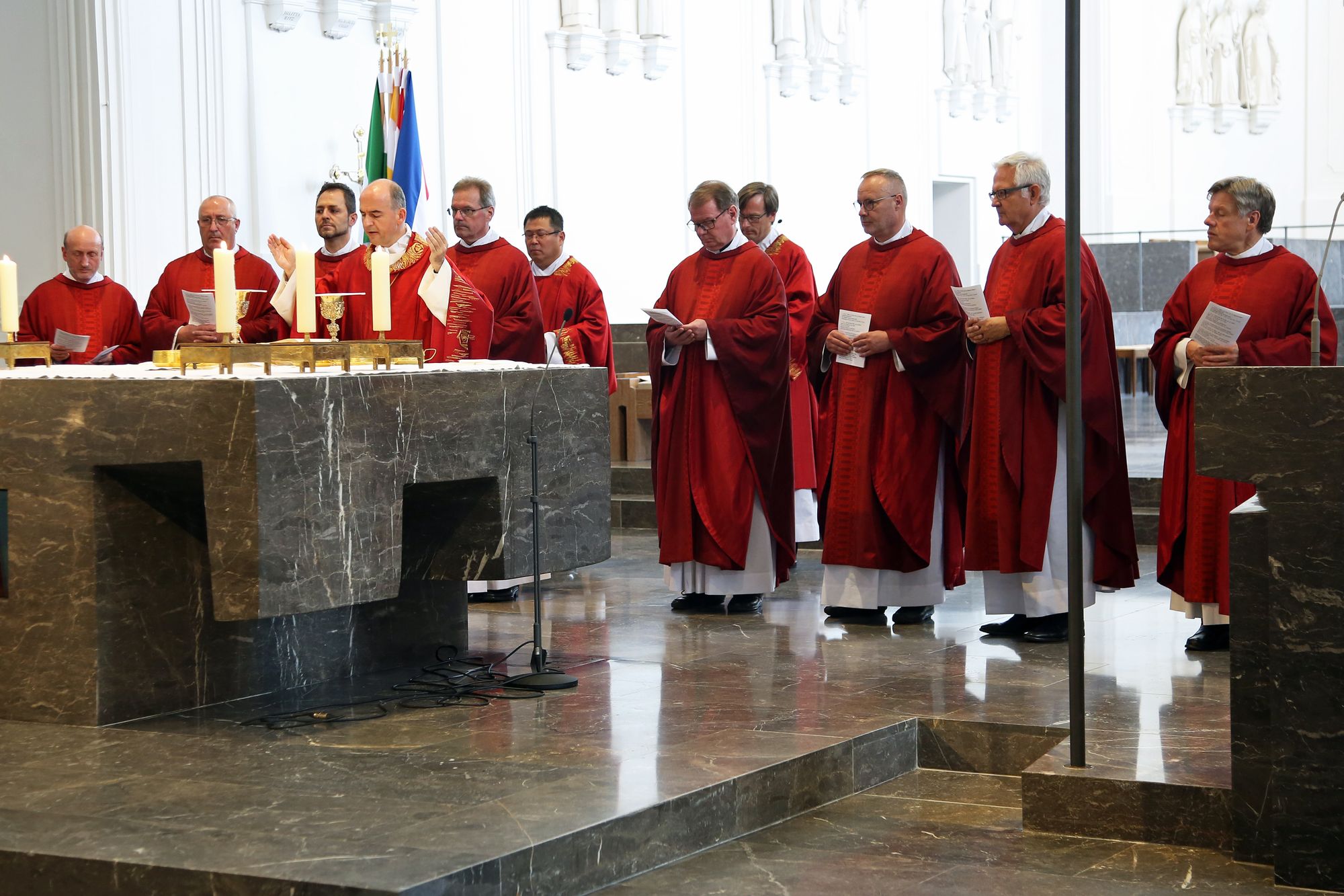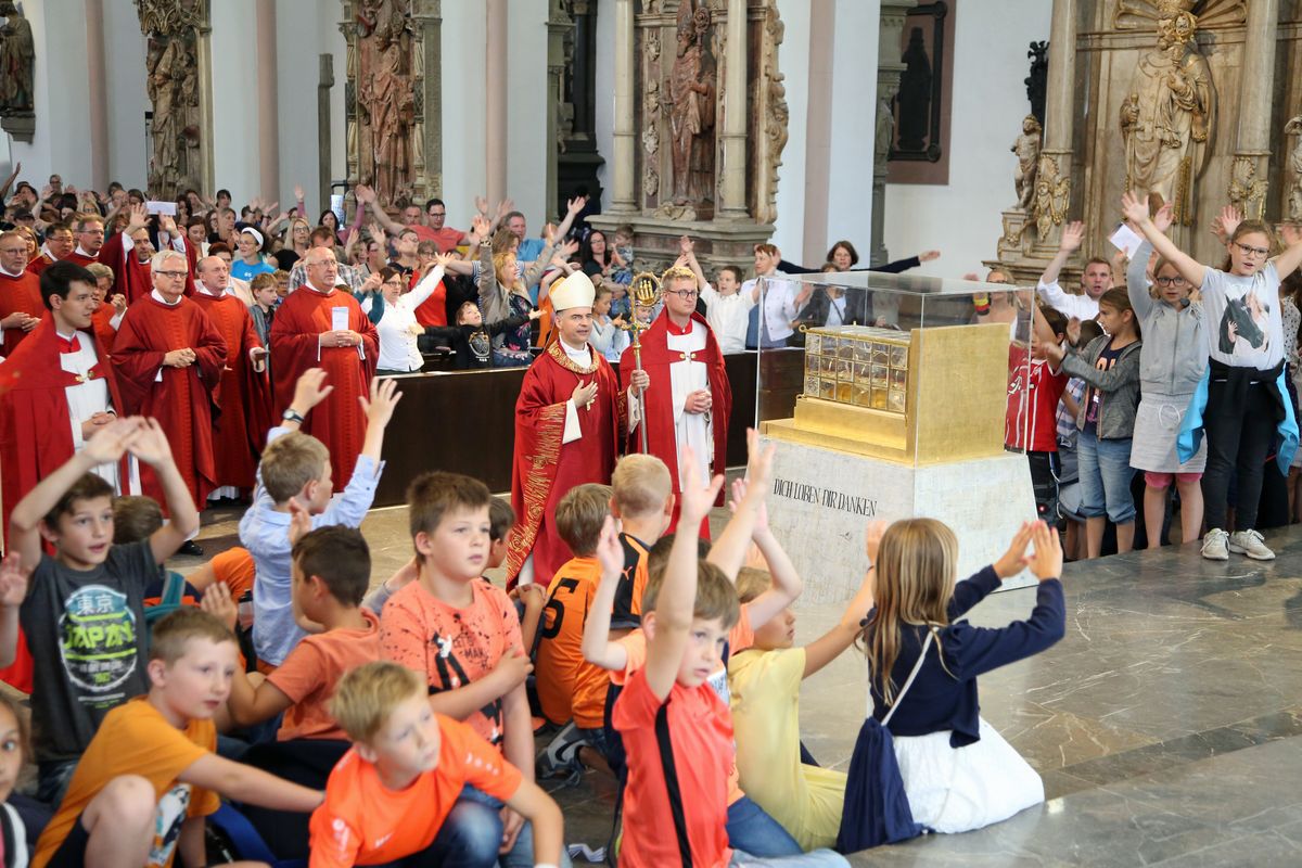 Würzburg (POW) „Ich freue mich sehr, dass wir heute gemeinsam diesen Gottesdienst feiern“, ruft Bischof Dr. Franz Jung am Montagvormittag, 8. Juli, den rund 800 Kommunionkindern mit ihren Begleitern im Würzburger Kiliansdom zu. „In dieser Woche erinnern wir uns daran, wie einmal alles begonnen hat mit Kilian, Kolonat und Totnan, die den Glauben in Unterfranken verkündet haben.“ Die Kinder kommen aus den Dekanaten Alzenau, Aschaffenburg-Ost, -Stadt und -West, Karlstadt, Lohr, Miltenberg und Obernburg. Sie alle haben im Jahr 2019 ihre Erstkommunion gefeiert.