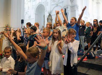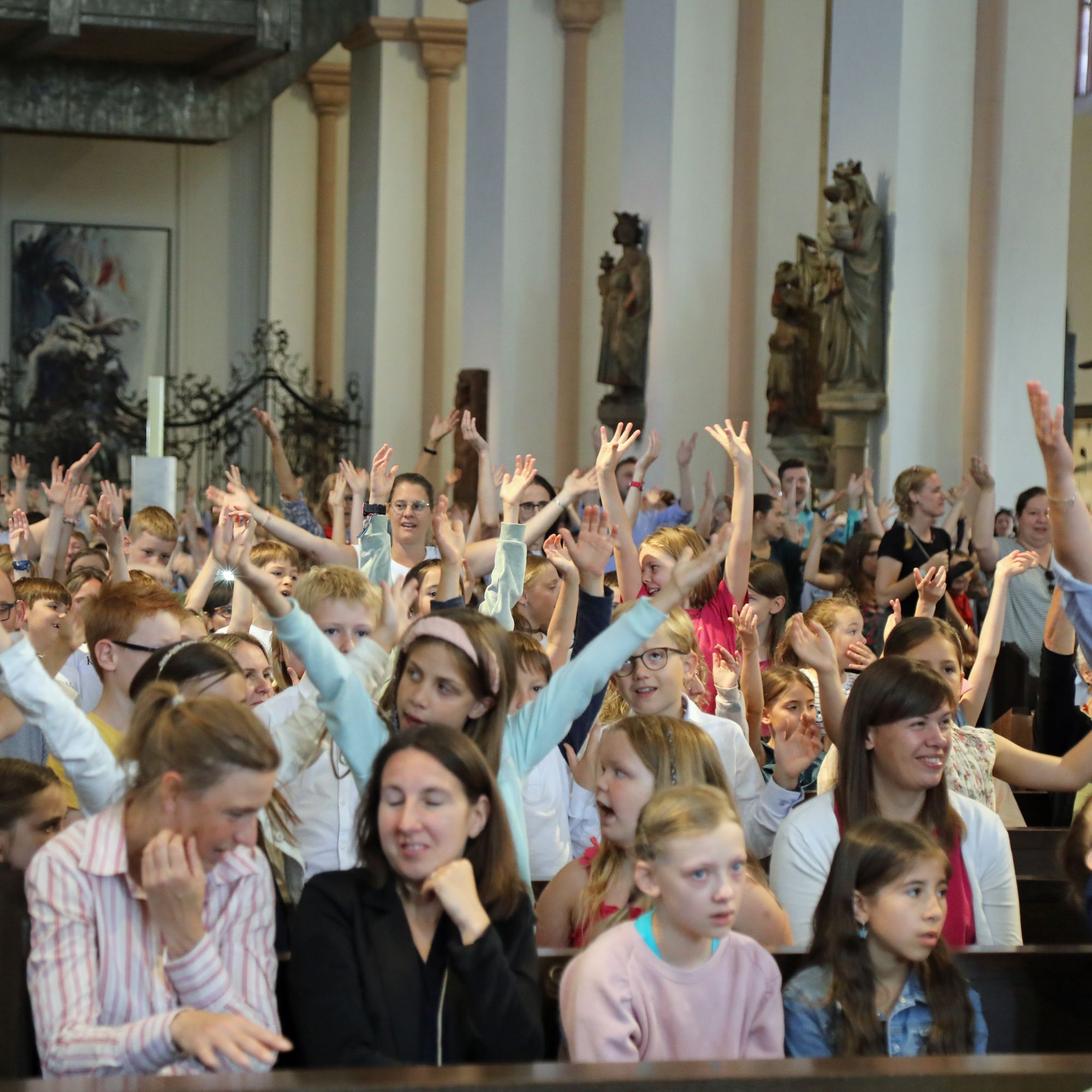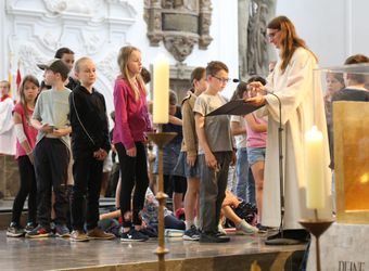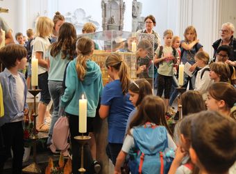 Lichtquellen im Dom finden? Für die Kinder kein Problem. Mit rund 1300 Kommunionkindern und ihren Begleitern hat Weihbischof Paul Reder am Montag, 8. Juli, einen Gottesdienst im Kiliansdom gefeiert.