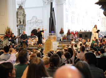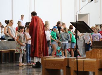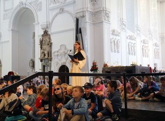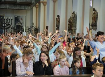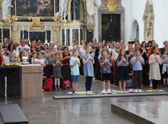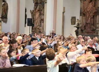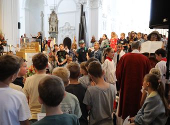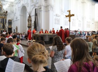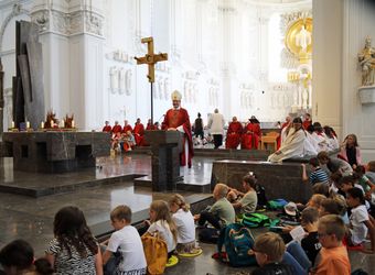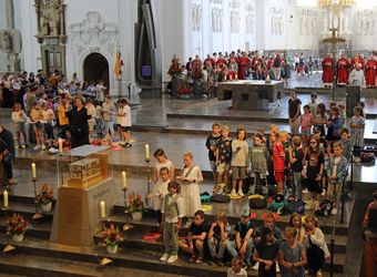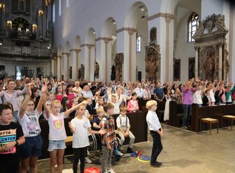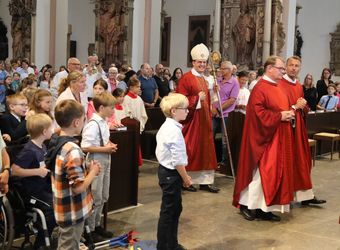Mit rund 1300 Kommunionkindern und ihren Begleitern hat Weihbischof Paul Reder am Montag, 8. Juli, einen Gottesdienst im Kiliansdom gefeiert. Auch die Kinder beteiligten sich an der Gestaltung des Gottesdienstes.