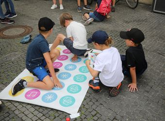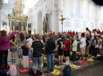 Mit rund 1300 Kommunionkindern und ihren Begleitern hat Weihbischof Paul Reder am Montag, 8. Juli, einen Gottesdienst im Kiliansdom gefeiert. nach dem Gottesdienst gab es Angebote für Spiele und Aktionen, beispielsweise auf dem Domvorplatz.