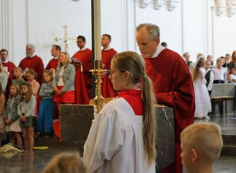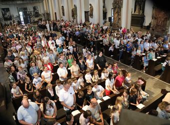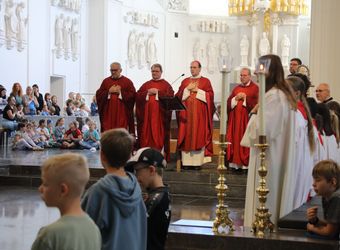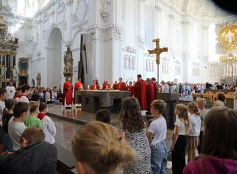 Mit rund 1300 Kommunionkindern und ihren Begleitern hat Weihbischof Paul Reder am Montag, 8. Juli, einen Gottesdienst im Kiliansdom gefeiert. Der Dom war so voll, dass die Kinder auf den Stufen zum Altar und sogar im Hochchor saßen.