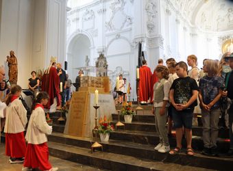 Mit rund 1300 Kommunionkindern und ihren Begleitern hat Weihbischof Paul Reder am Montag, 8. Juli, einen Gottesdienst im Kiliansdom gefeiert. Immer wieder ein besonderes Erlebnis: den Schrein mit den Häuptern der Frankenapostel einmal aus der Nähe sehen.