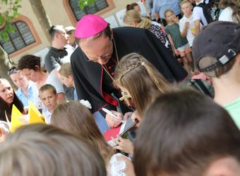 Mit rund 1300 Kommunionkindern und ihren Begleitern hat Weihbischof Paul Reder am Montag, 8. Juli, einen Gottesdienst im Kiliansdom gefeiert. Nach dem Gottesdienst beantwortete er auf dem Kiliansplatz die Fragen der Kinder und gab Autogramme.