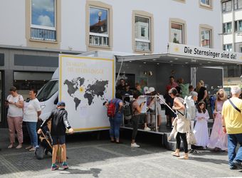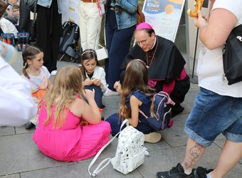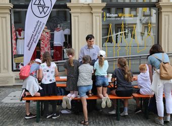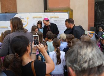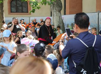 Nach dem Gottesdienst stärken sich die Kinder auf dem Kiliansplatz mit Wasser und Schorlen, Brezeln und Bananen. Manche Gruppen nehmen am vielfältigen Programm teil. Angeboten werden unter anderem eine Domerkundung, ein Actionbound auf den Spuren des heiligen Kilian oder Spiele bei den Erlöserschwestern. Auf dem Domvorplatz sind das Sternsingermobil und die Fachstelle Ministrant:innenarbeit des Bistums zu finden. Auf dem Kiliansplatz stellt sich Weihbischof Reder für Gruppenfotos mit den Kindern auf, gibt Autogramme und beantwortet die Fragen der Kinder. „Ich habe ihn gefragt, wie lange er arbeitet“, erzählt ein Mädchen. „Er hat gesagt, es ist unterschiedlich, manchmal bis sechs Uhr und manchmal bis sieben Uhr.“ „Es ist toll, dass wir da waren“, fasst ein Mädchen aus der Pfarrei Sankt Bartholomäus in Greußenheim (Landkreis Würzburg) spontan den Tag zusammen.