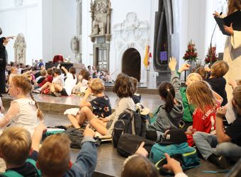 Um ein bisschen Ruhe in die aufgeregte Schar zu bringen, lädt der Weihbischof alle zu einem „Weg in die Stille“ ein. Auf einmal ist es mucksmäuschenstill, als alle konzentriert ihre Hände zuerst vor der Stirn falten und ihre Gedanken hinauf zu Gott schicken. Dann legen alle die Hände vor den Mund, um mit Gott zu sprechen, und schließlich vor das Herz, um es für Gott zu öffnen. Dann fordert Gemeindereferentin Monika Pickert vom Referat Verkündigung und Liturgie die Kinder auf, im Dom nach Lichtquellen zu suchen – im Nu deuten hunderte Hände auf Fenster, Kerzen und die Leuchter neben dem Schrein der Frankenapostel. Ein bisschen schwieriger wird es beim Licht im Tabernakel, das von den Bänken aus nur als winziger roter Punkt zu sehen ist. Als letztes gehen alle Hände in Richtung der beiden Leuchter, die beim Vorlesen des Evangeliums von den Sterndeutern von zwei Ministranten gehalten werden.