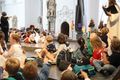 Würzburg (POW) „Einfach spitze, dass du da bist!“ schallt es durch den Dom. Die rund 1300 Kinder und ihre Begleiter, die am Montagvormittag, 8. Juli, zum Gottesdienst für Erstkommunionkinder nach Würzburg in den Kiliansdom gekommen sind, singen laut zur Musik der Projektband mit und schwenken im Takt die Arme. Die Stimmung ist prächtig – dabei hat die Feier noch gar nicht angefangen. Beim Einzug müssen sich ein vor Vorfreude strahlender Weihbischof Paul Reder, die Konzelebranten sowie Ministrantinnen und Ministranten erst einen Weg durch die vielen Kinder bahnen, die rings um den Schrein mit den Häuptern der Frankenapostel und bis in den Hochchor hinauf auf bunten Kissen auf dem Boden sitzen. „Herzlich willkommen hier im Kiliansdom! Es ist spitze, dass Ihr Euch auf den Weg gemacht habt!“, ruft der Weihbischof den Kindern zu.