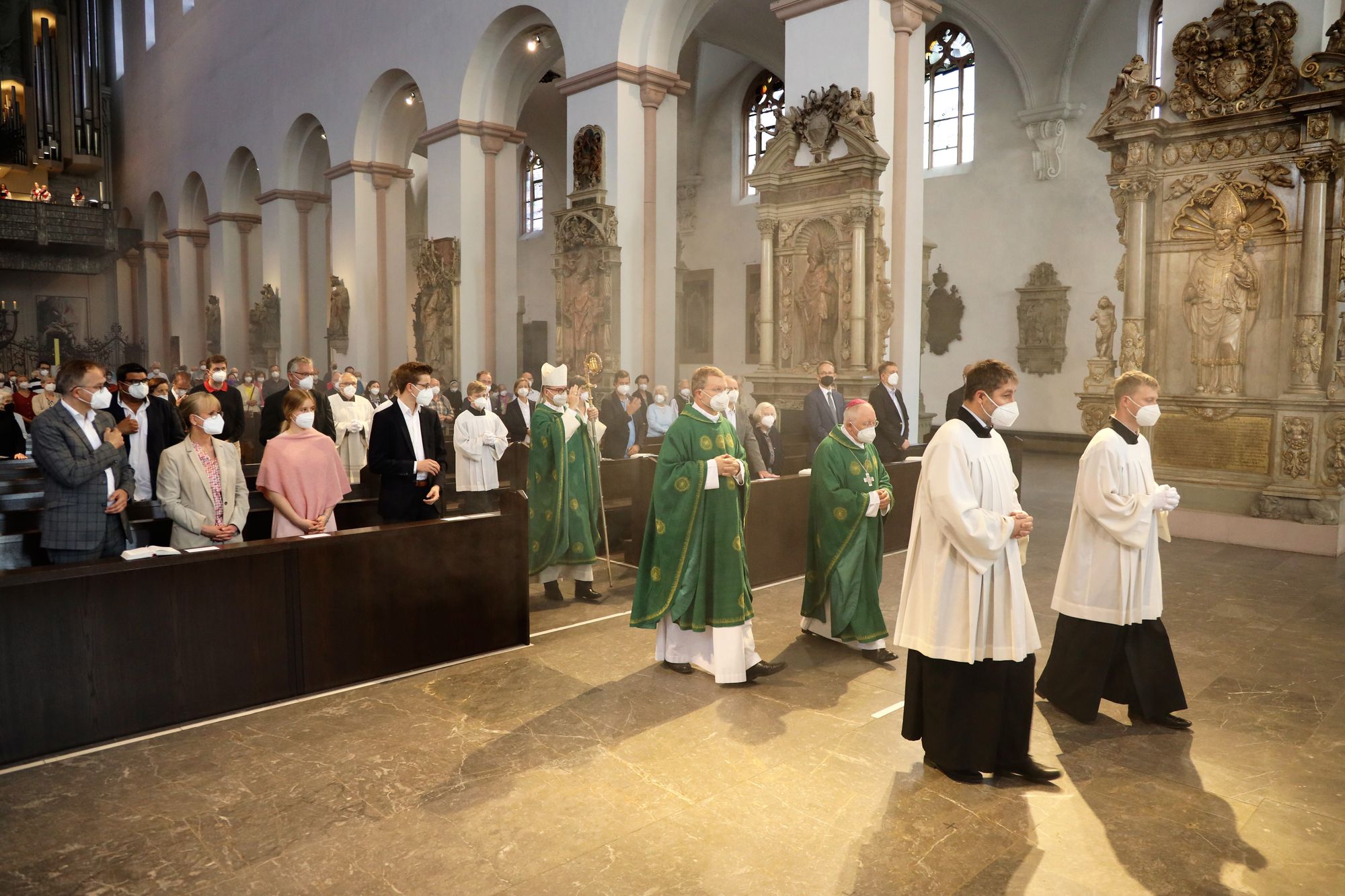 Würzburg (POW) Mit einem Dankgottesdienst im Würzburger Kiliansdom hat Bischof Dr. Franz Jung am Sonntag, 13. Juni, den dritten Jahrestag seiner Bischofsweihe begangen. Bei der Feier gedachte er zudem des vor knapp einem Jahr verstorbenen Speyerer Bischofs Dr. Anton Schlembach, der ihn zu seinem Generalvikar ernannt hatte. Zu den Mitfeiernden des Gottesdiensts unter den aktuellen Coronaschutzvorschriften gehörten unter anderem die Familie von Bischof Jung und der ehemalige Passauer Generalvikar und jetzige Altöttinger Wallfahrtsrektor Prälat Dr. Klaus Metzl, der Jung bei der Bischofsweihe am 10. Juni 2018 als assistierender Priester zur Seite gestanden hatte.